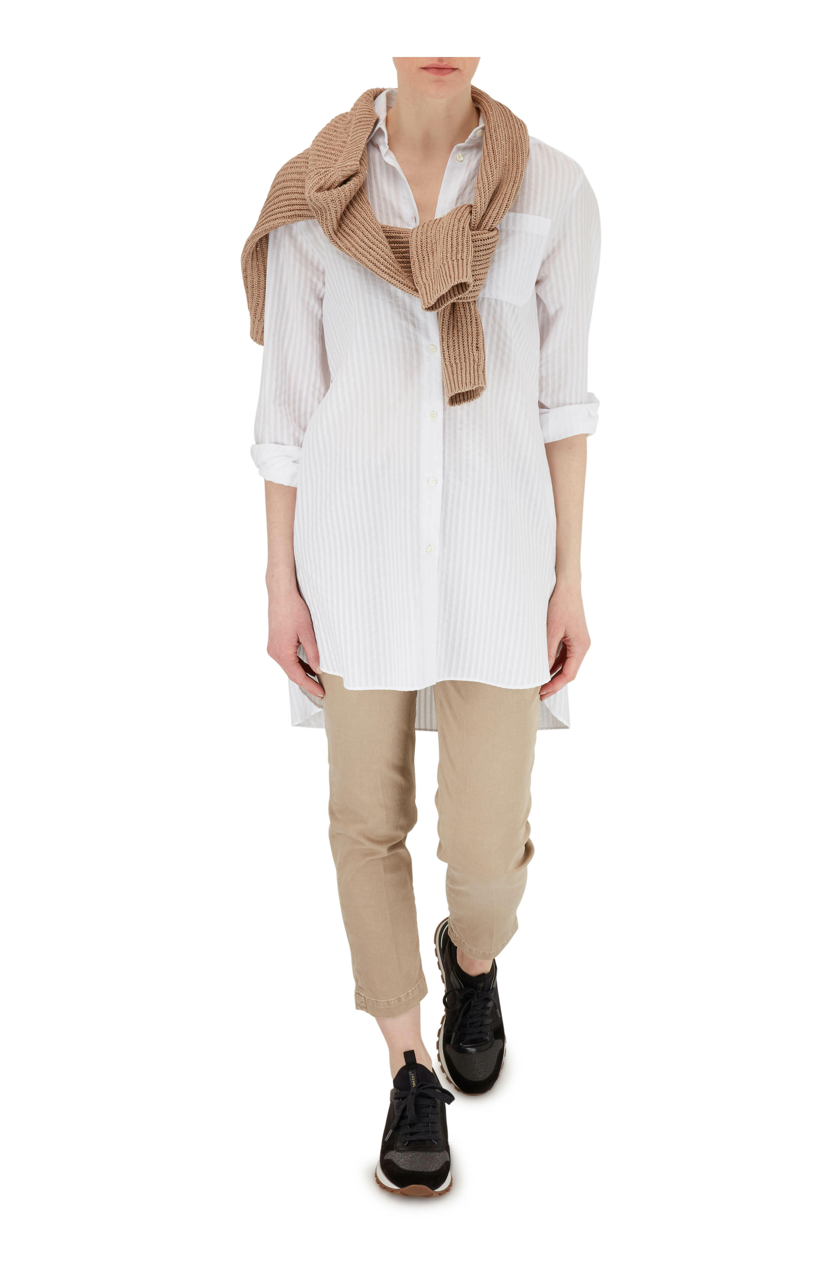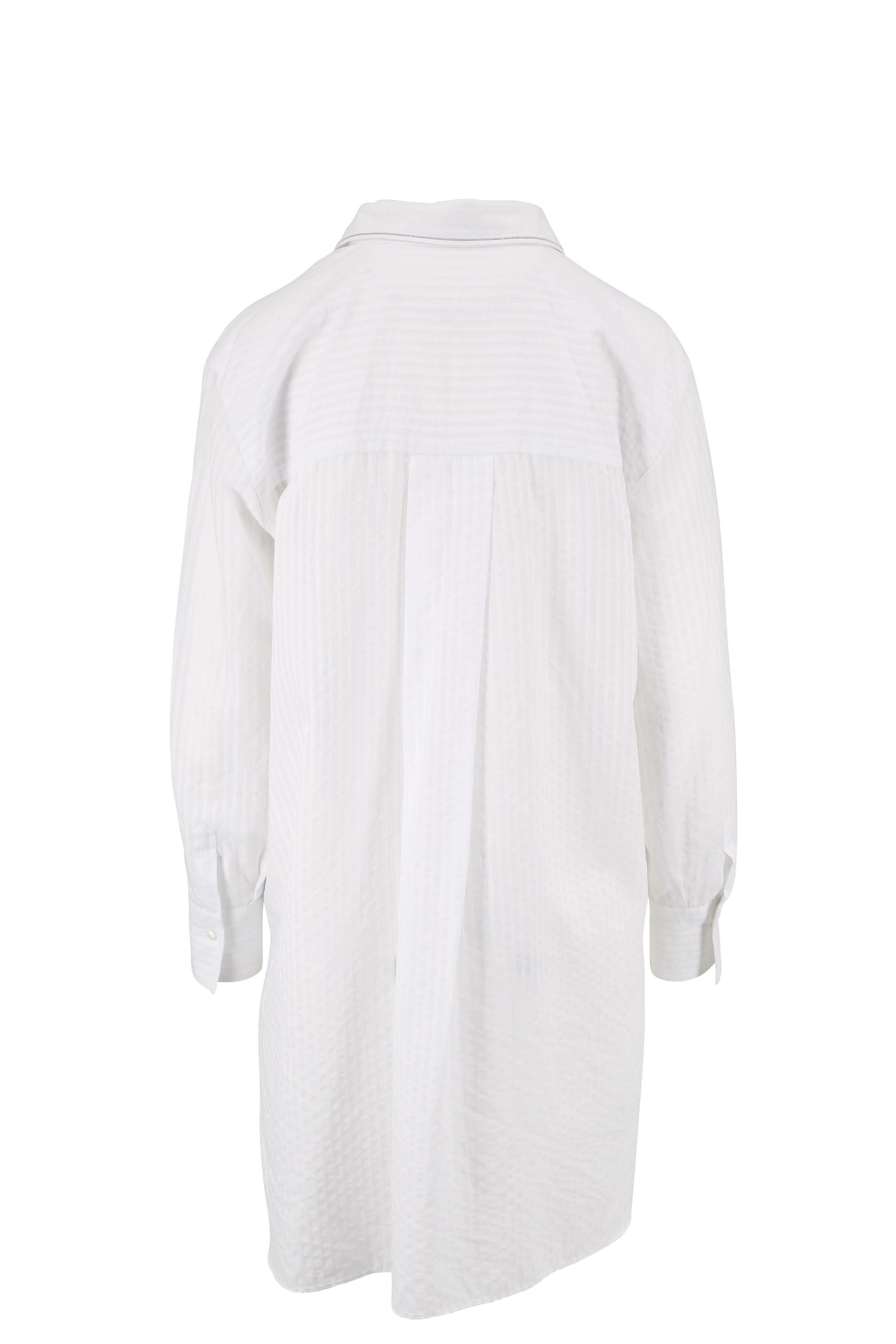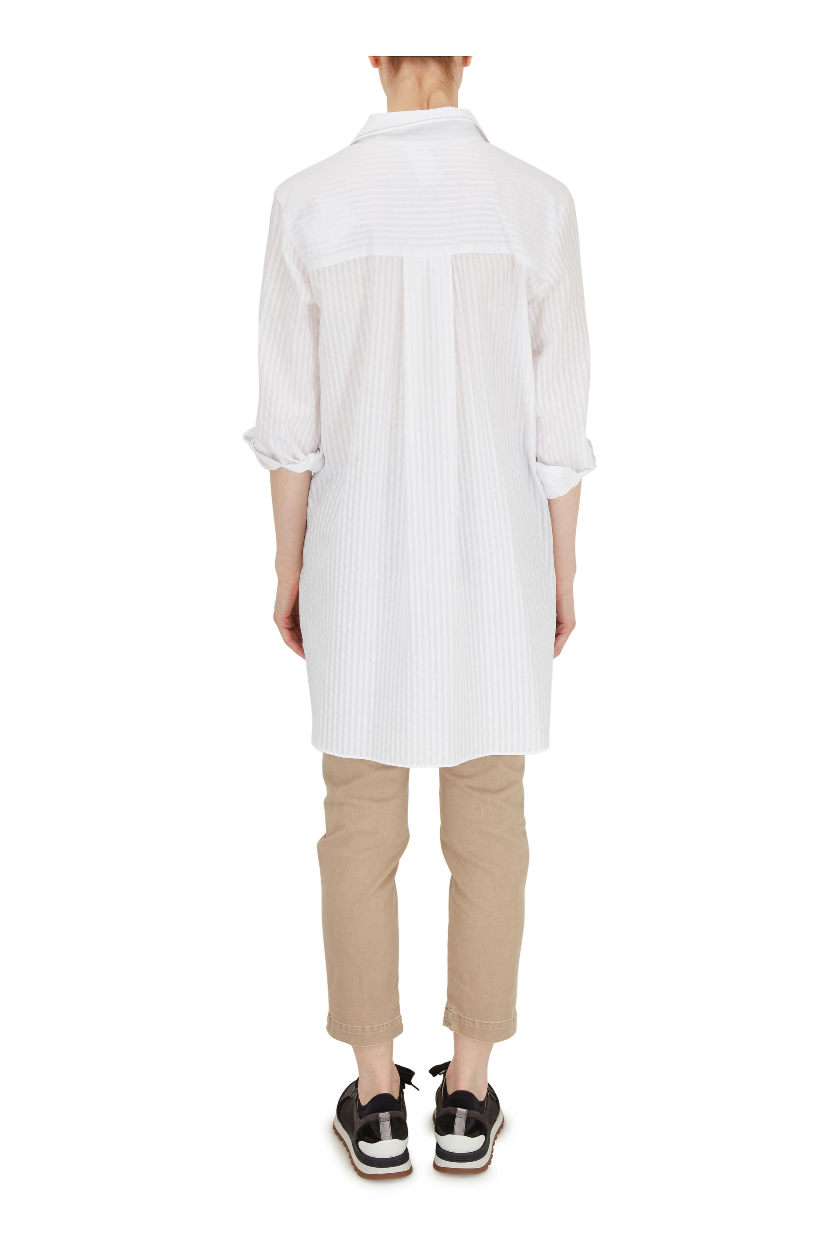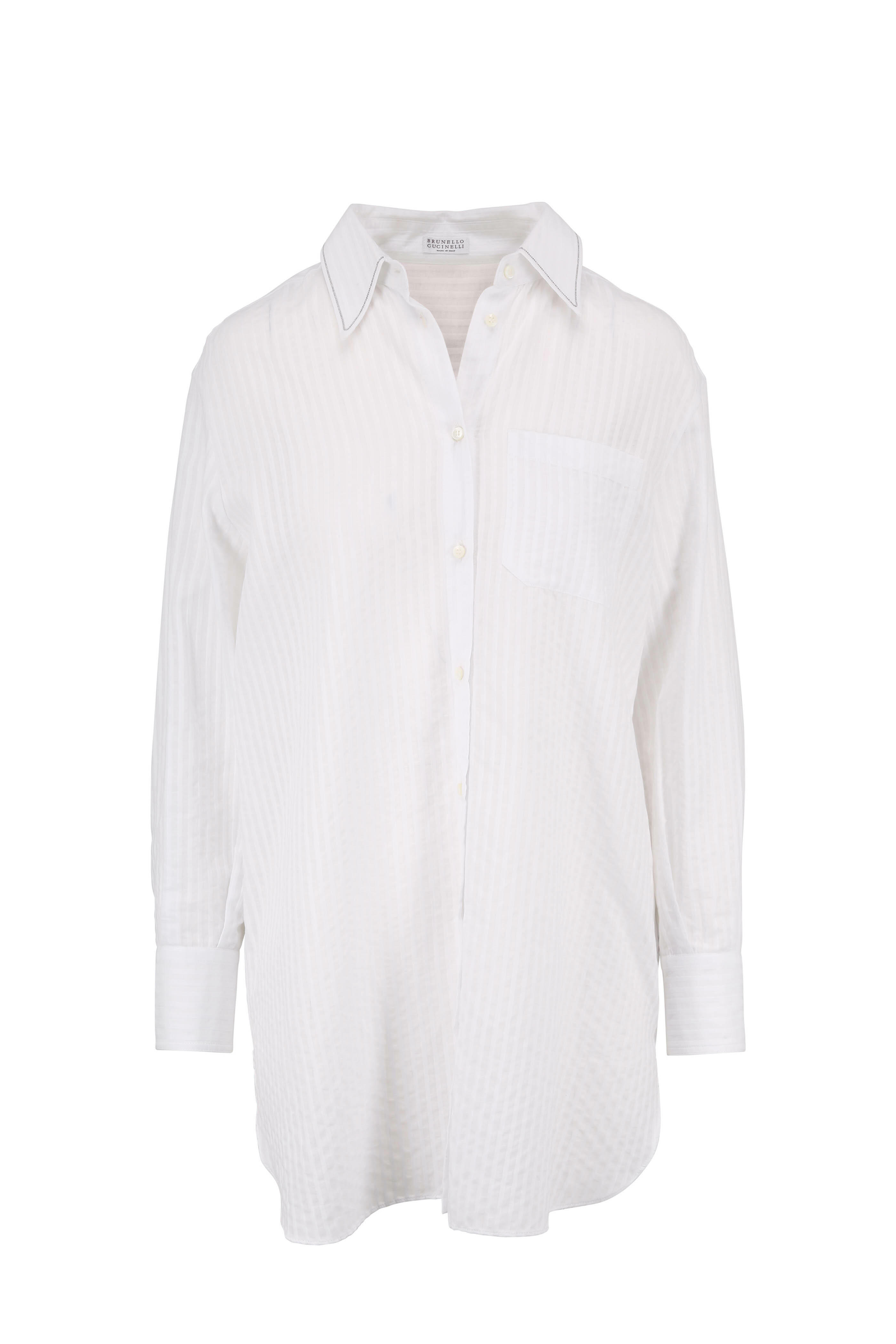 Spread collar. Button placket. Chest patch pocket. Single button square cuffs. Hi-low curved hem. Monili trim at collar. Made in Italy. 100% cotton. Machine wash.