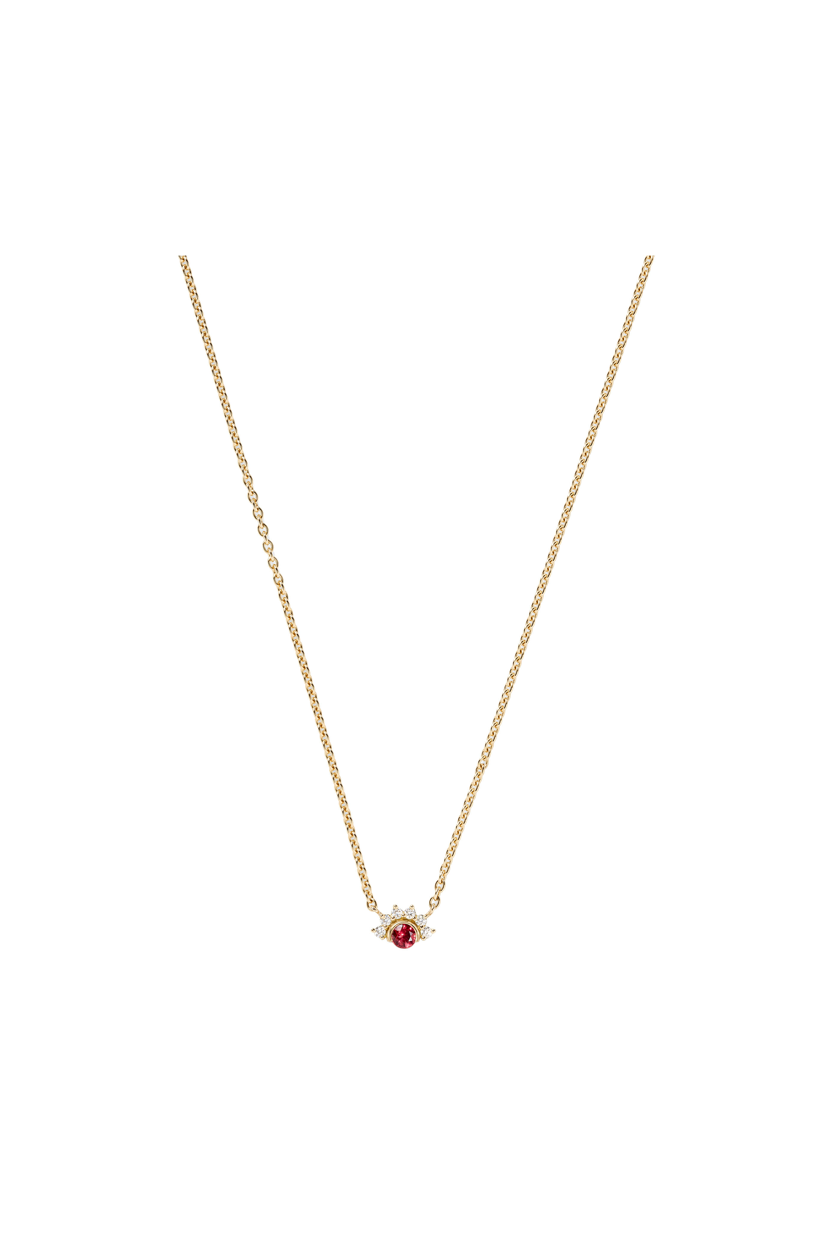 18k yellow gold. 0.09ct white diamond. .18ct red spinel.