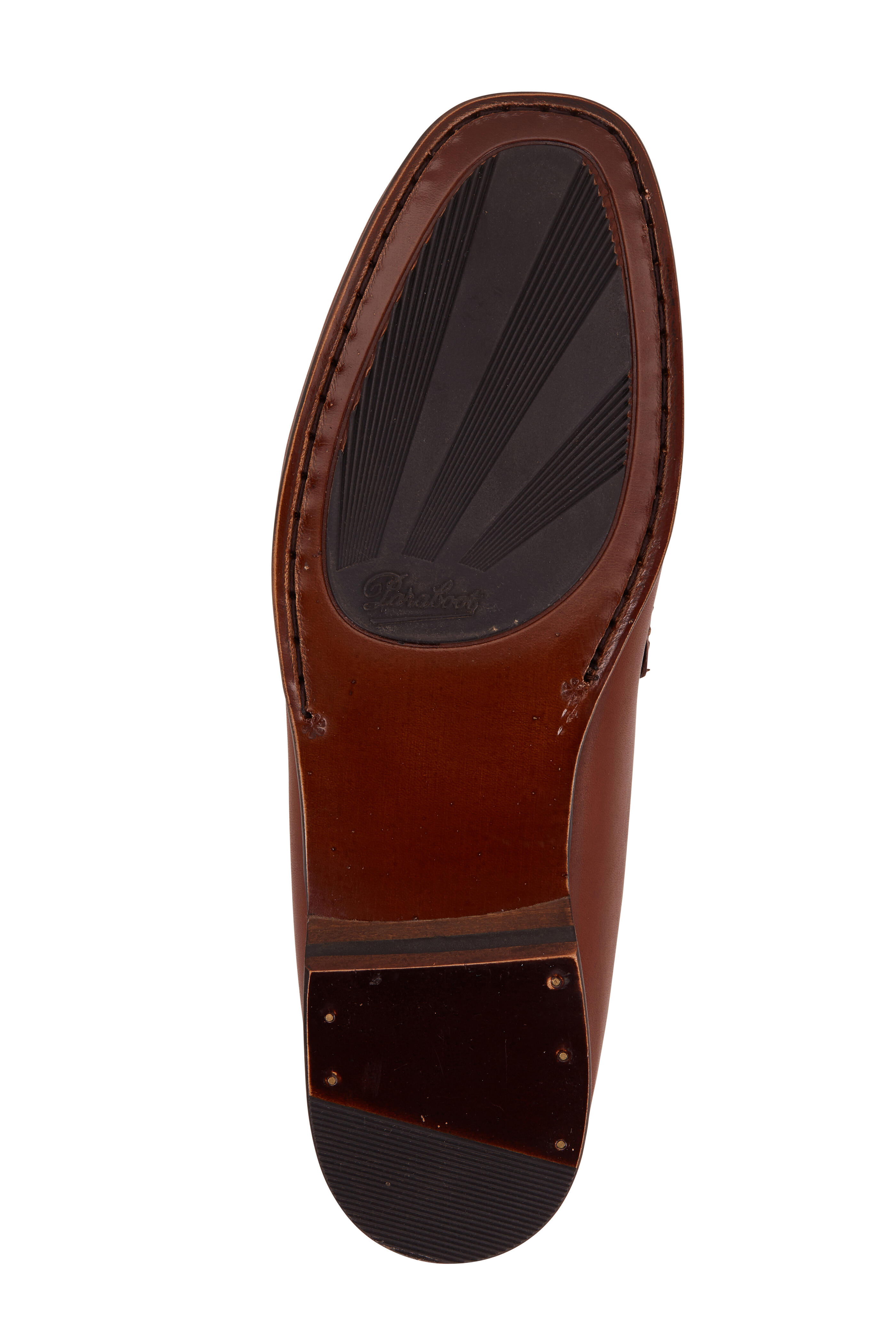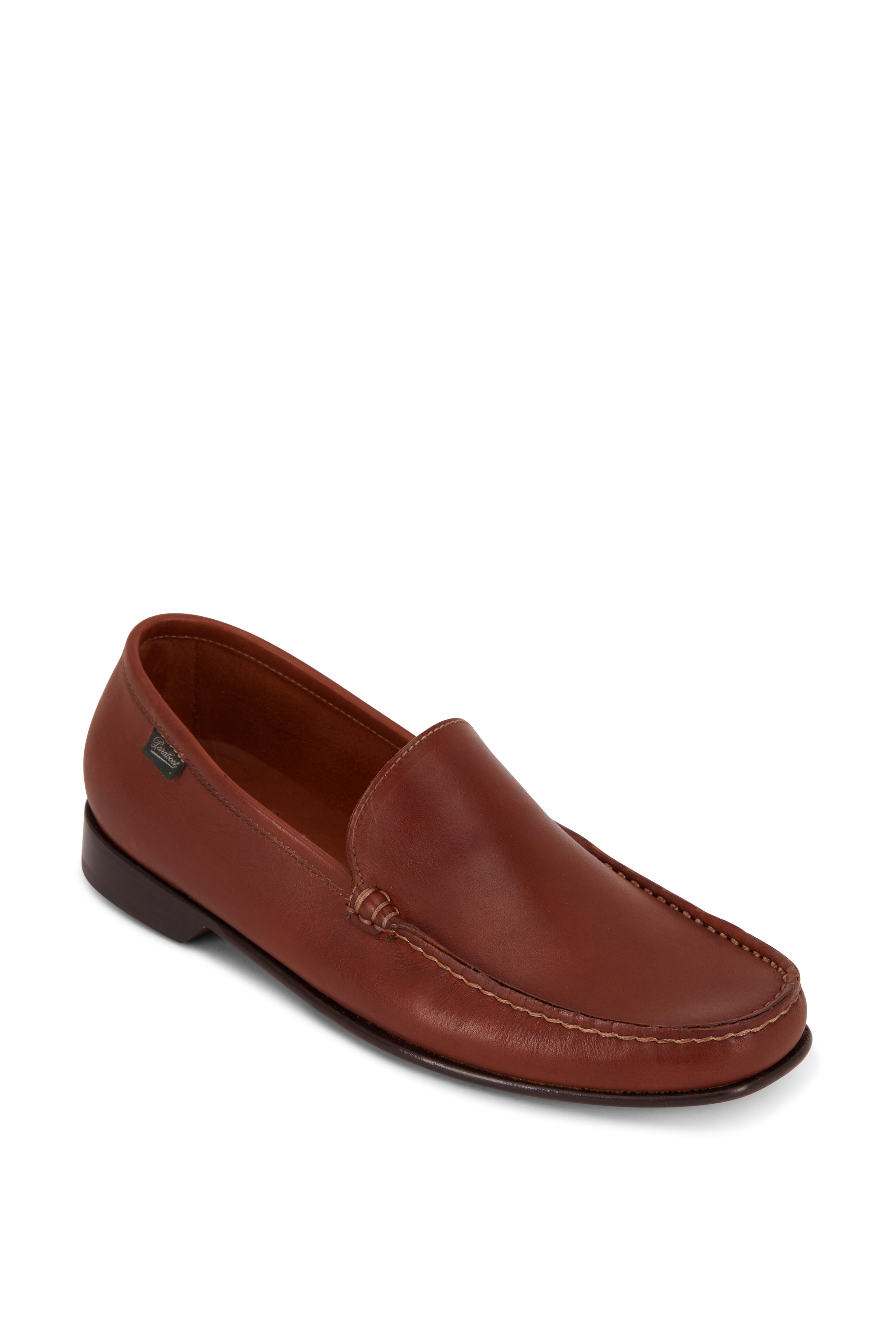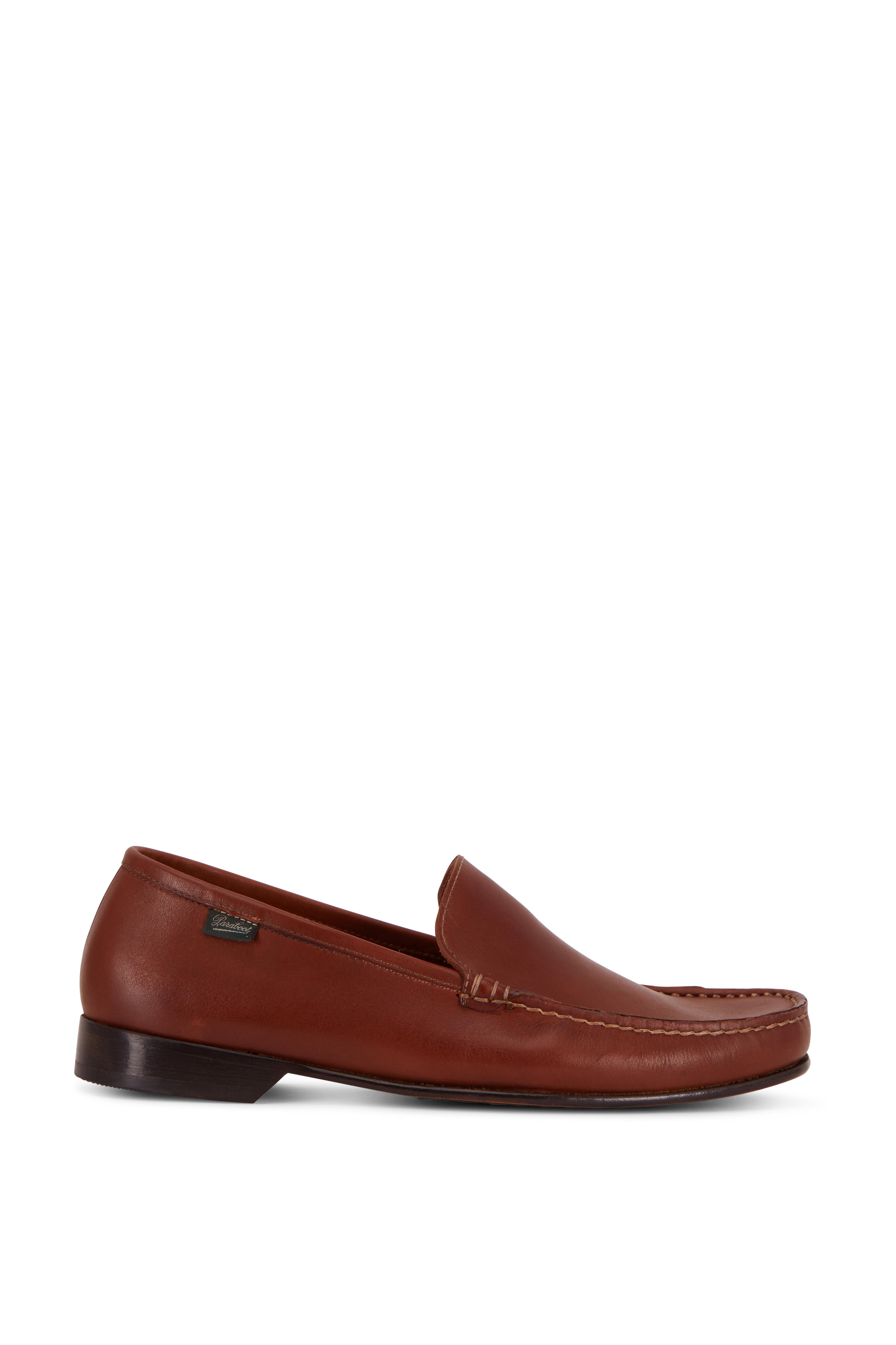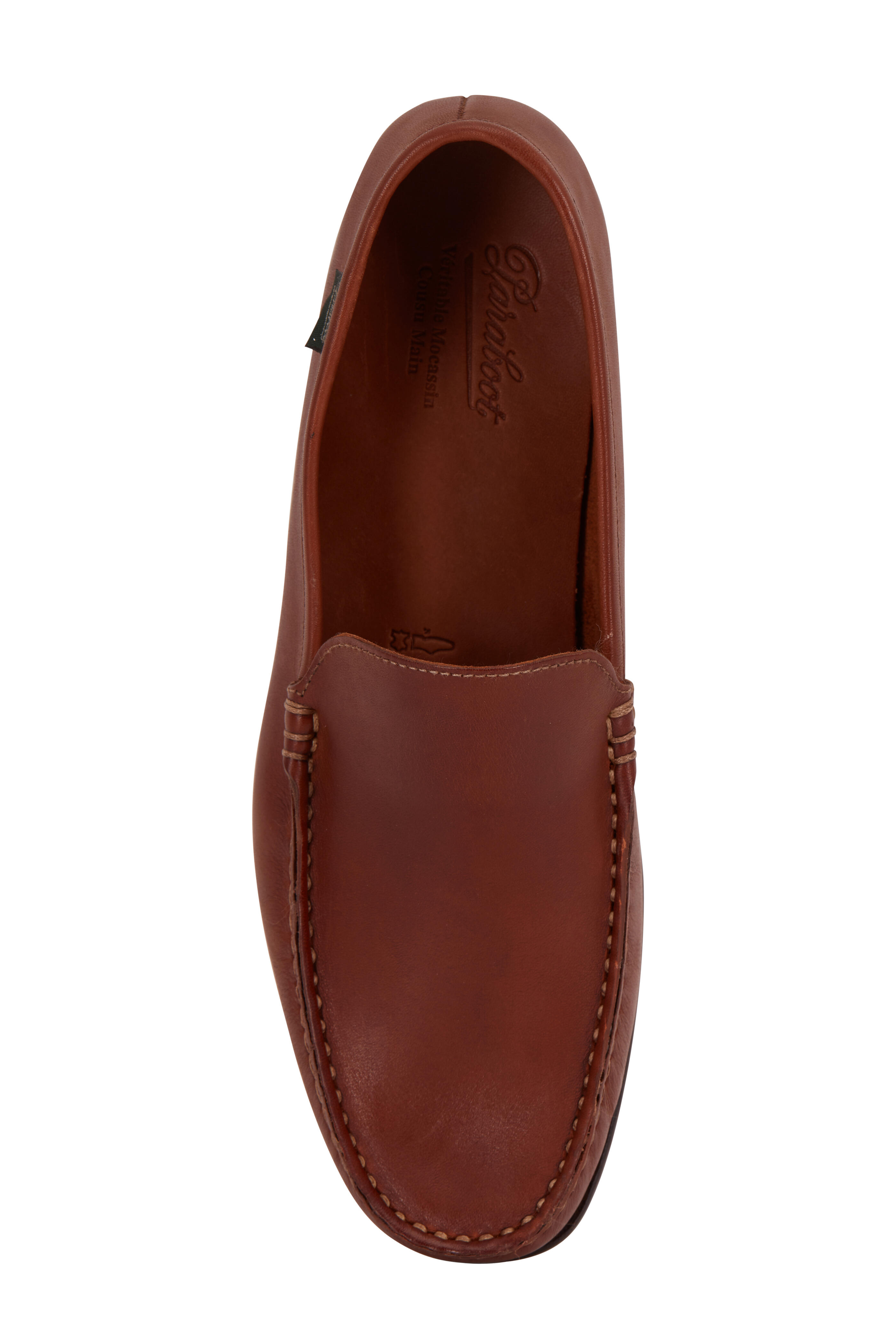 Calfskin leather upper. Moc toe. Tonal top-stitching. Unlined, cushioned insole. Stacked wooden heel. Leather with rubber inset sole. Made in Spain.
