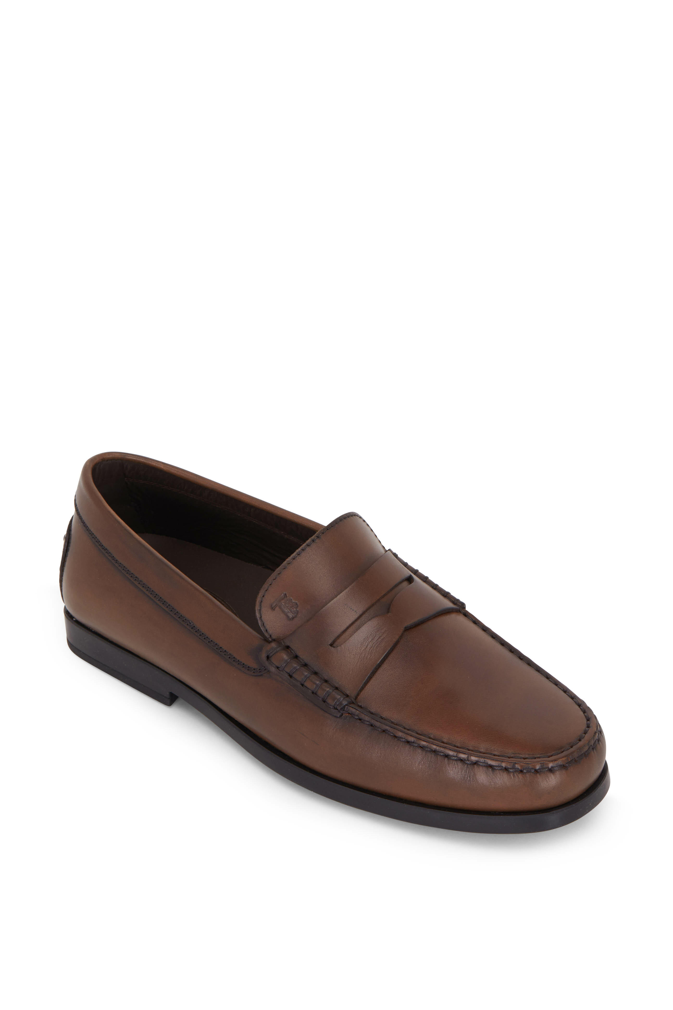 Burnished calfskin leather upper. Moc toe. Penny strap across vamp. Leather lining; cushioned insole. Signature pebbled rubber sole. Made in Italy.