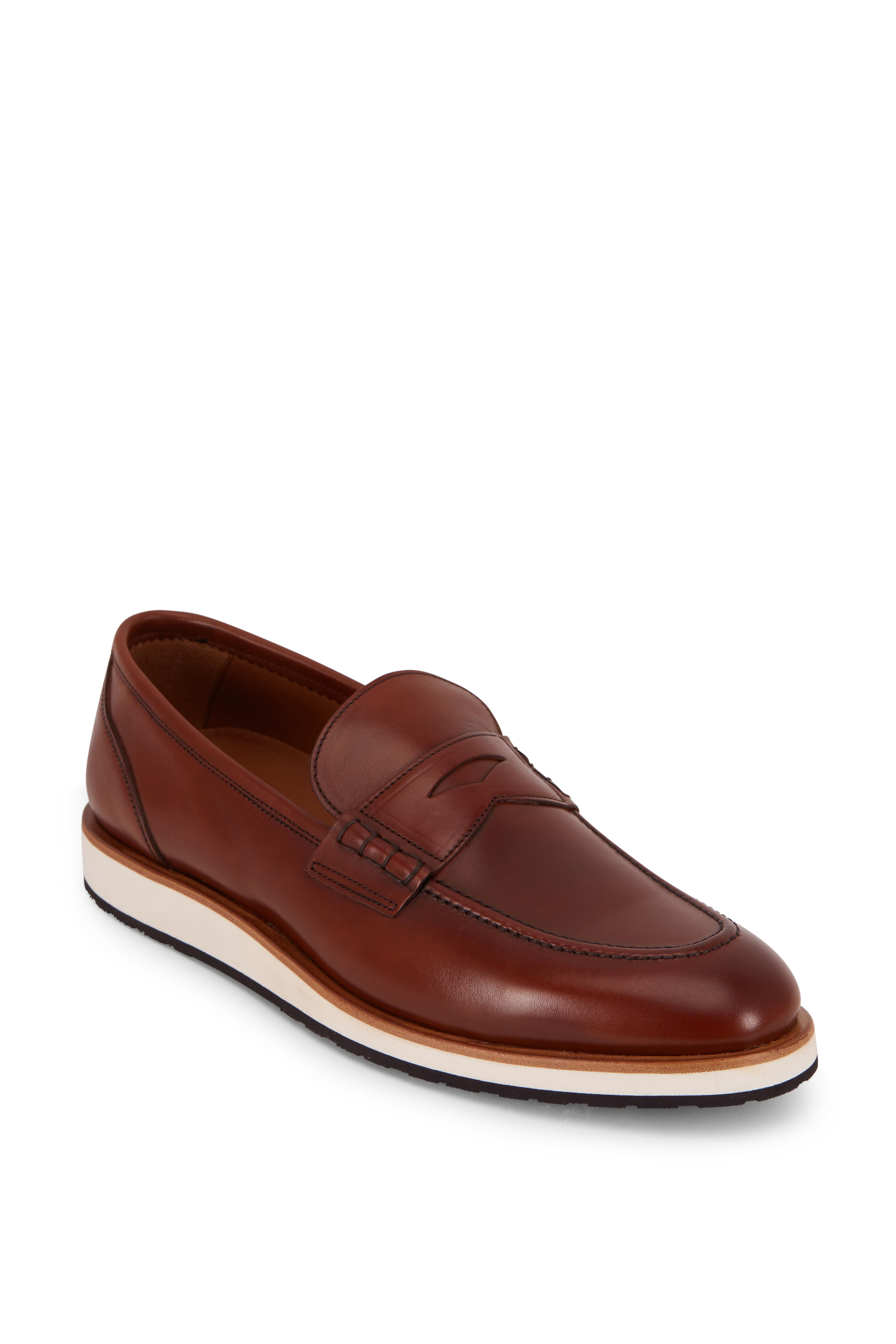 Calfskin leather upper. Apron toe. Penny strap across vamp. Contrast top-stitching. Leather lining, cushioned insole. Rubber sole. Made in Portugal.