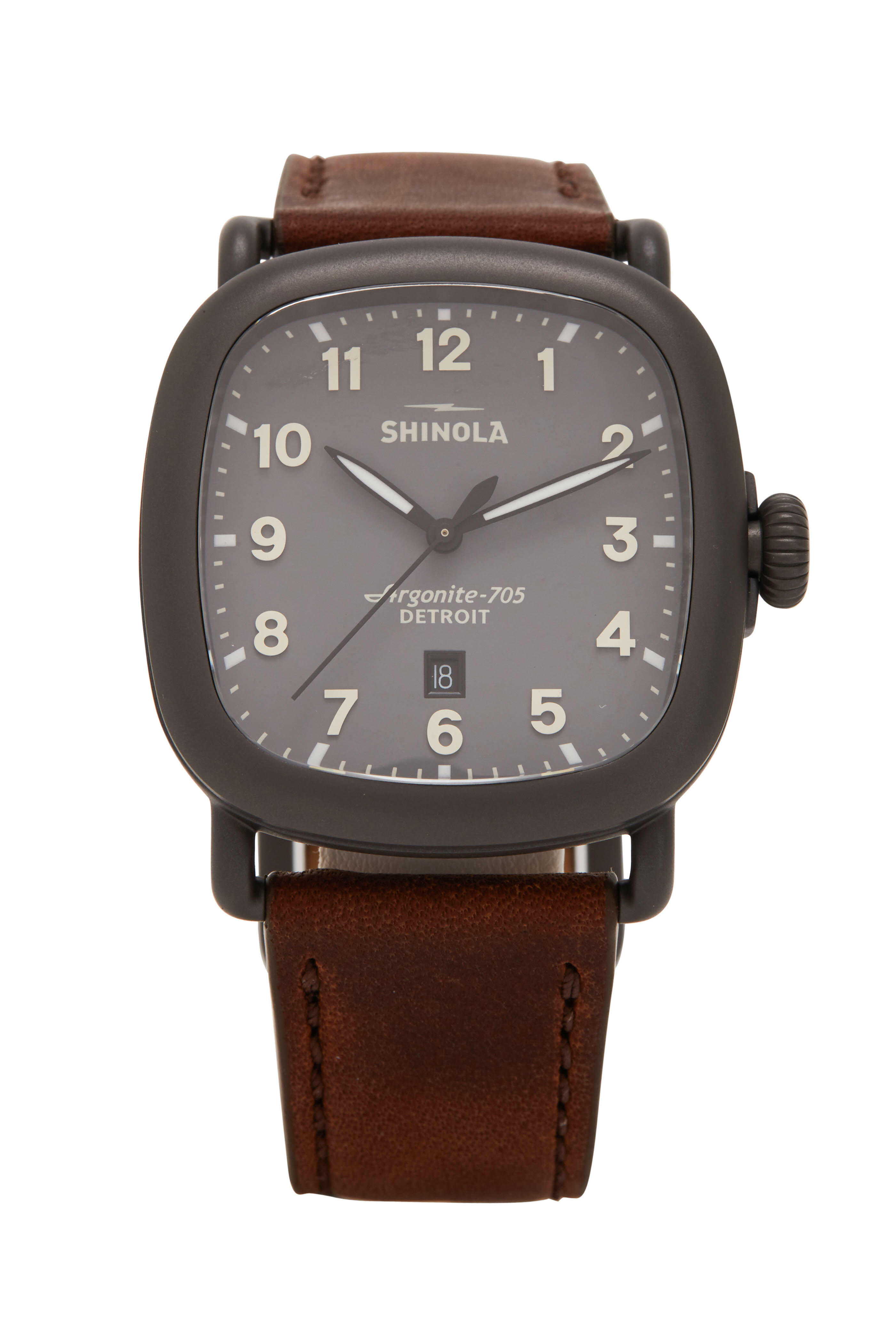 Movement: Argonite 705.3 quartz movement with Swiss and other imported parts. Case material: Sandblast PVD Gunmetal, with single curve sapphire crystal.. Case diameter: 41½mm. Strap: Cattail brown quick release strap hand sewn in the United States from premium leather.. Dial: Steel gray matte velvet dial with Super-LumiNova hands.. Made in the USA.