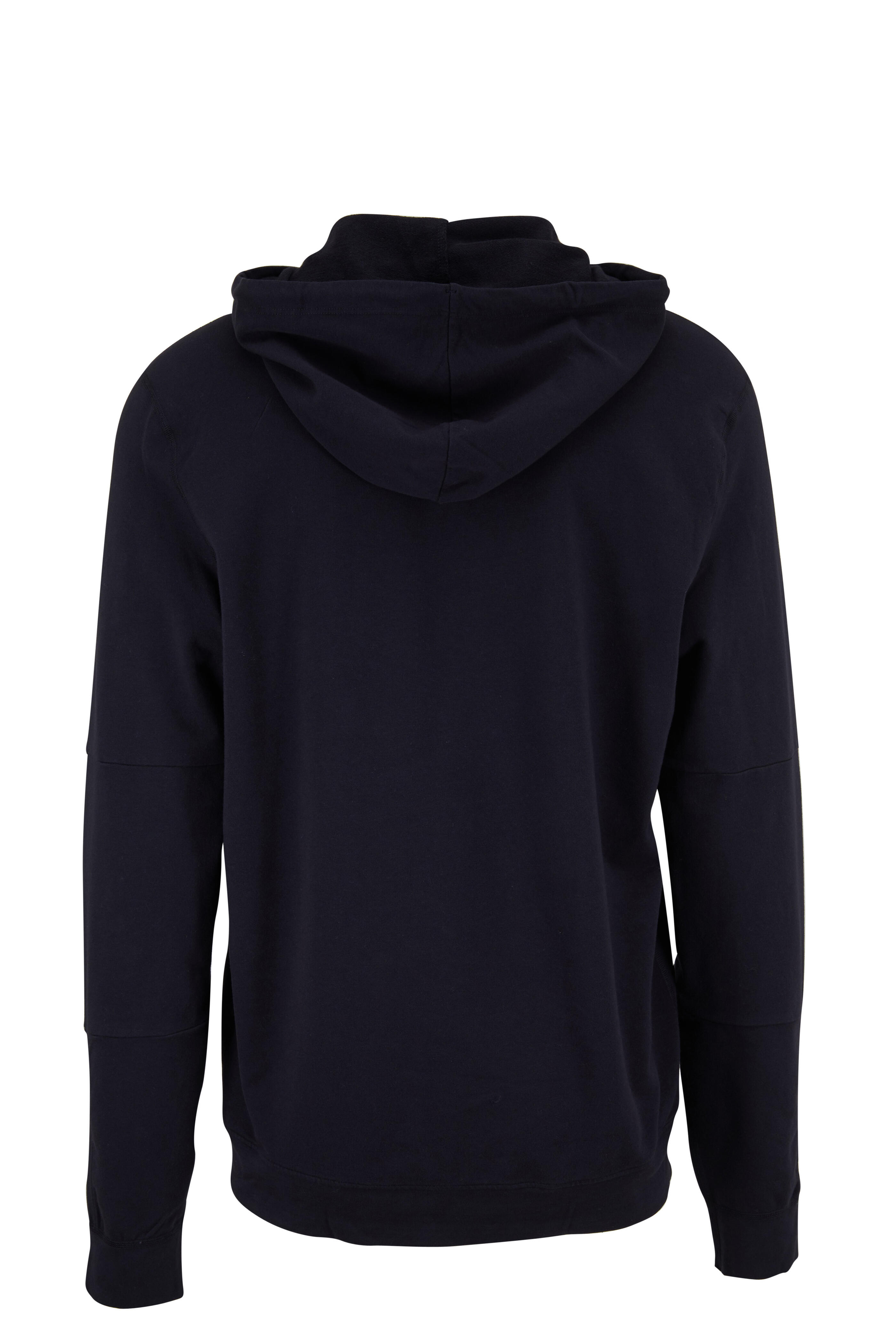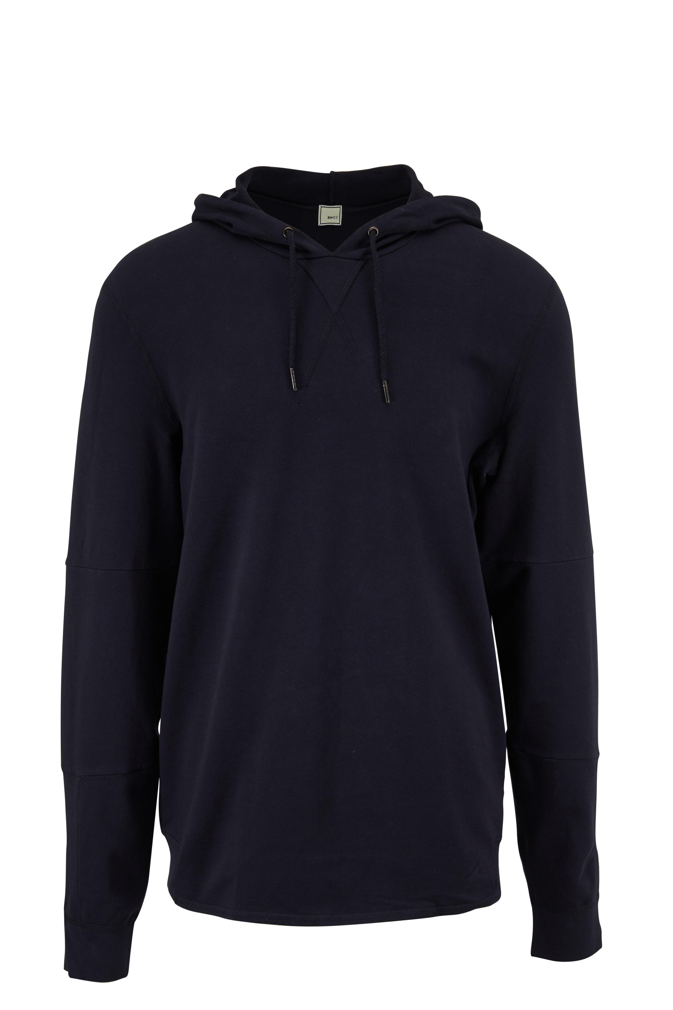 Attached, drawstring hood. Banded cuffs. Made in the USA. 94% cotton, 6% spandex. Machine wash.
