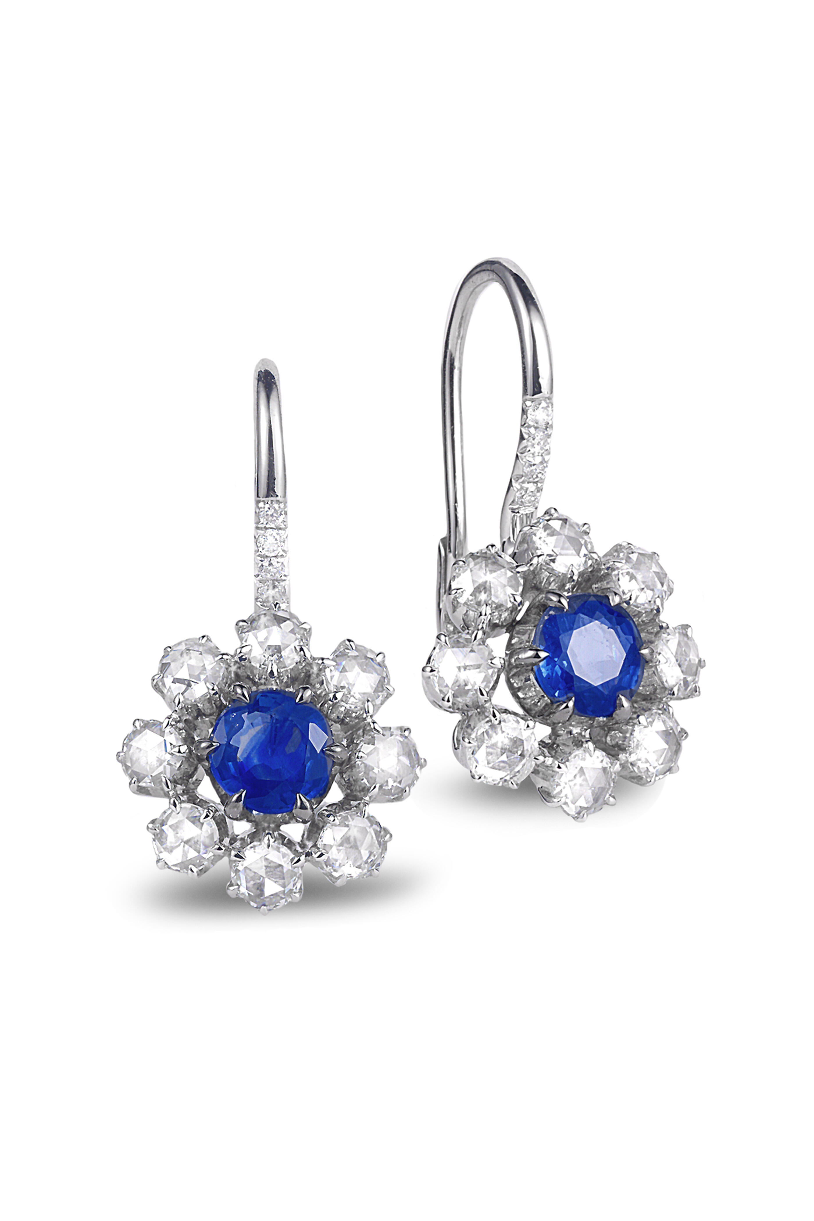 White Gold Sapphire & Diamond Flower Drop Earrings