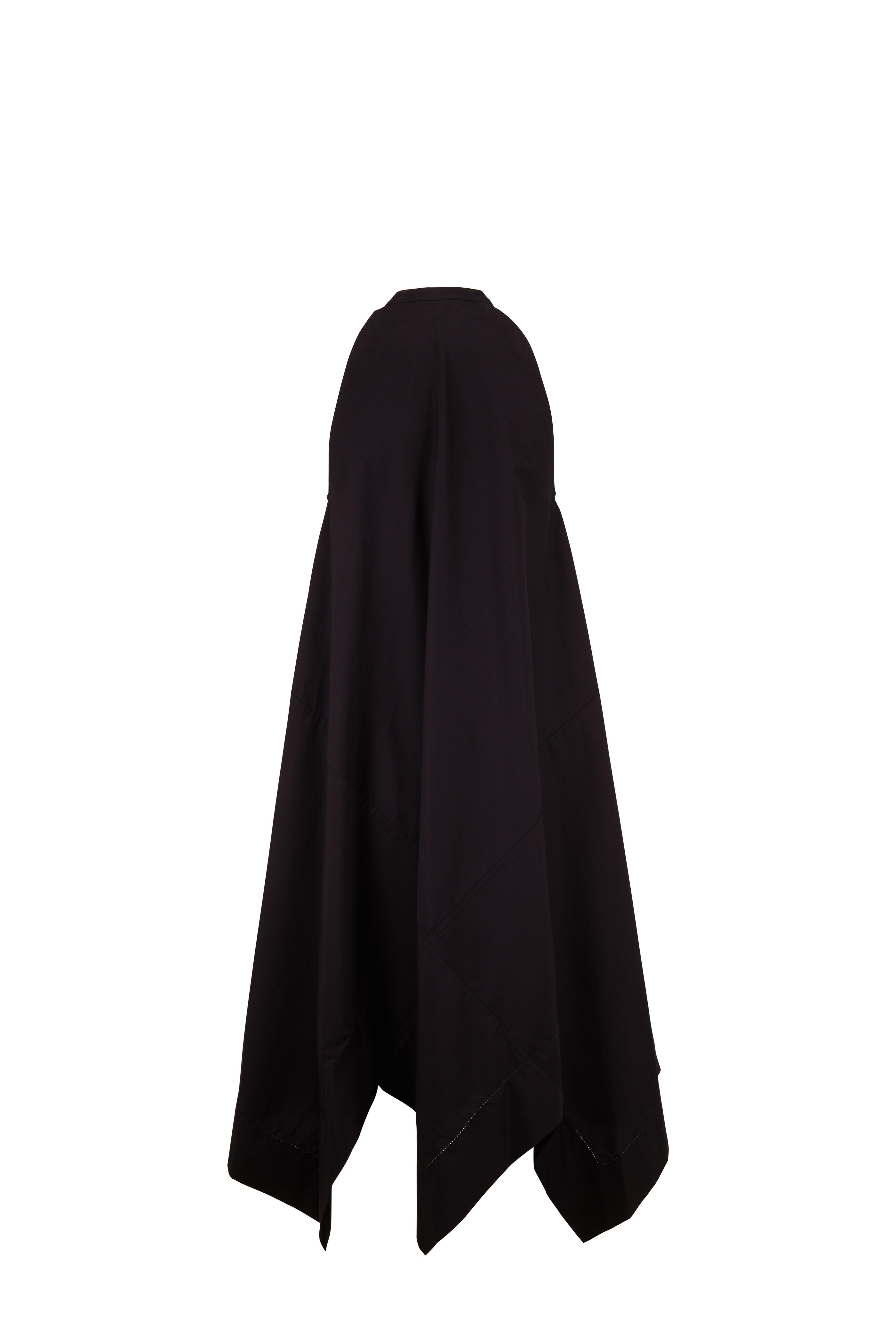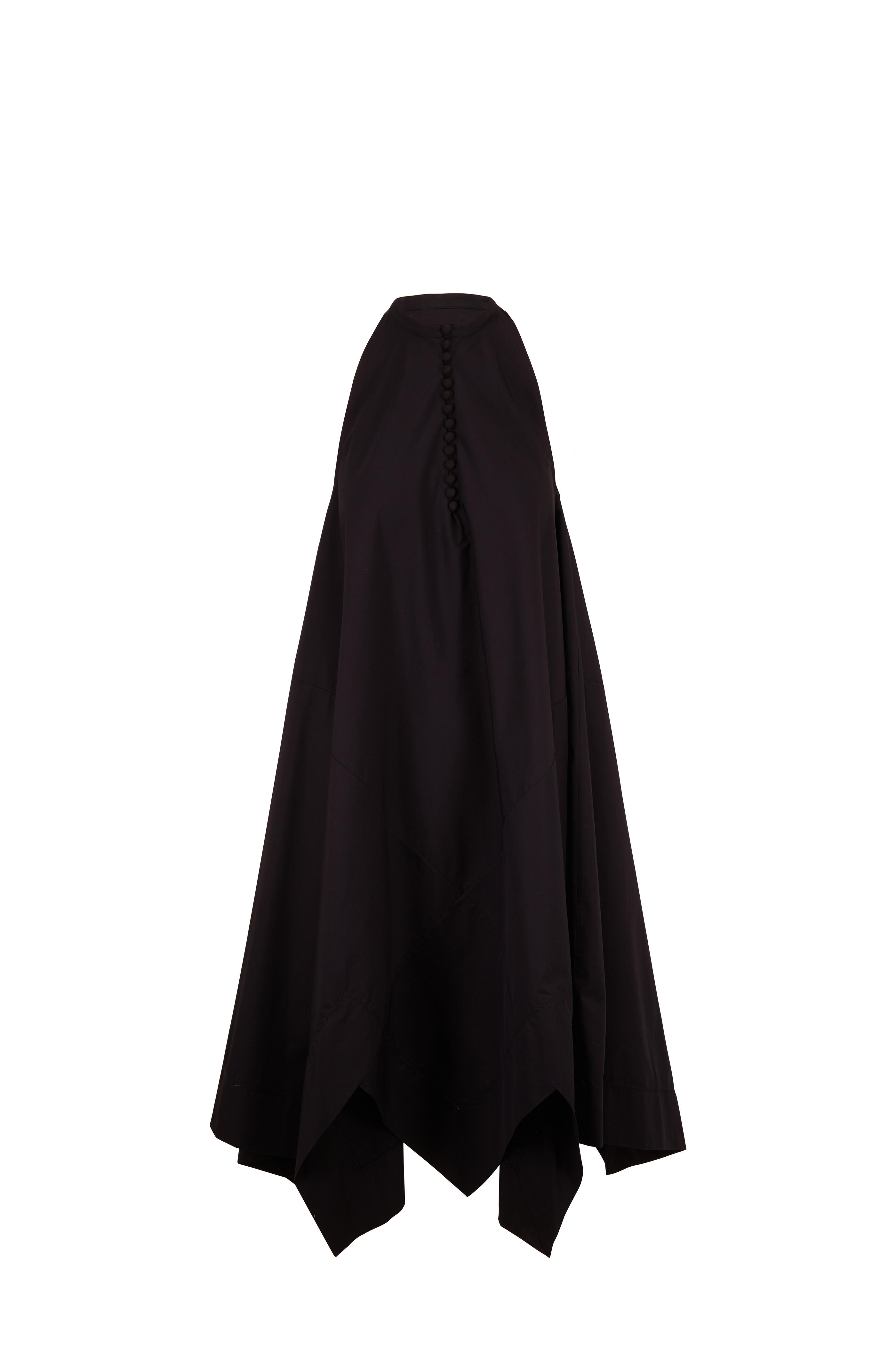 Cotton. Halter neckline; functional front buttons. Slip over style. Cut-in shoulders; sleeveless. Handkerchief hem. Made in the USA. A-line silhouette. Dry clean.