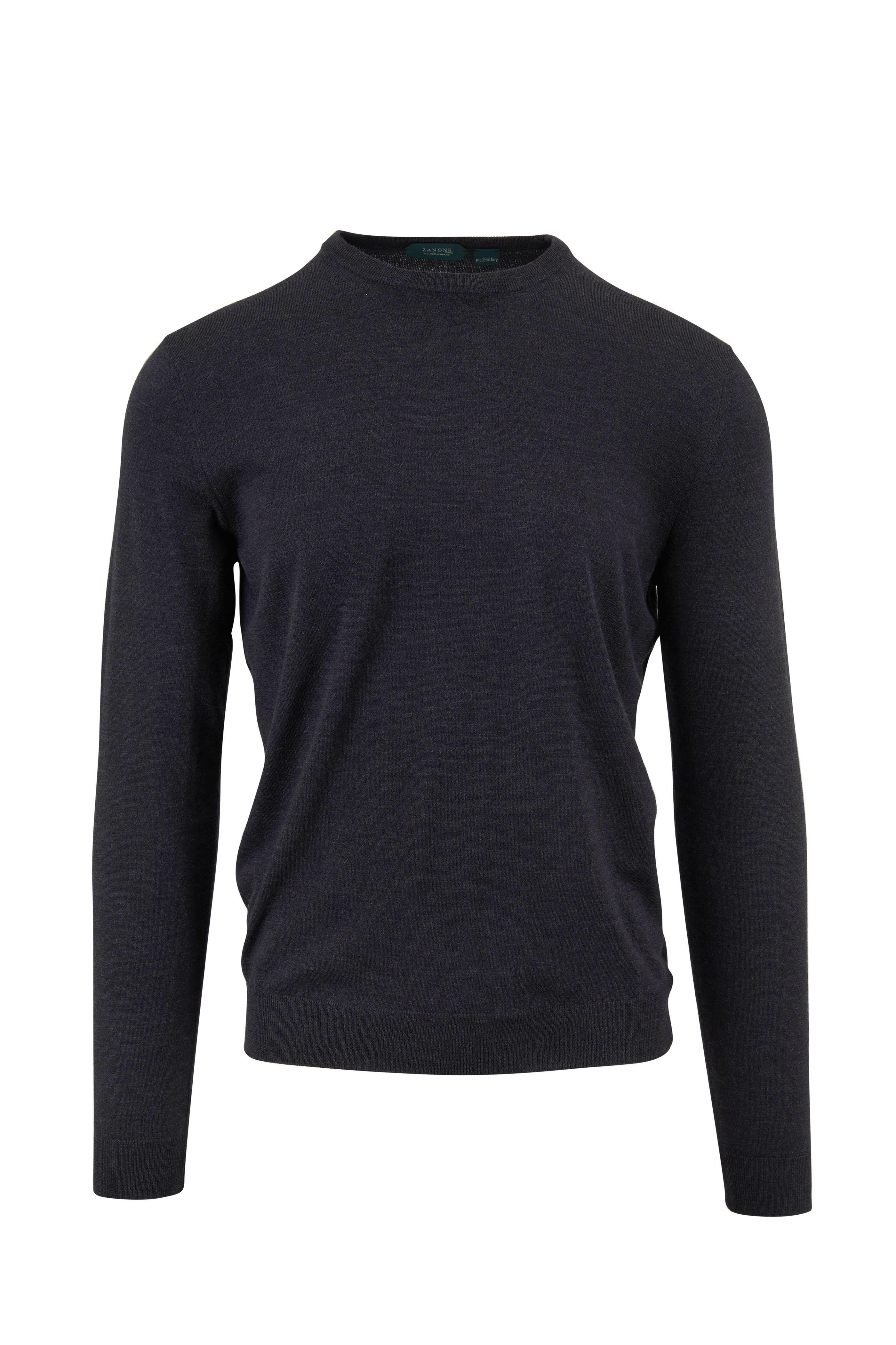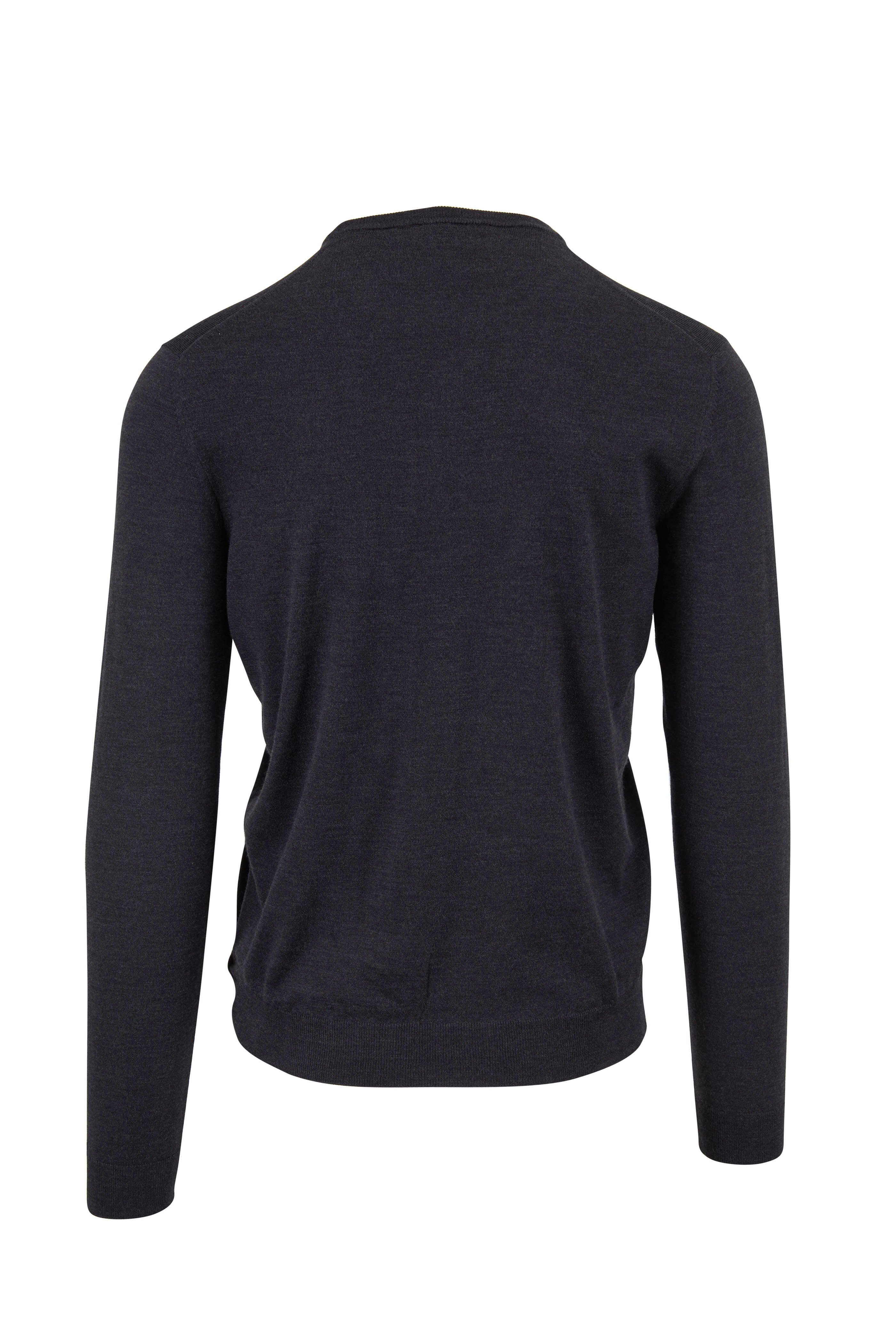 Crewneck. Tonal top-stitching detail. Ribbed trim. Made in Italy. 95% virgin wool, 5% polyamide. Hand wash.