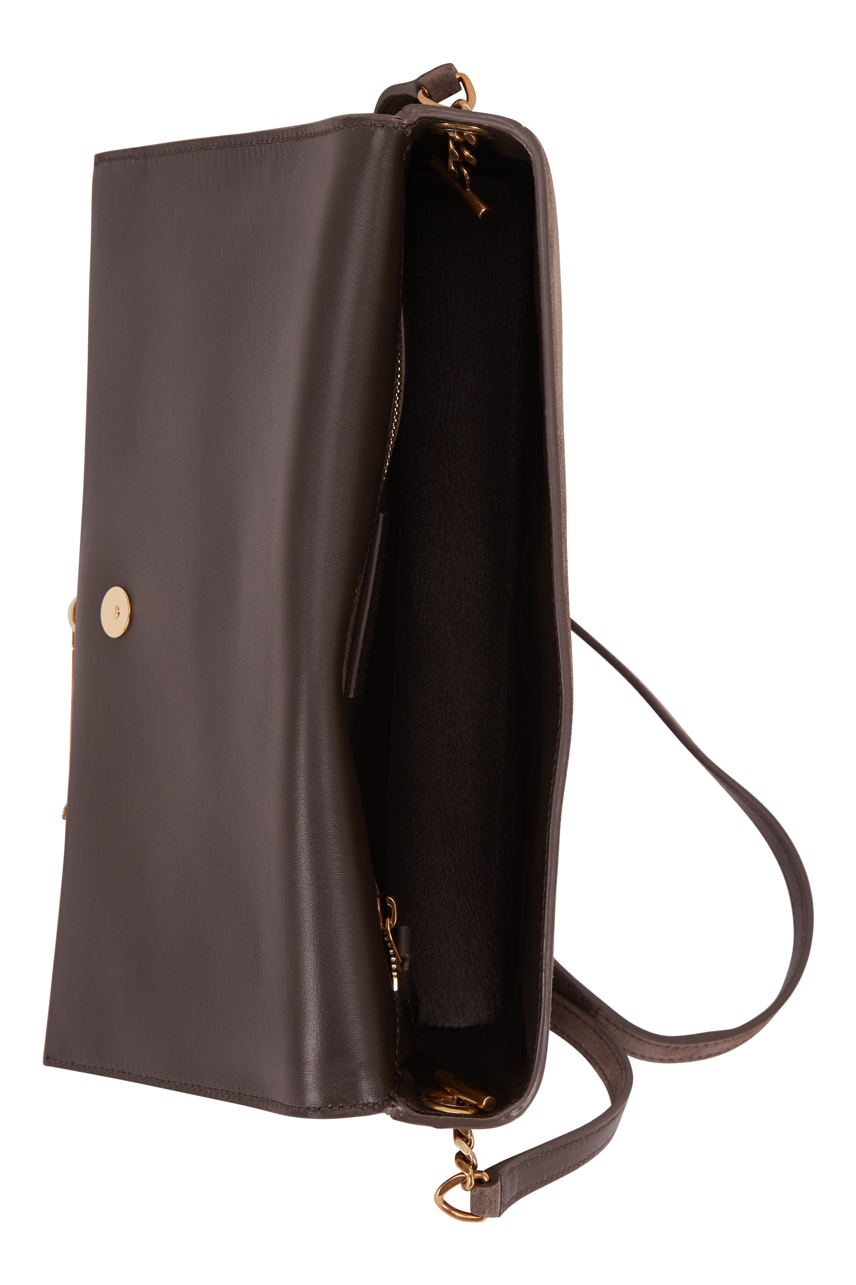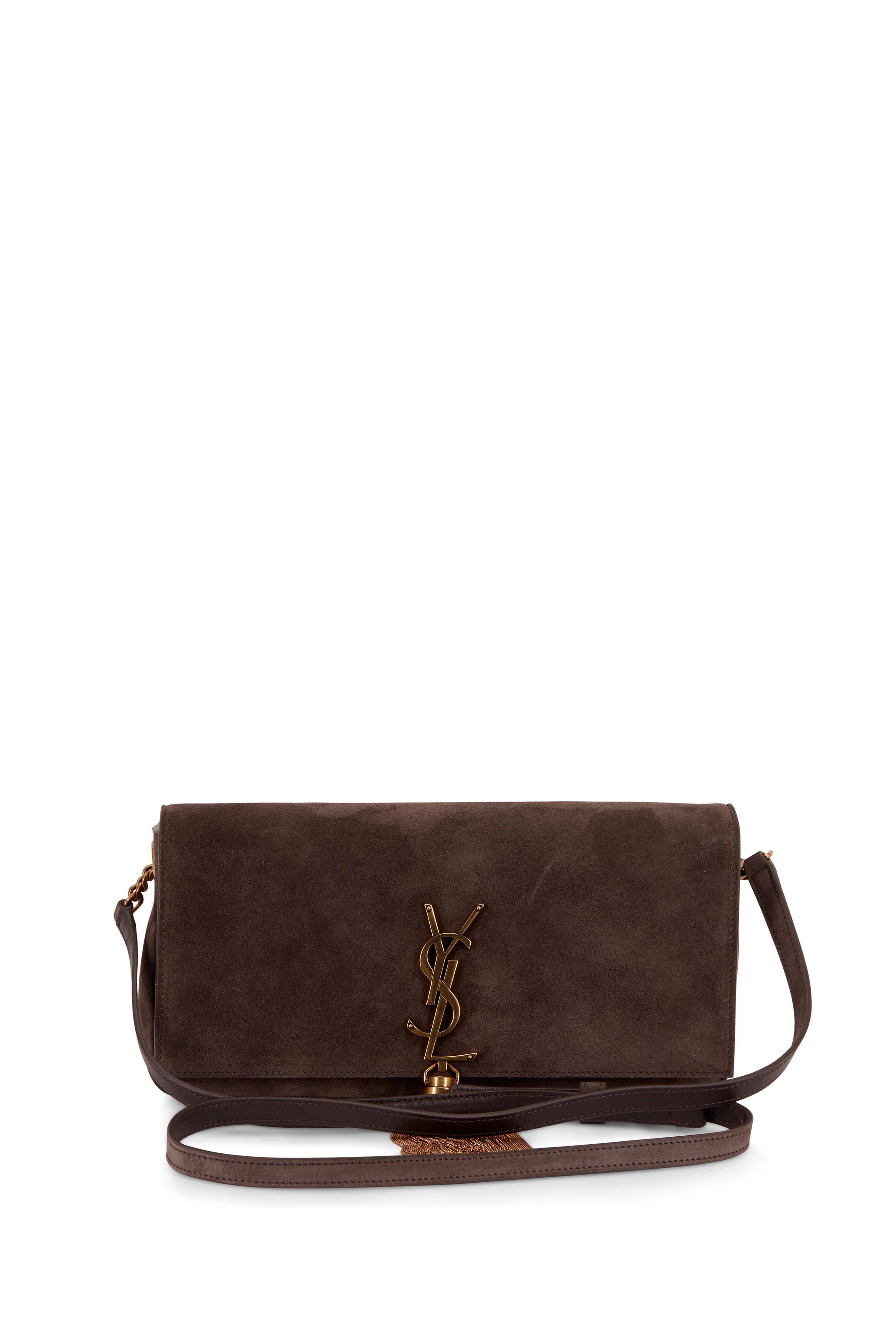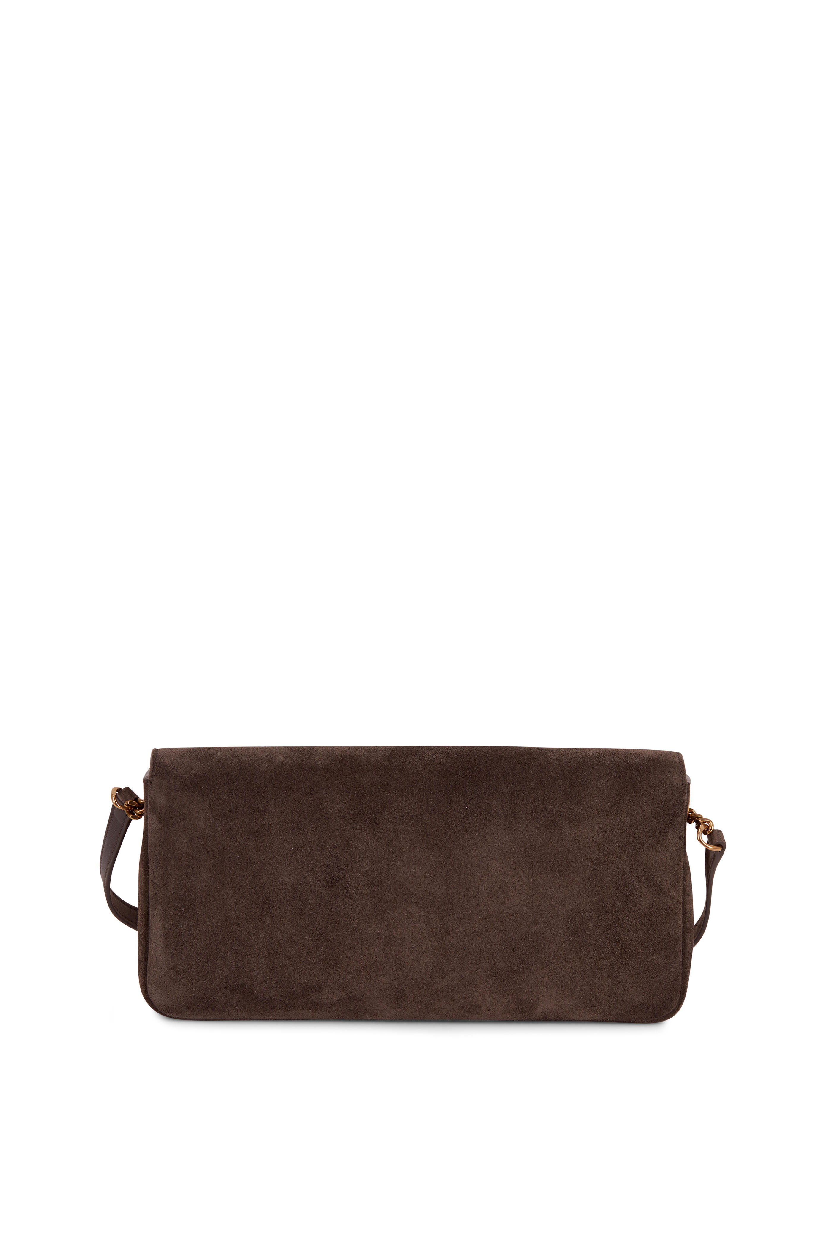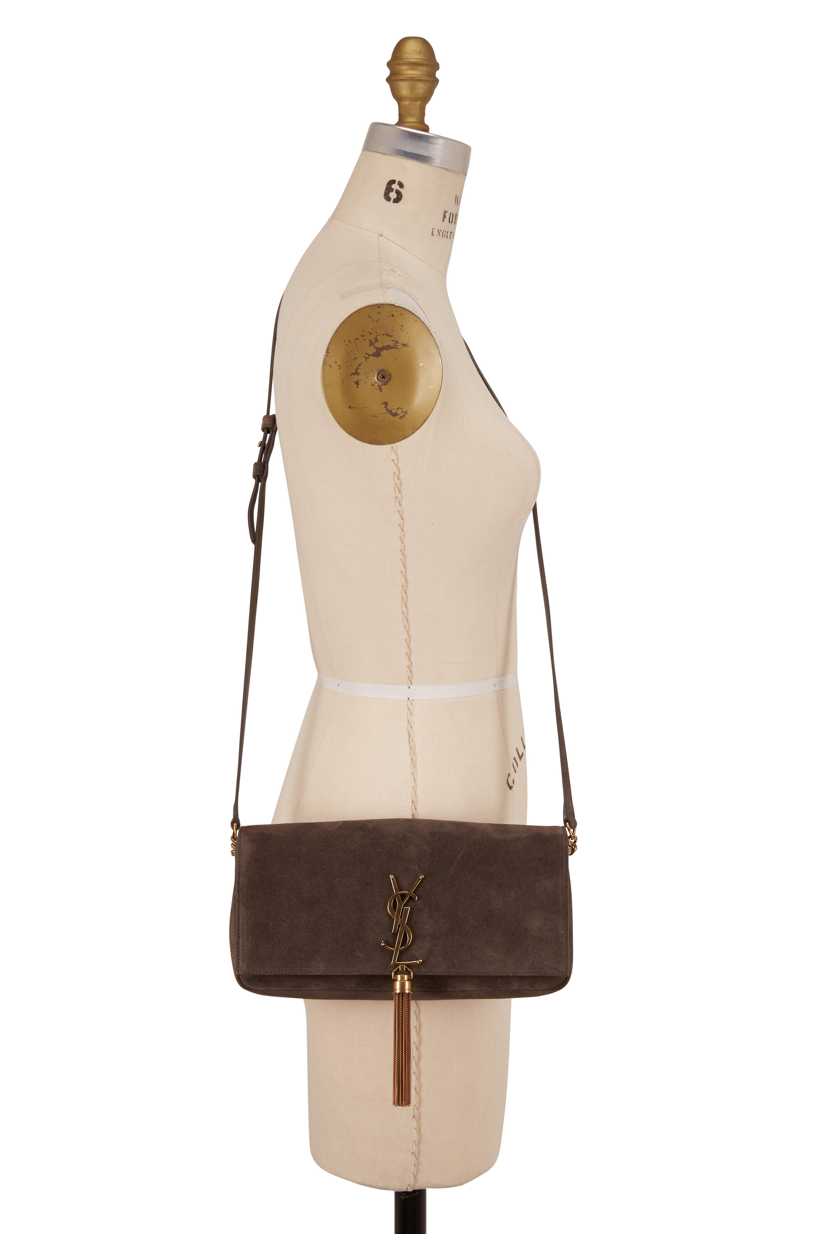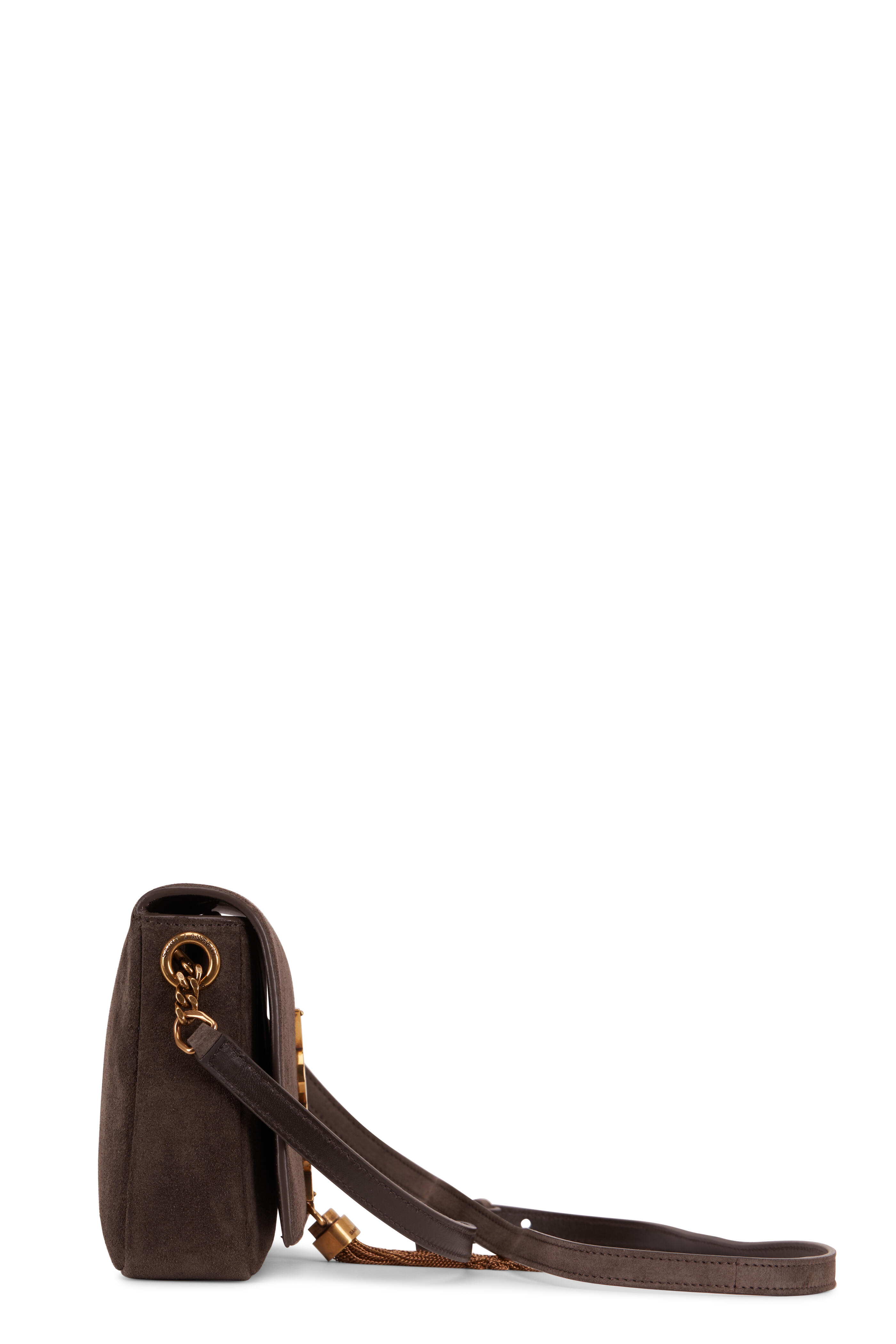 Calfskin suede. Detachable and adjustable shoulder strap. Flap front, magnetic snap closure. Bronze signature and tassel detail. One interior zip pocket. Lined in leather. Made in Italy. Width: 10". Height: 5". Depth: 2". Detachable strap strap: 20".
