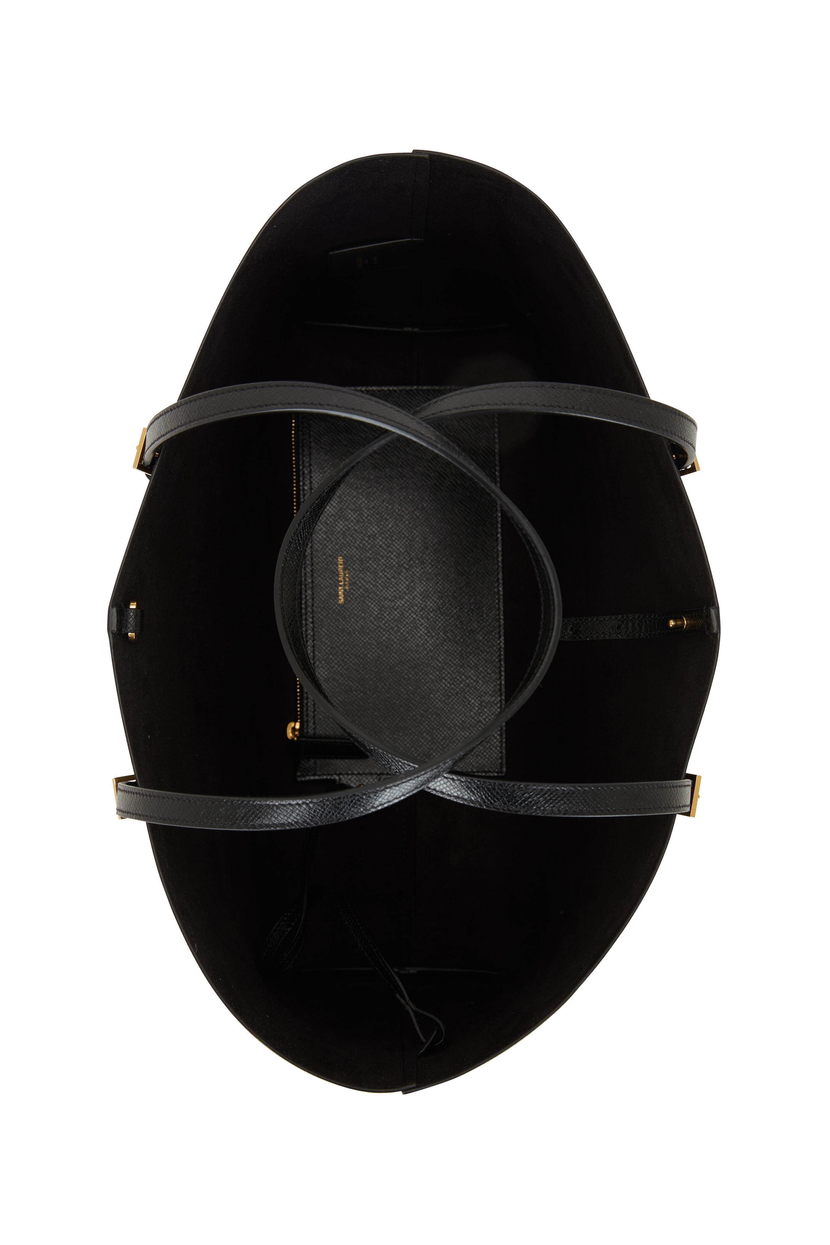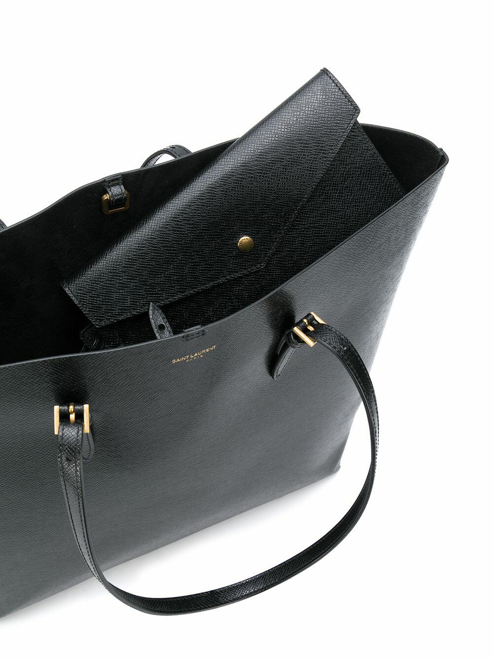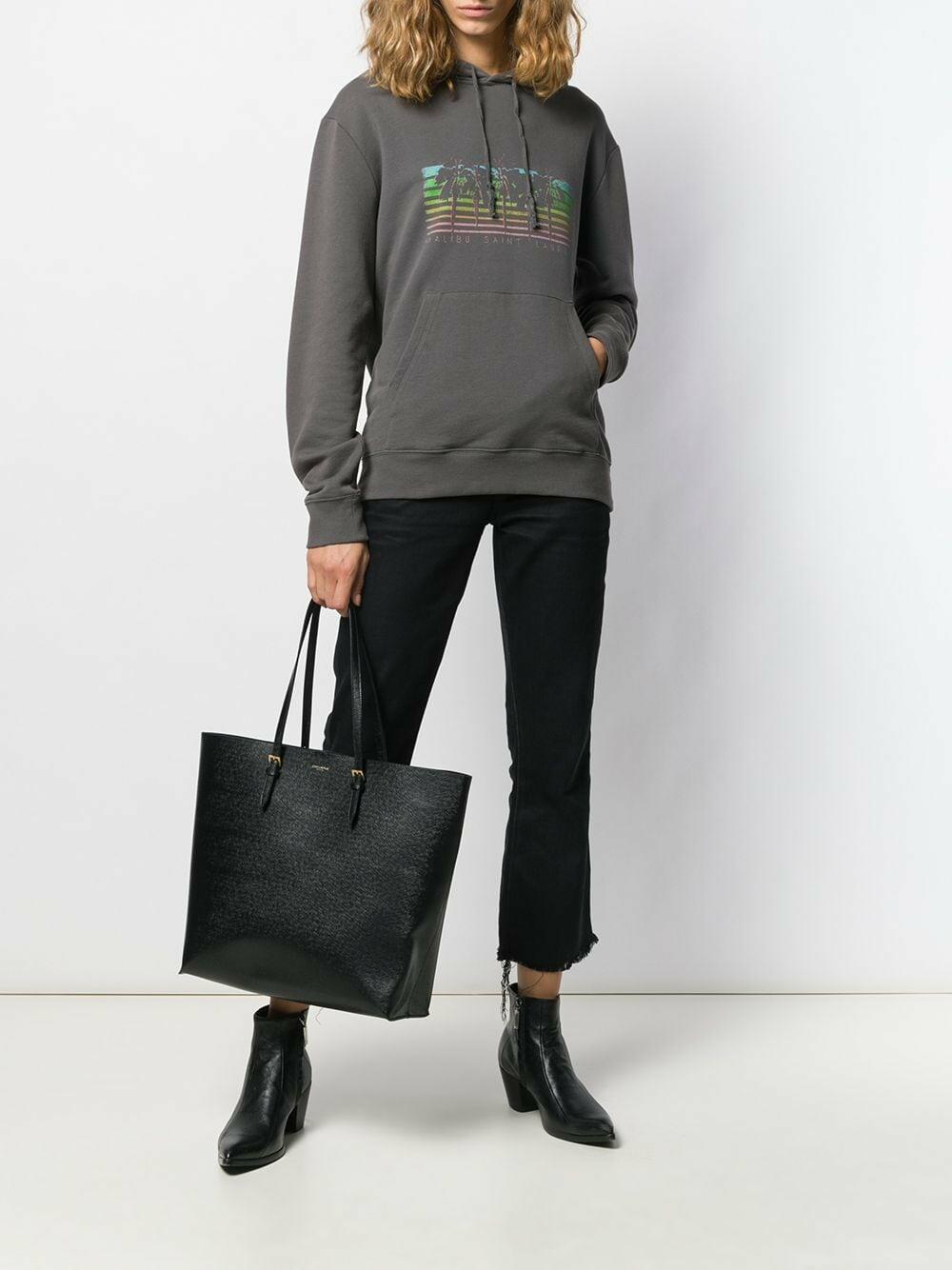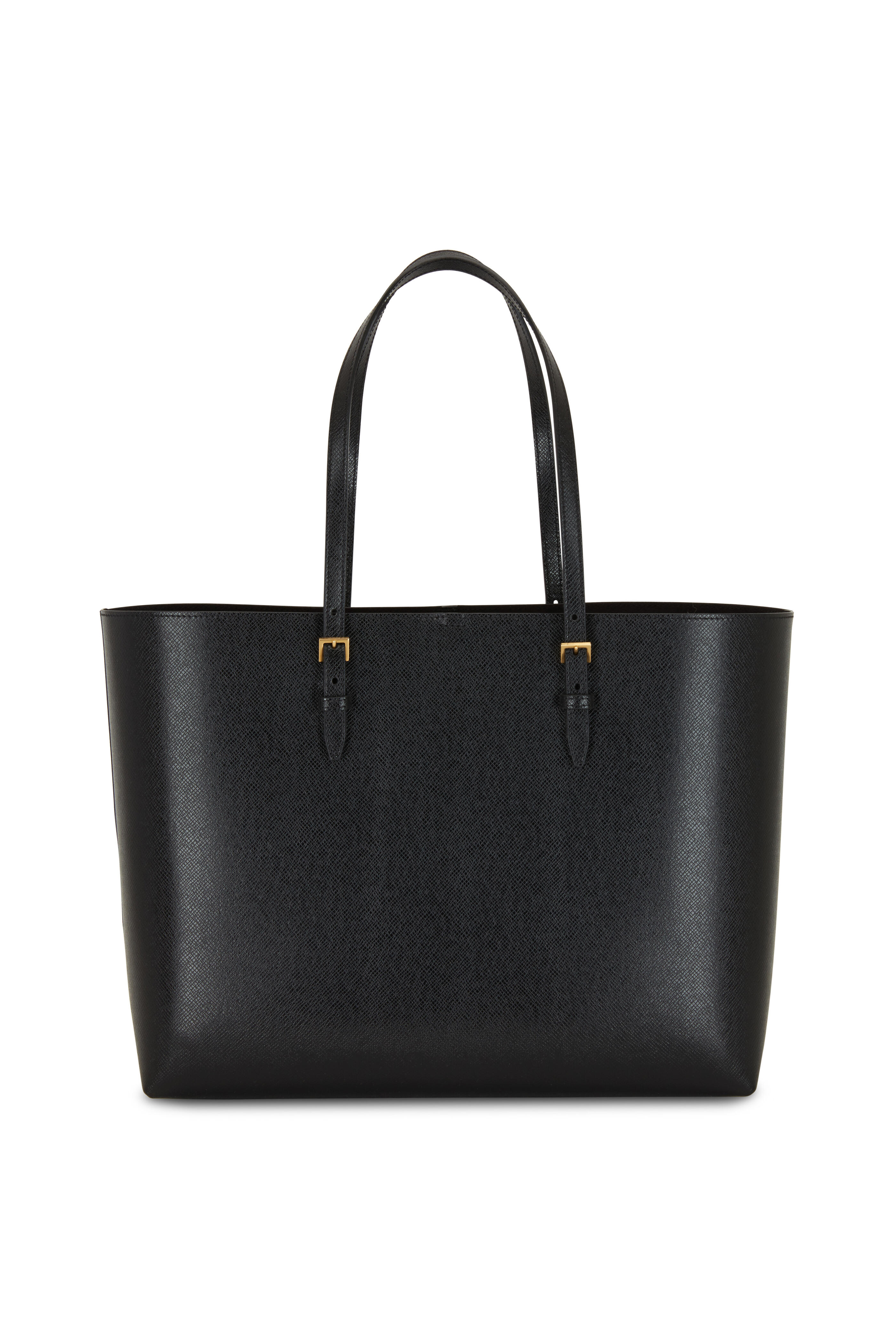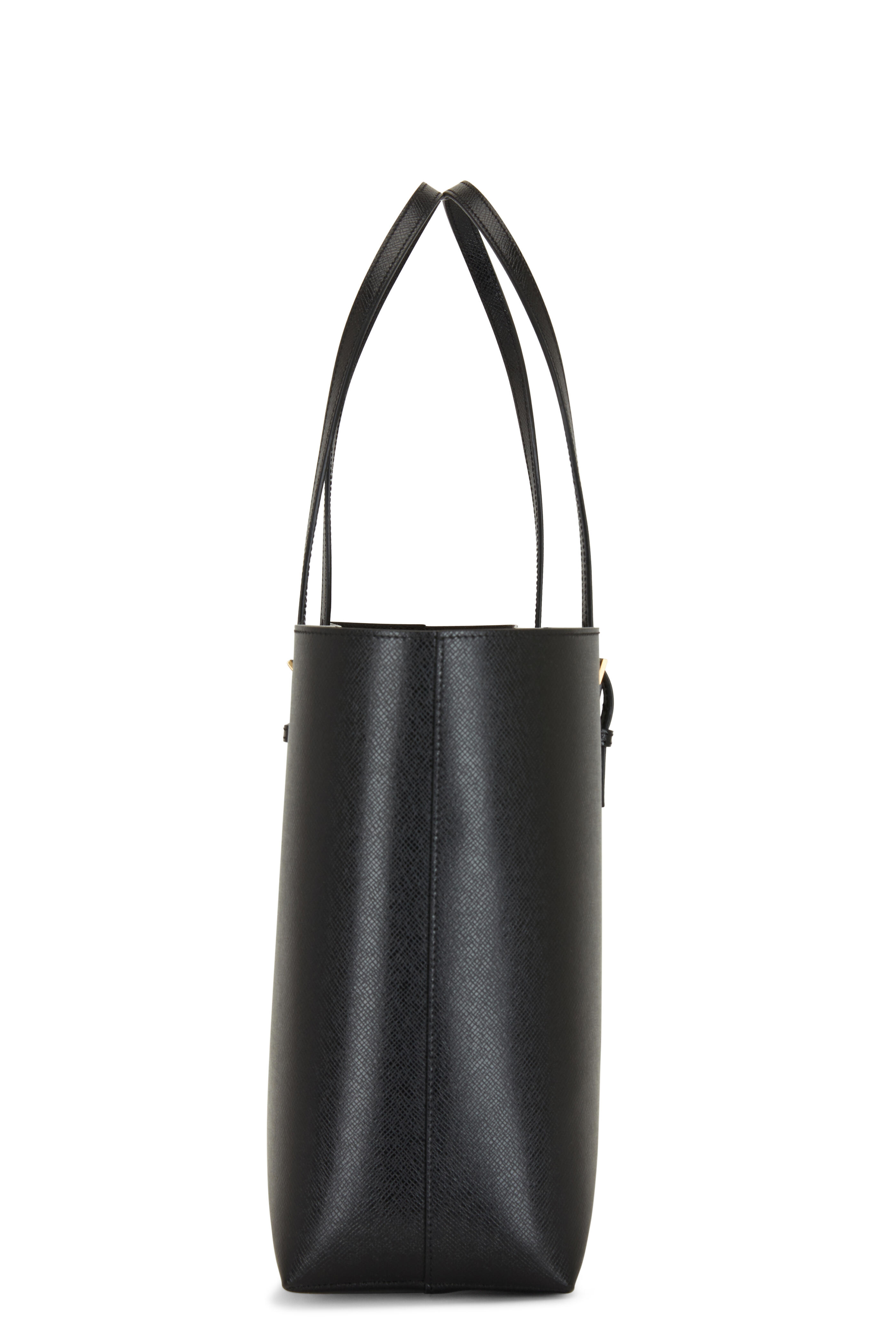 Ring embossed calfskin leather. Adjustable straps. Center tab-snap closure. Detachable zip pouch pocket. Lined in suede. Made in Italy. Width: 15". Height: 11". Depth: 5". Adjustable strap drop: 9".