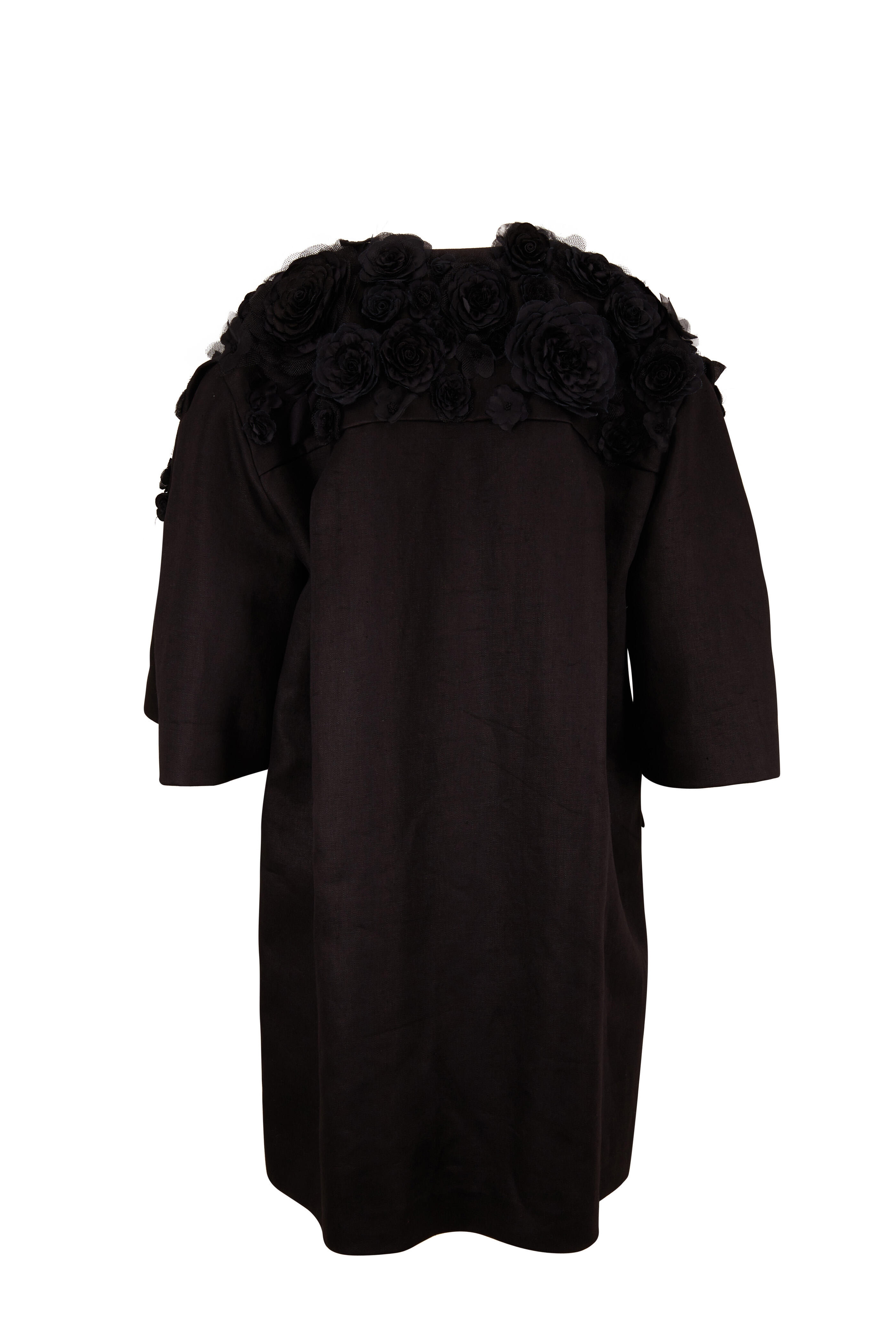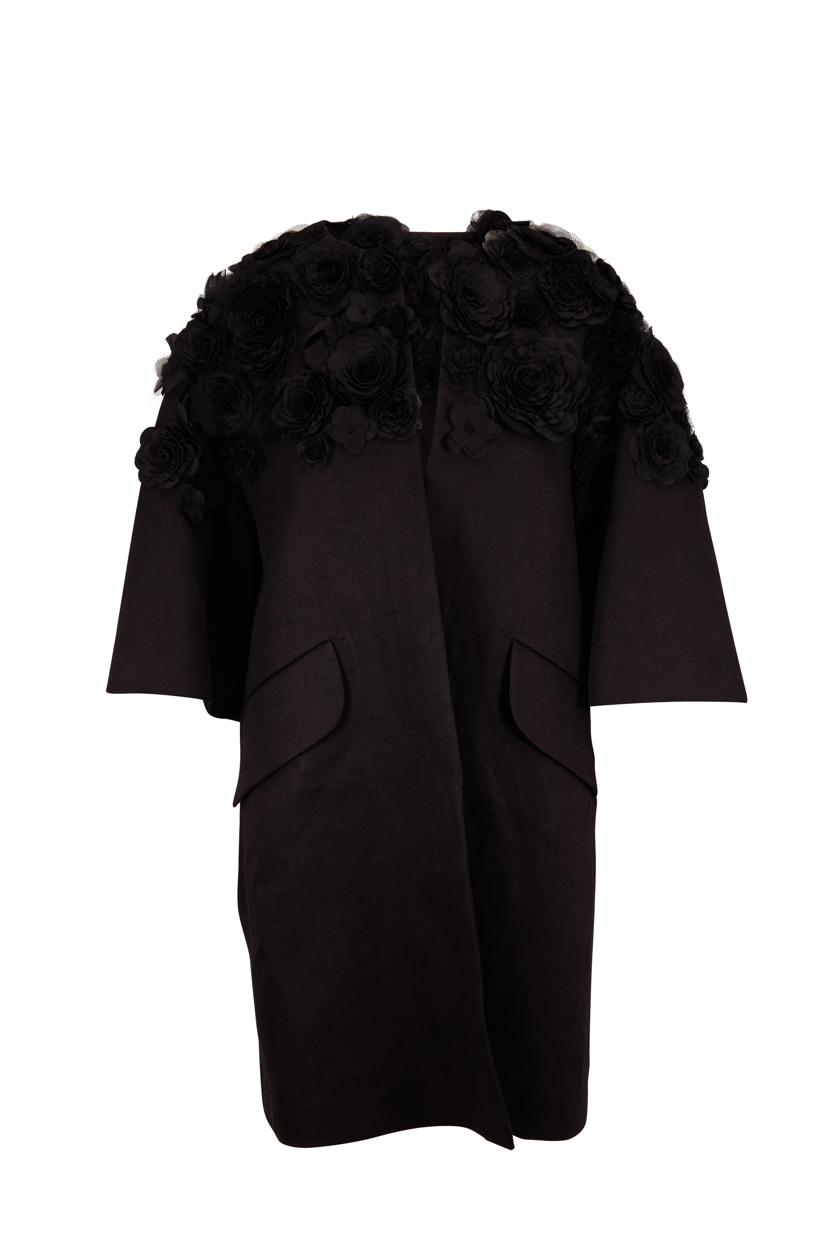 Round neckline. Open front. Floral organza embroidery. Elbow pleated bell sleeves. Flap pockets. Made in the USA. 38" shoulder to hem. 100% silk; partially lined. Dry clean.