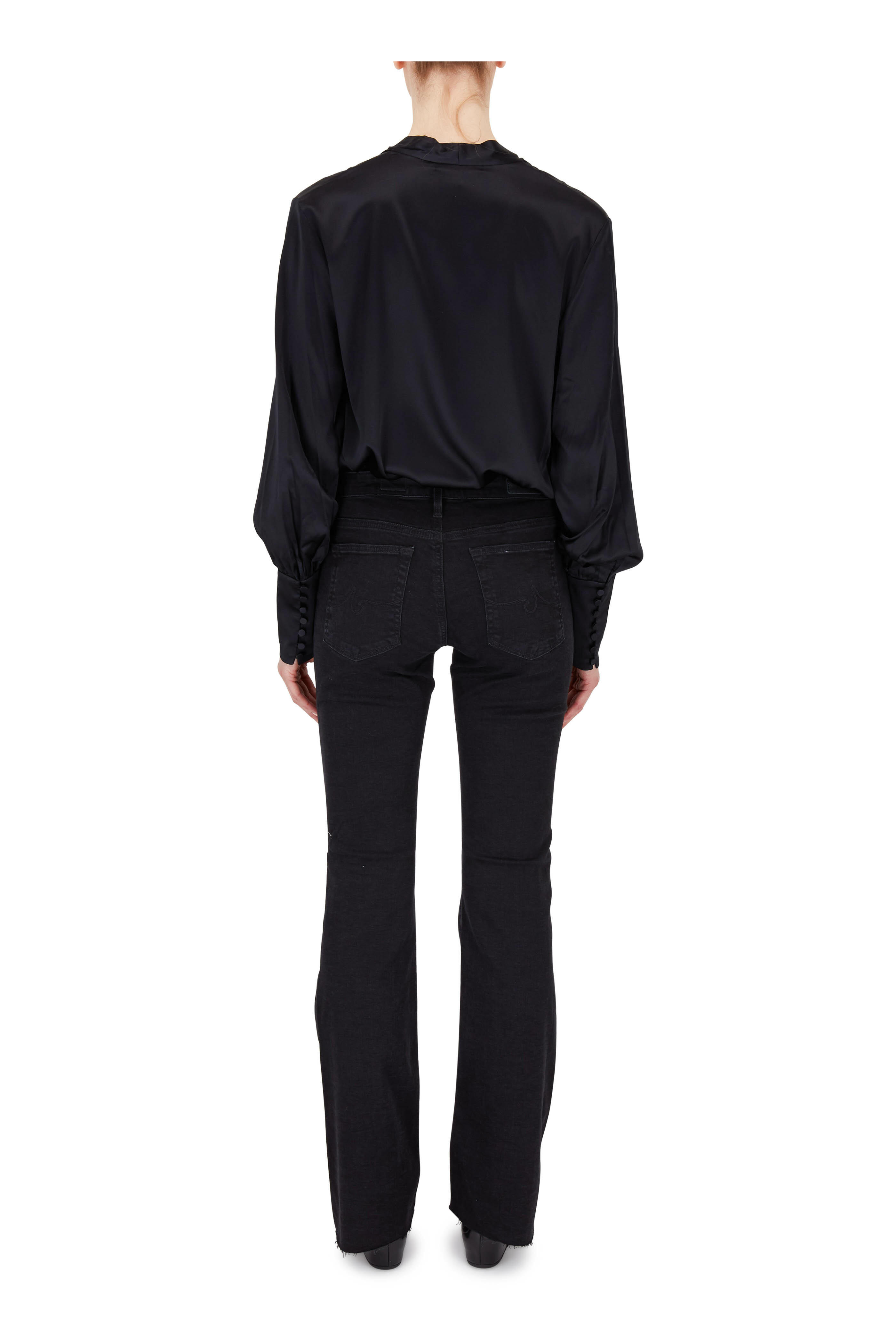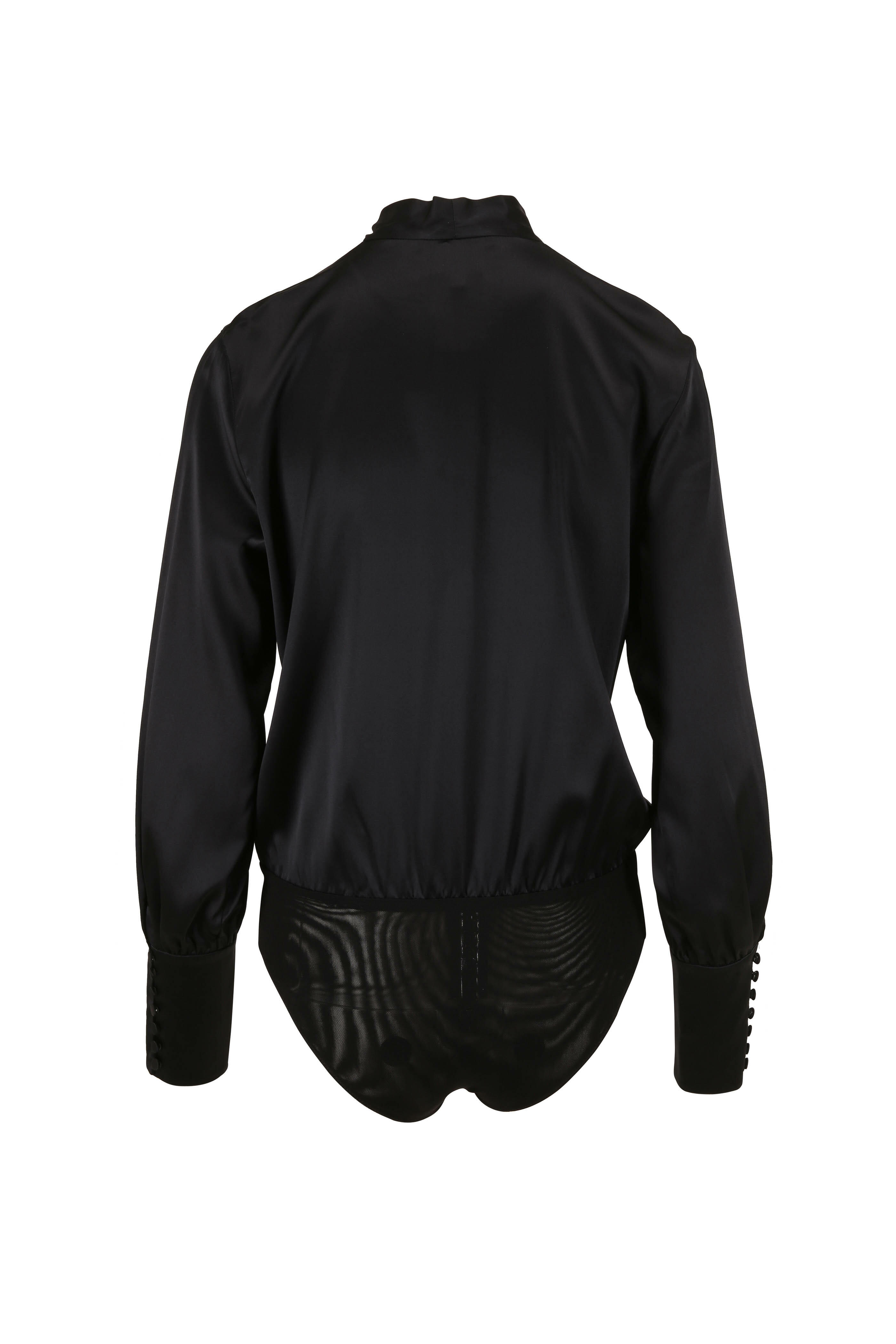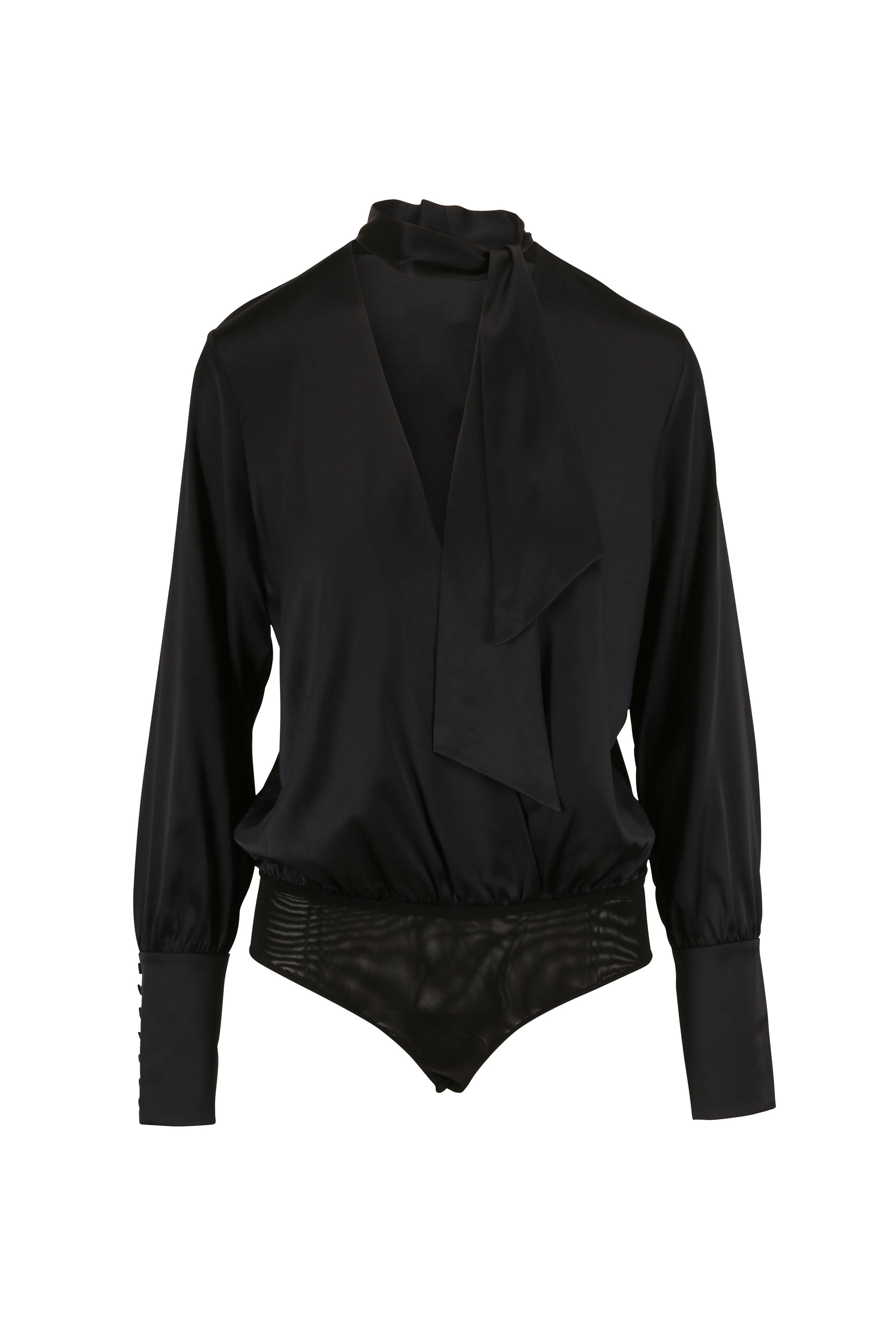 Surplice v-neckline; single hook and eye closure. Squared, button cuffs. Hook and eye gusset. Self-tie detailing at neckline. Imported. 94% silk, 6% spandex; fabric 2: 93% nylon, 7% spandex. Dry clean.