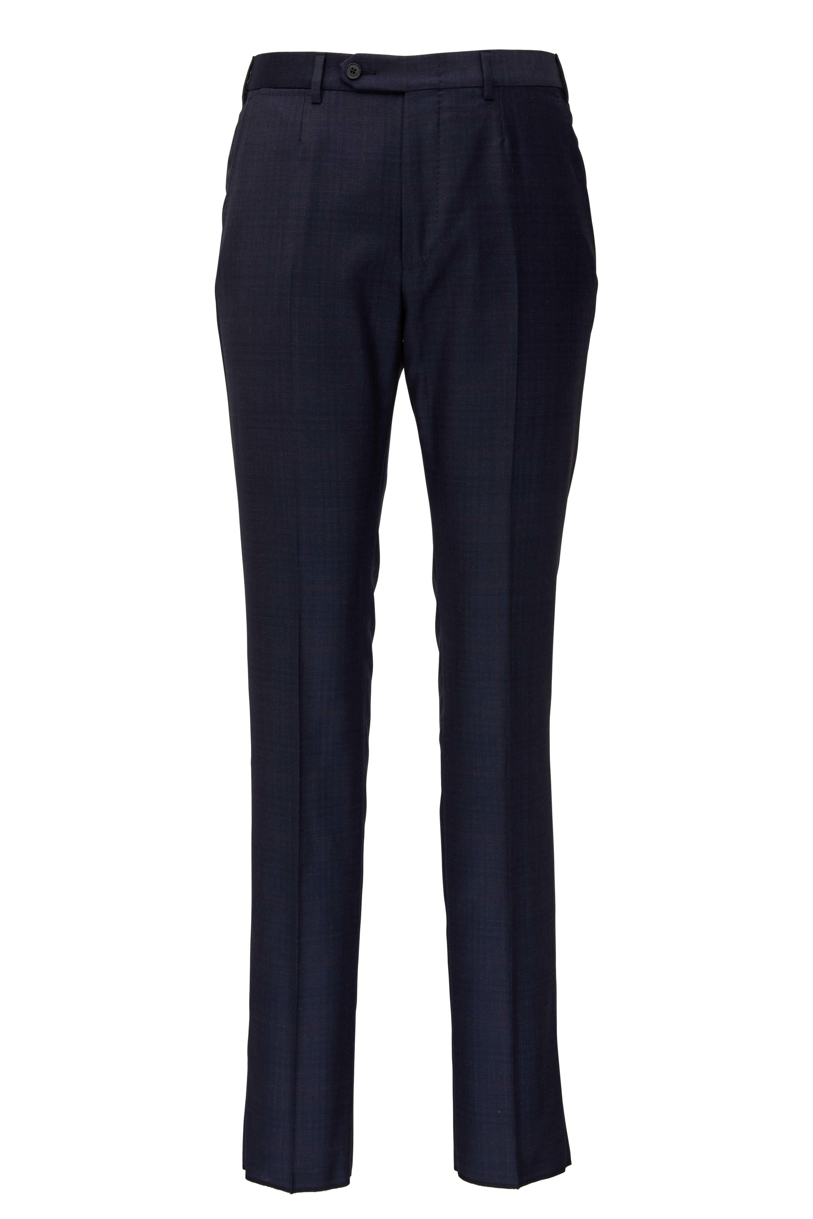 Made in Italy. Jacket: Fully lined. Notched lapels. Front two button closure. Lower flap pockets, lower welt pocket, chest welt pocket. Double vent. Pant: Front slip pockets; back besom pockets. Unfinished hem. 95% wool, 5% silk. Dry clean.