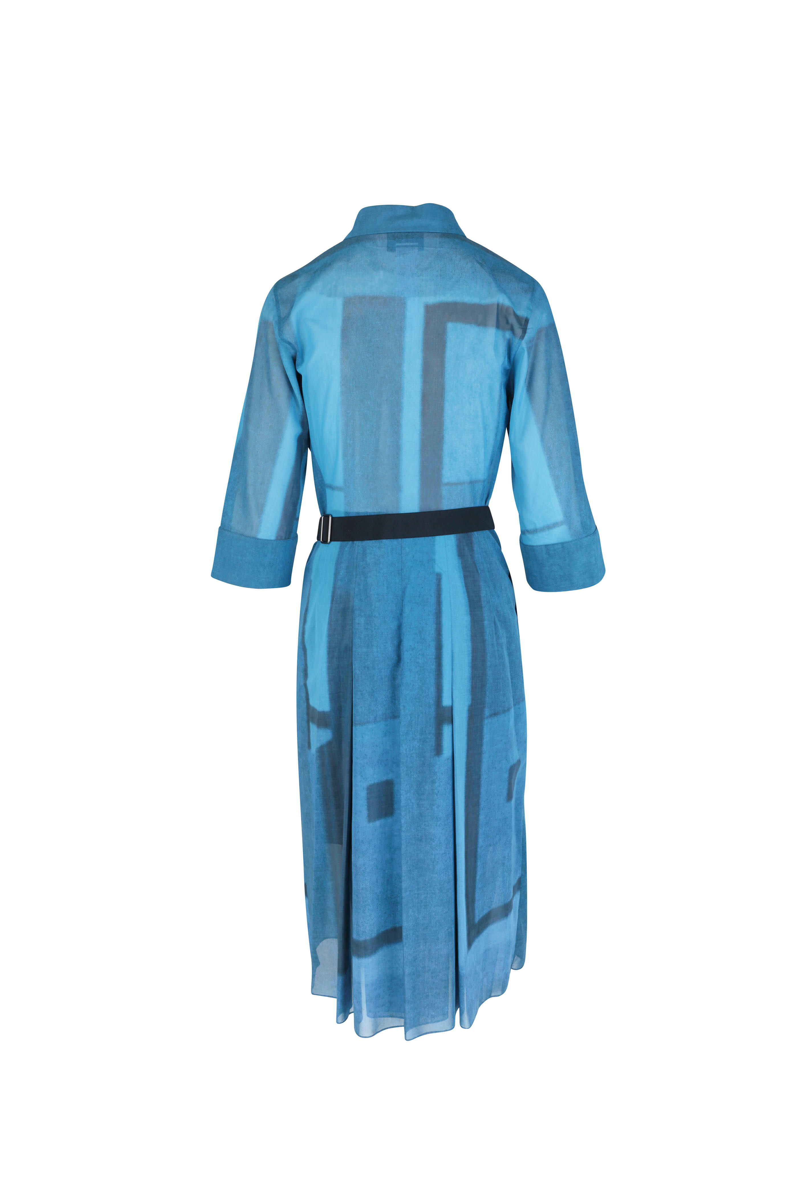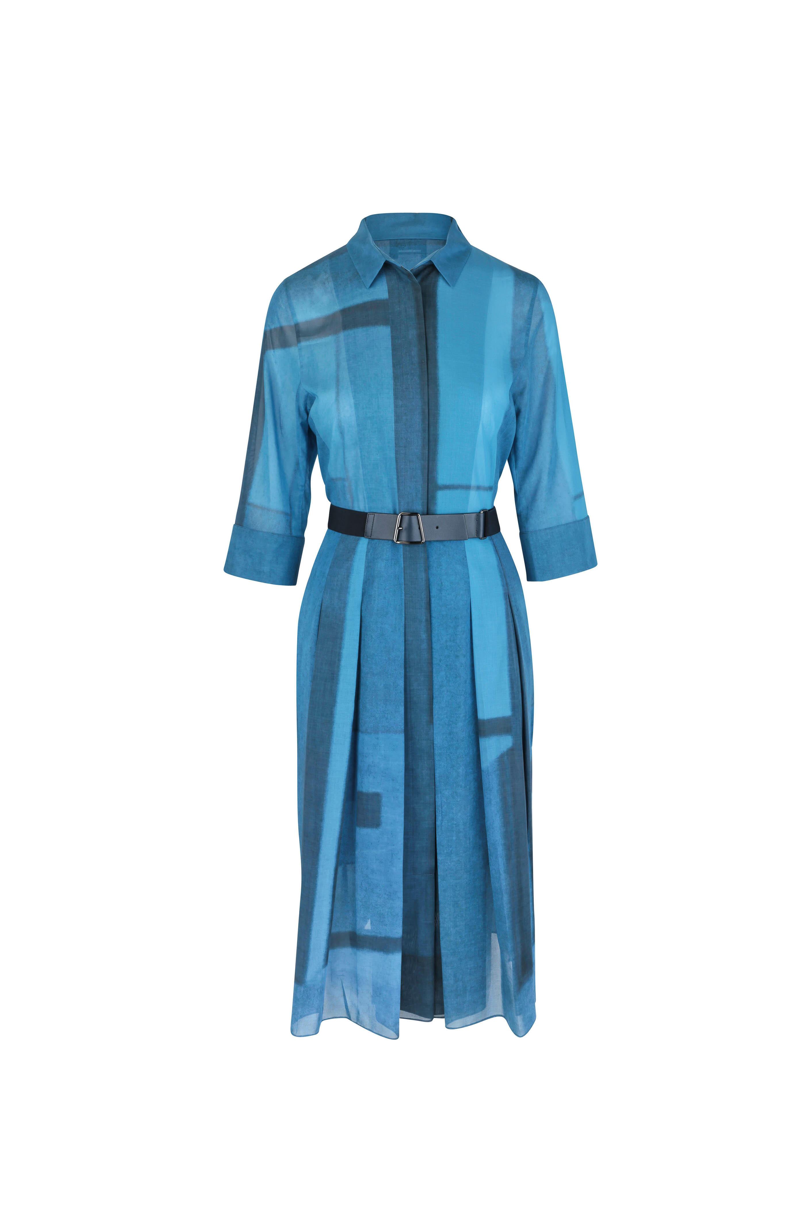 Spread collar. Concealed front button placket. Detachable belt at waist. Pleated skirt. Straight hem. Imported. Shoulder to hem: 46". 100% cotton; partially lined.