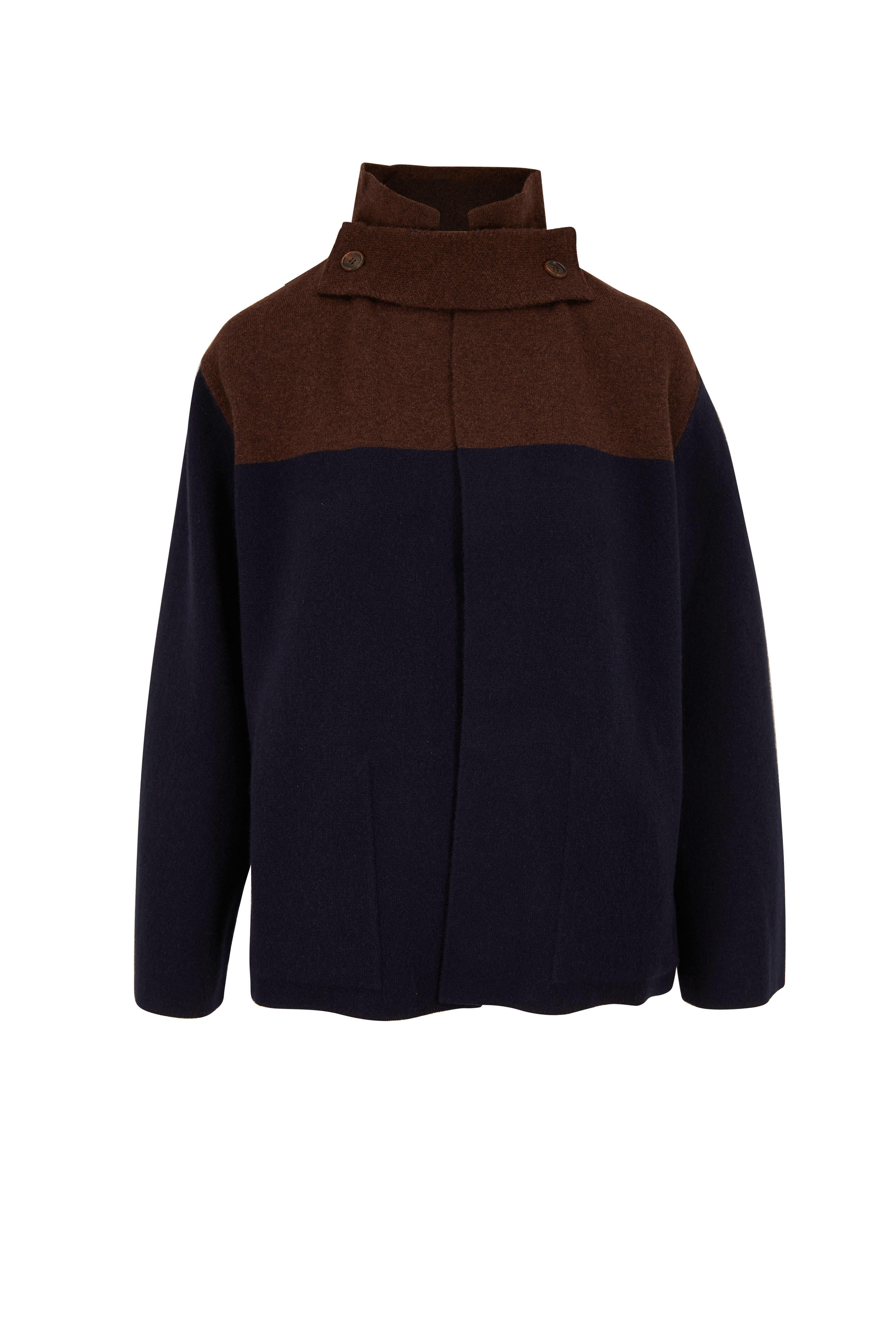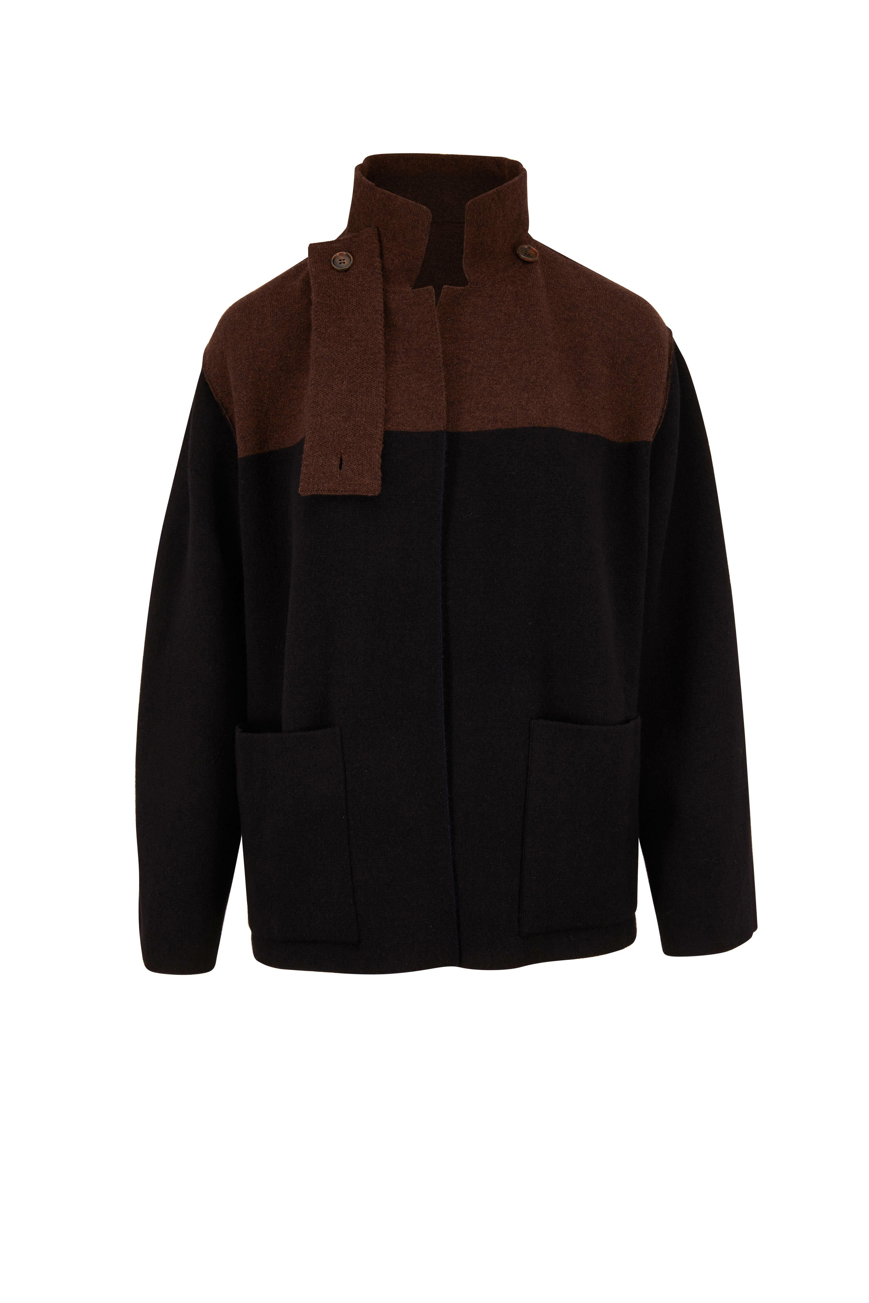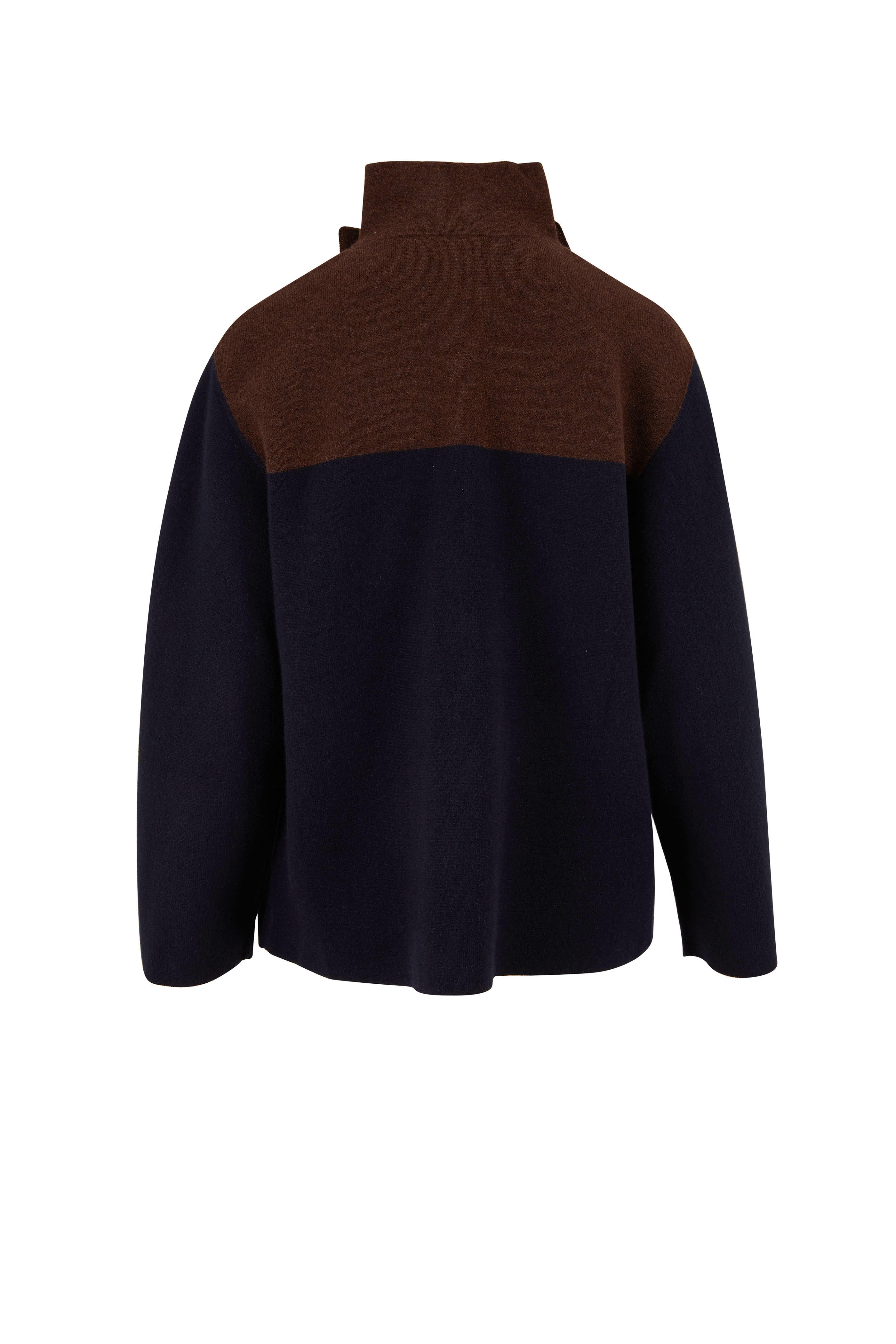 Removable collar. Open front. Lower vertical zip pockets; lower patch pockets. Reversible. Imported. 100% cashmere. Dry clean.