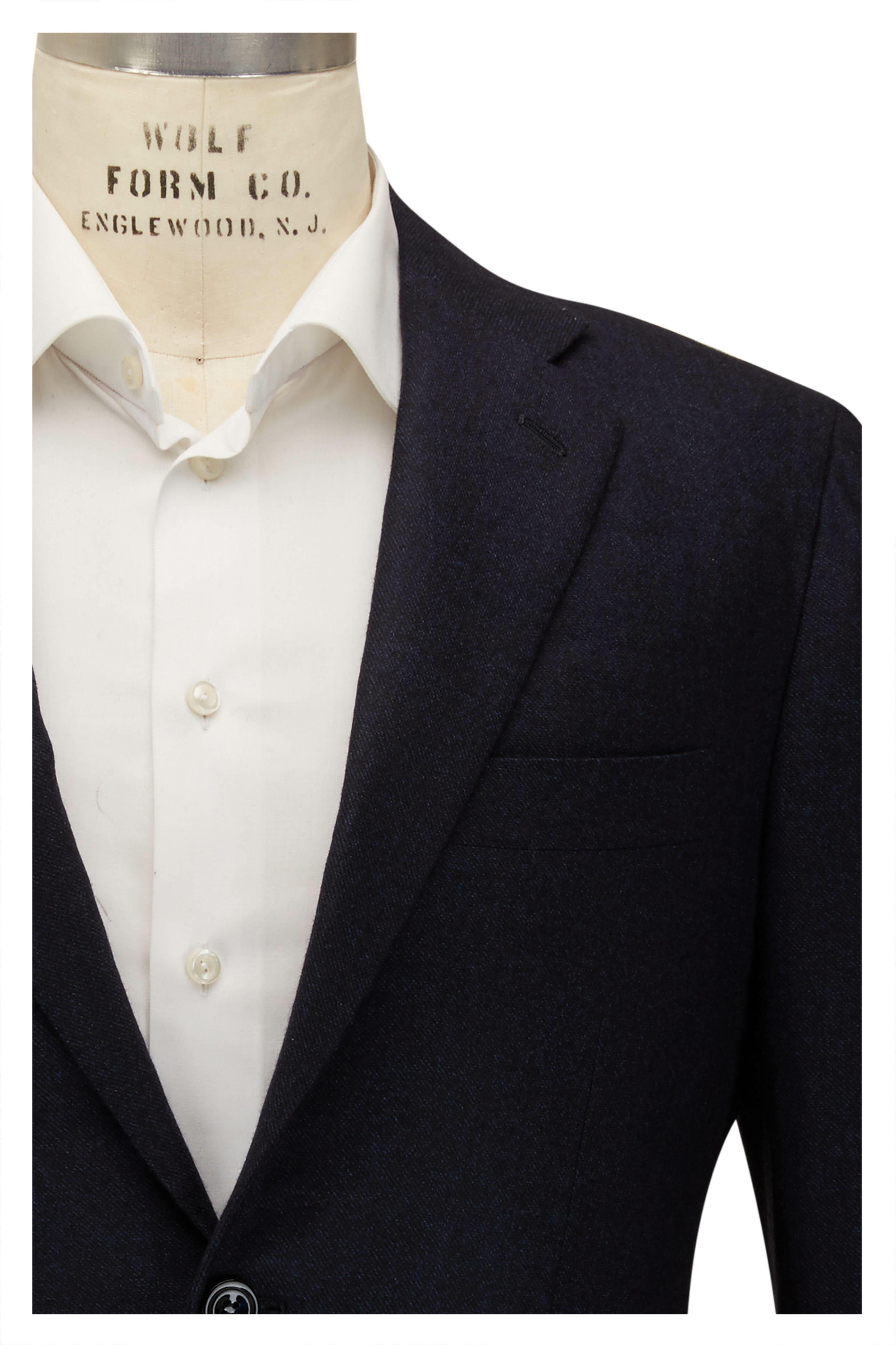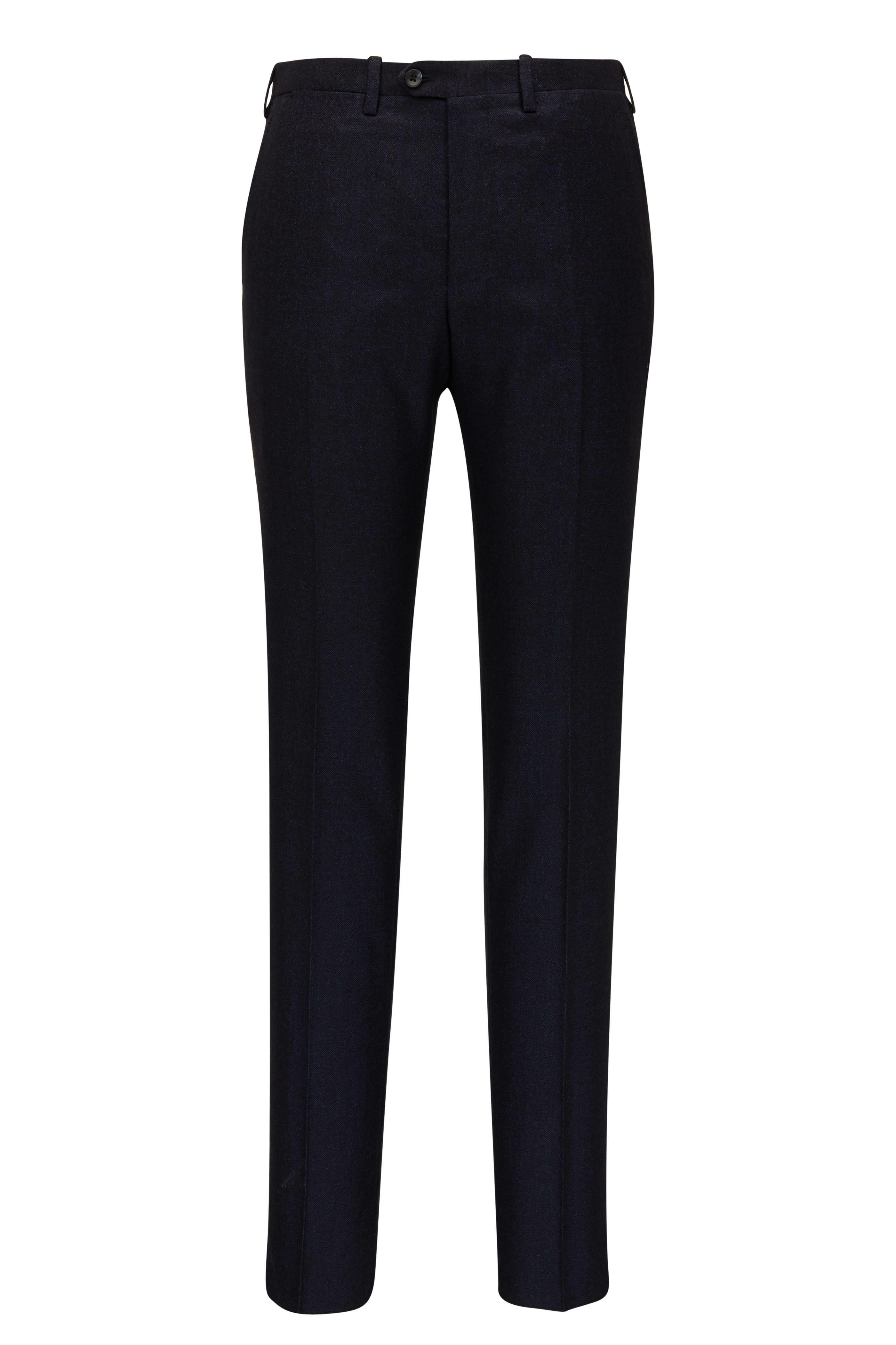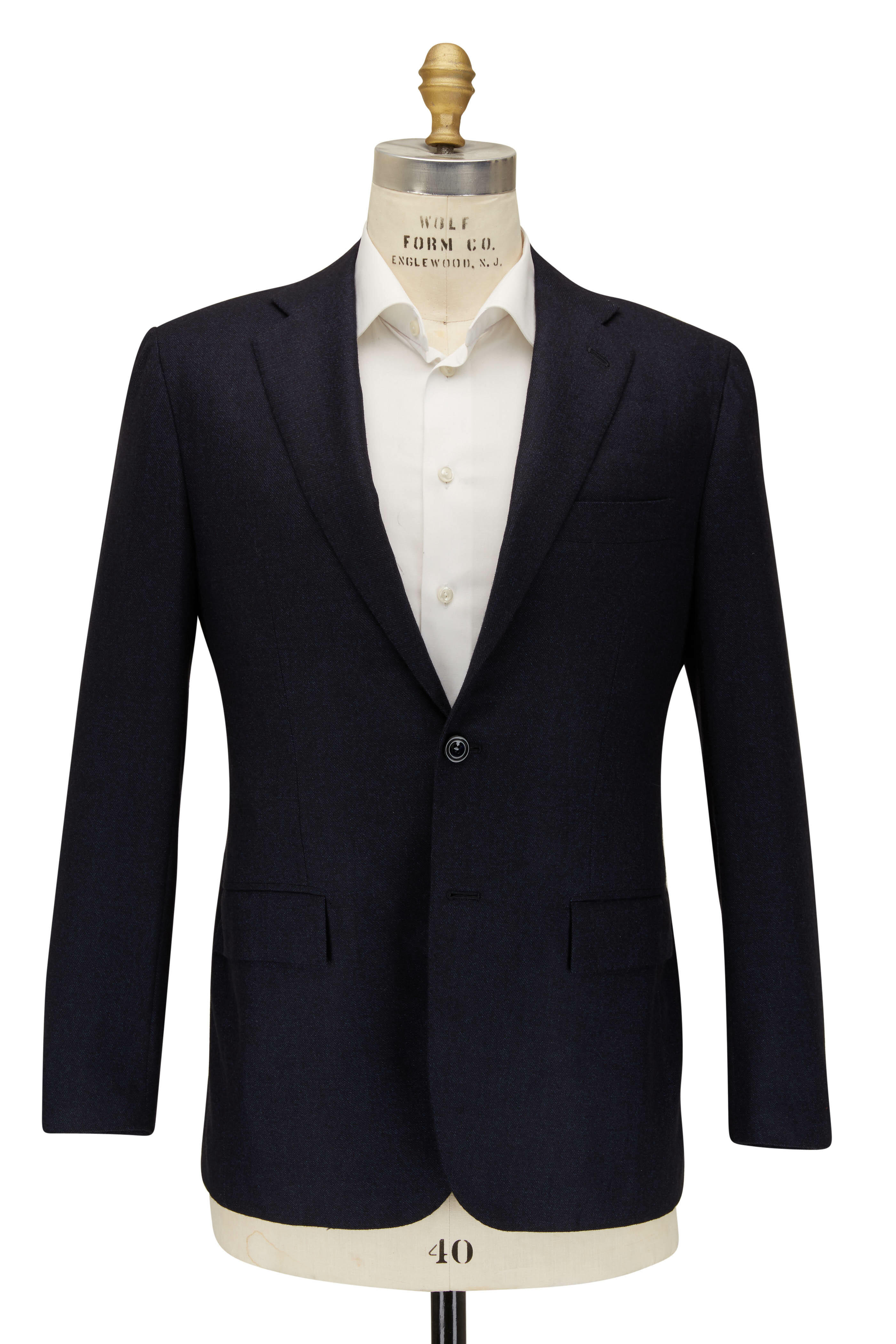Made in Italy. Jacket: Fully lined. Notched lapels. Two button closure. Lower flap pockets; chest welt pocket. Double vent. Pant: Banded waist; belt loops. Front slip pockets, ticket pocket, back besom pockets. Unfinished hem. 100% cashmere. Dry clean.