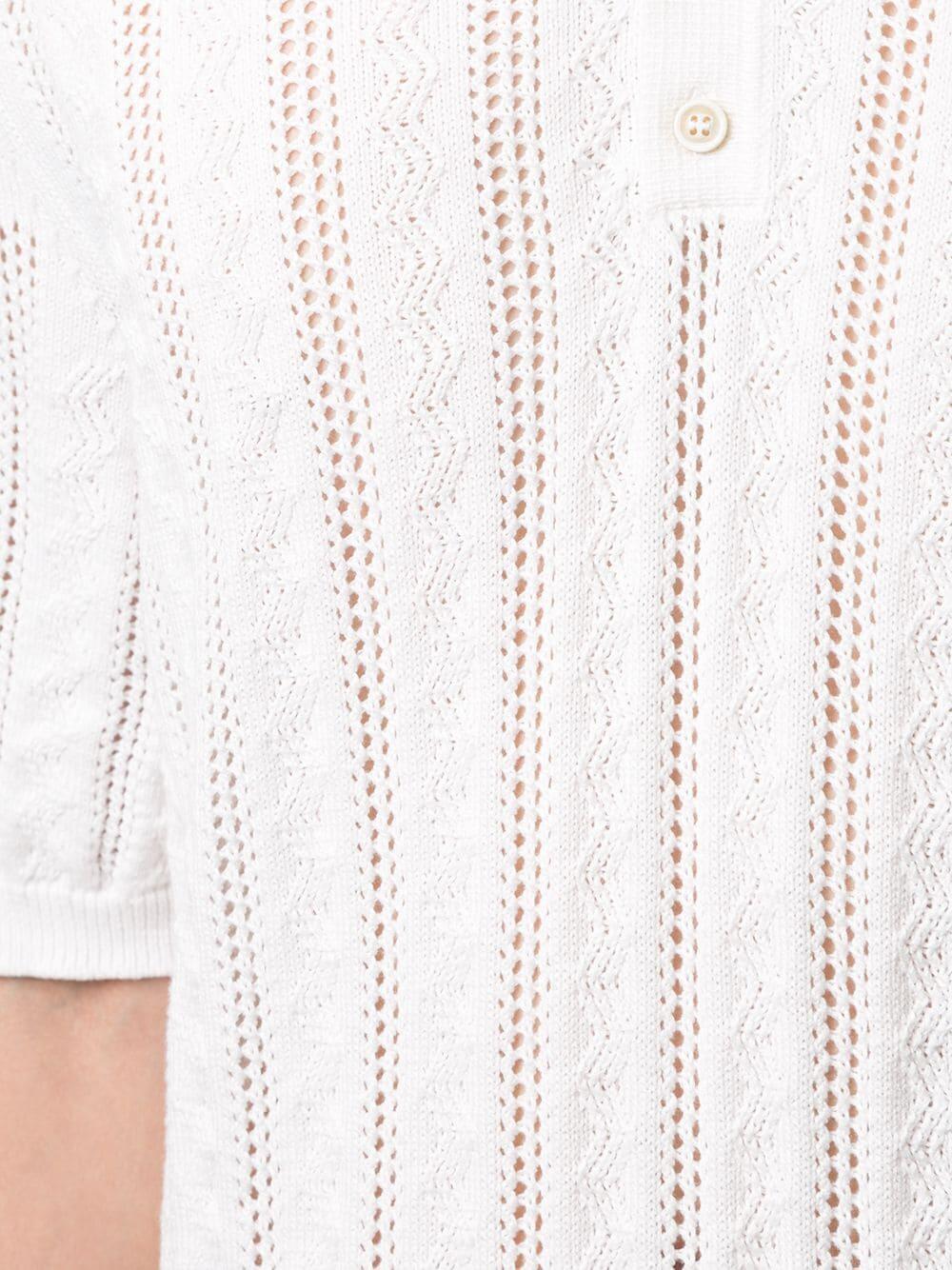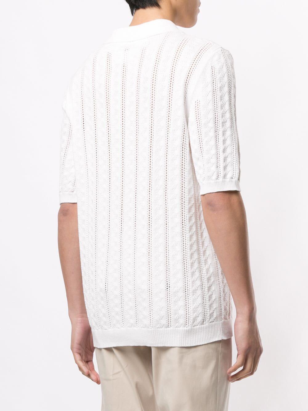 Spread collar. Three-button placket. Ribbed trim. Imported. 100% cotton. Dry clean.