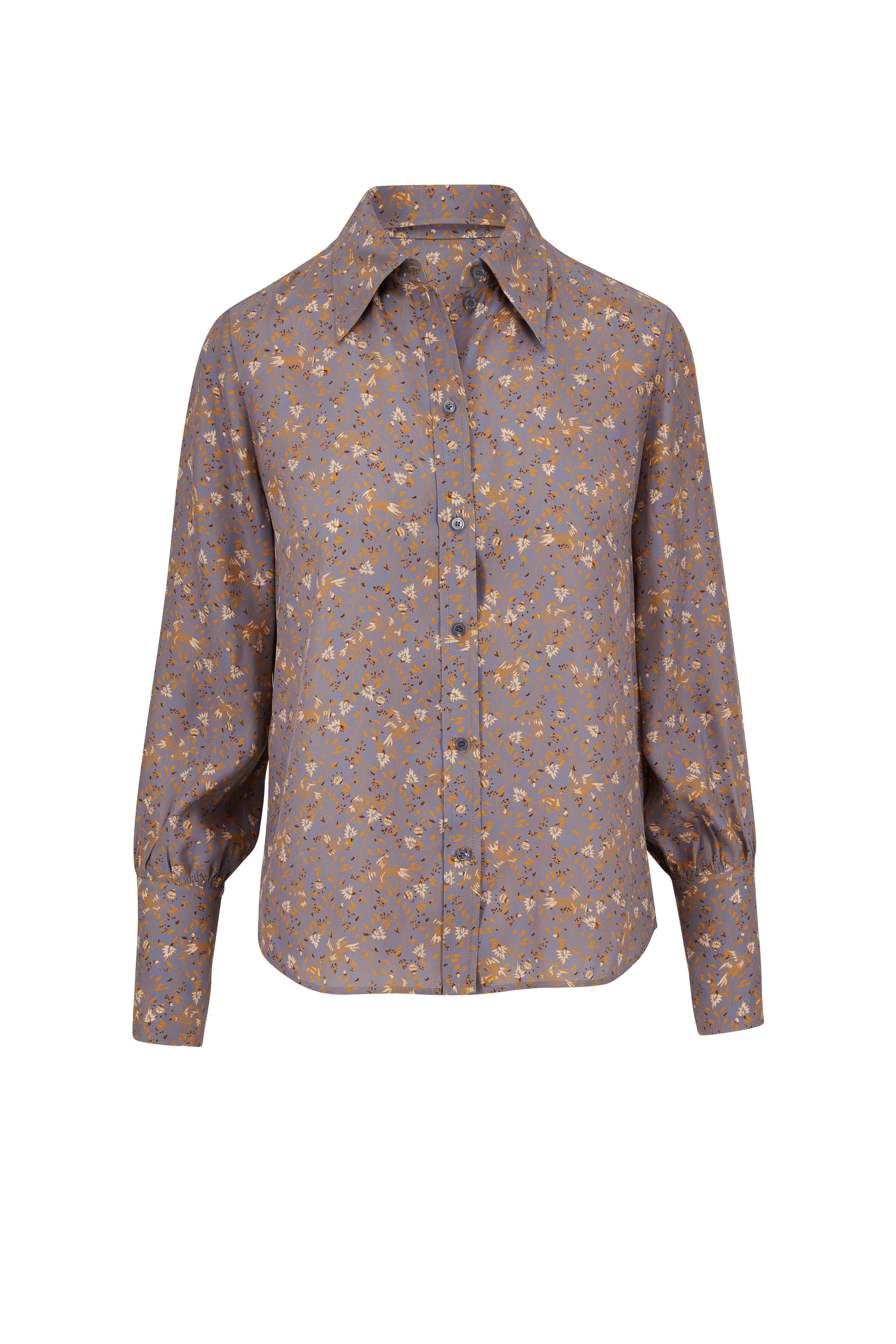 Pointed collar. Button front placket. Two-button extended cuffs. Curved hem. Made in Madagascar. 100% silk. Dry clean.