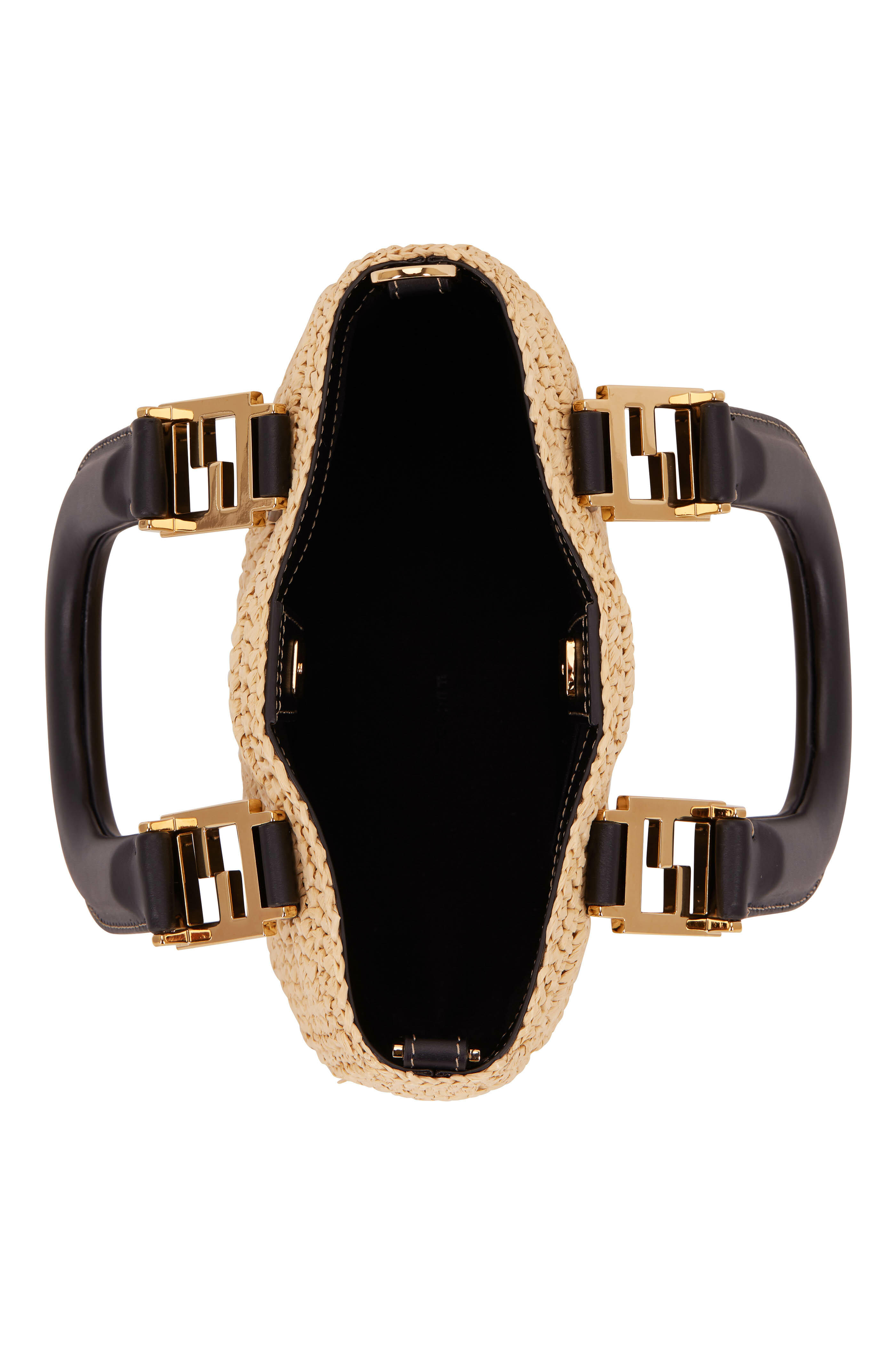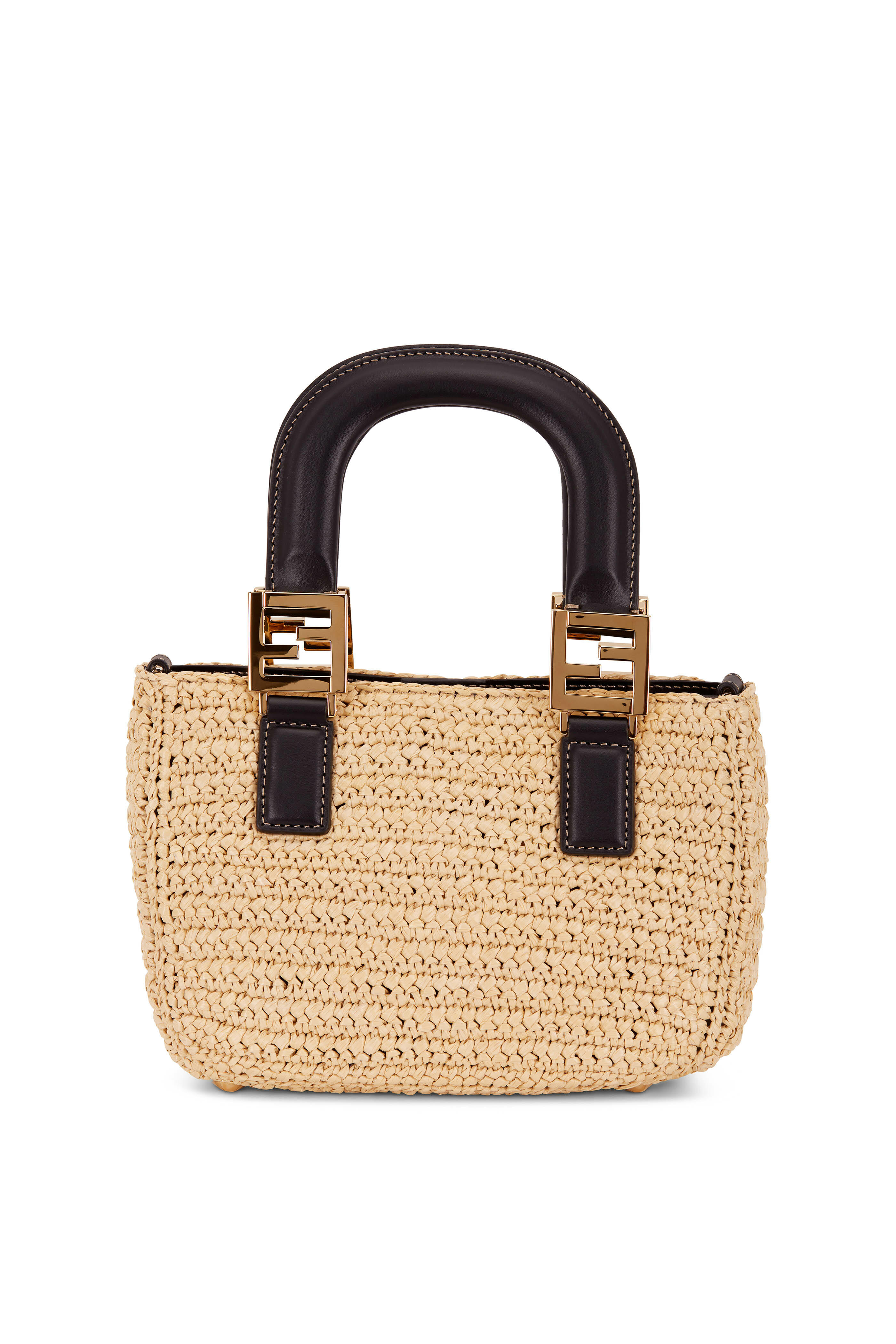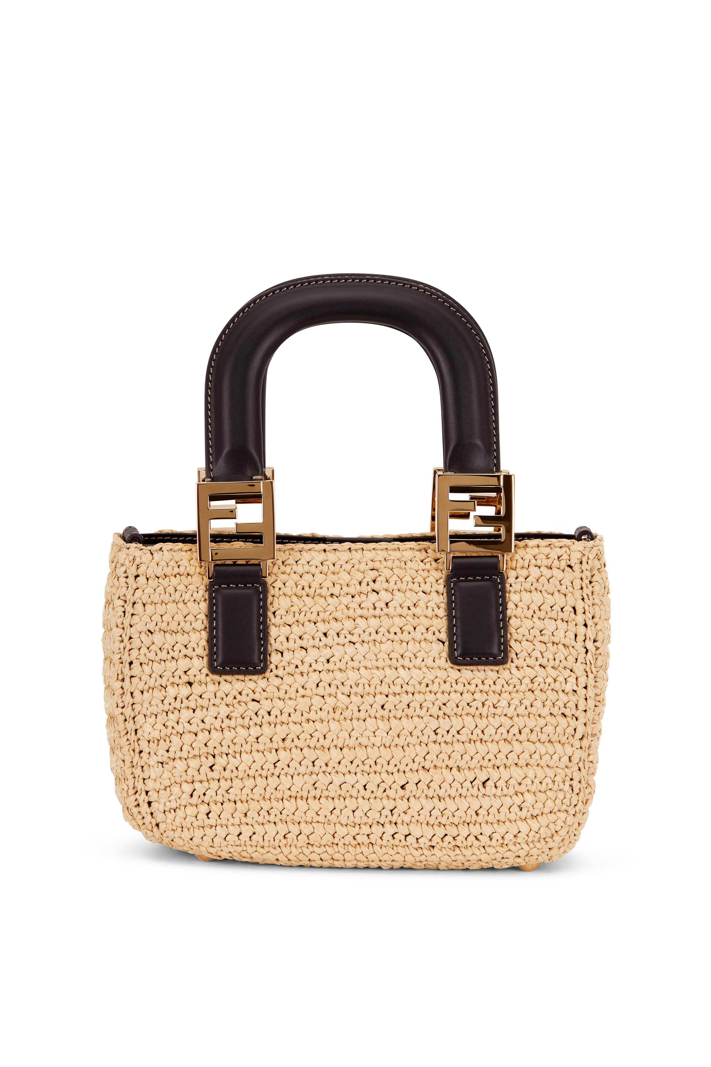 Raffia. Smooth leather top handles. Removable shoulder strap. Interior card slot. Gold-toned logo hardware. Made in Italy. Height: 5.5". Width: 8.6". Depth: 3.3". Handle Drop: 3.5". Max. Strap Length: 45.6".