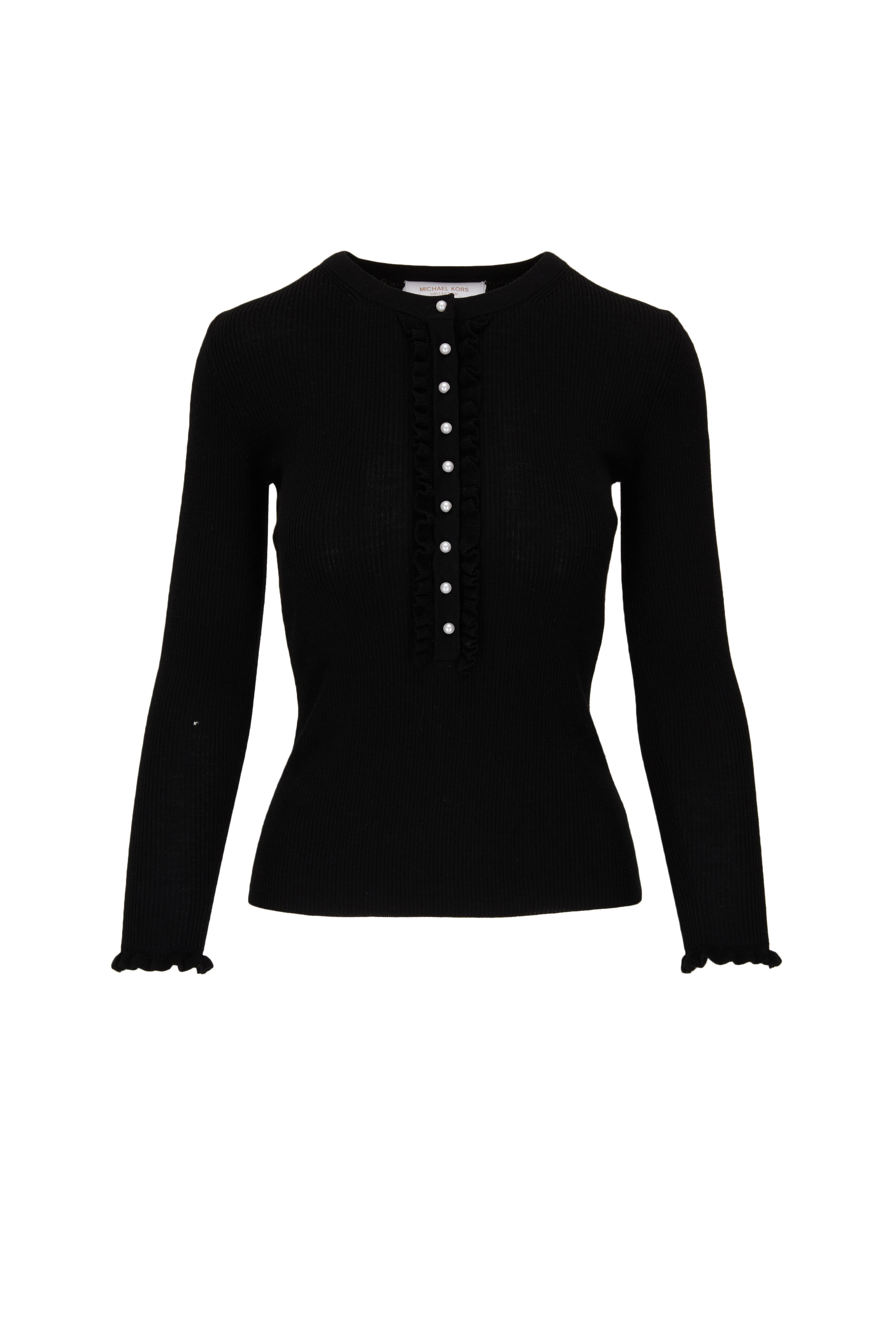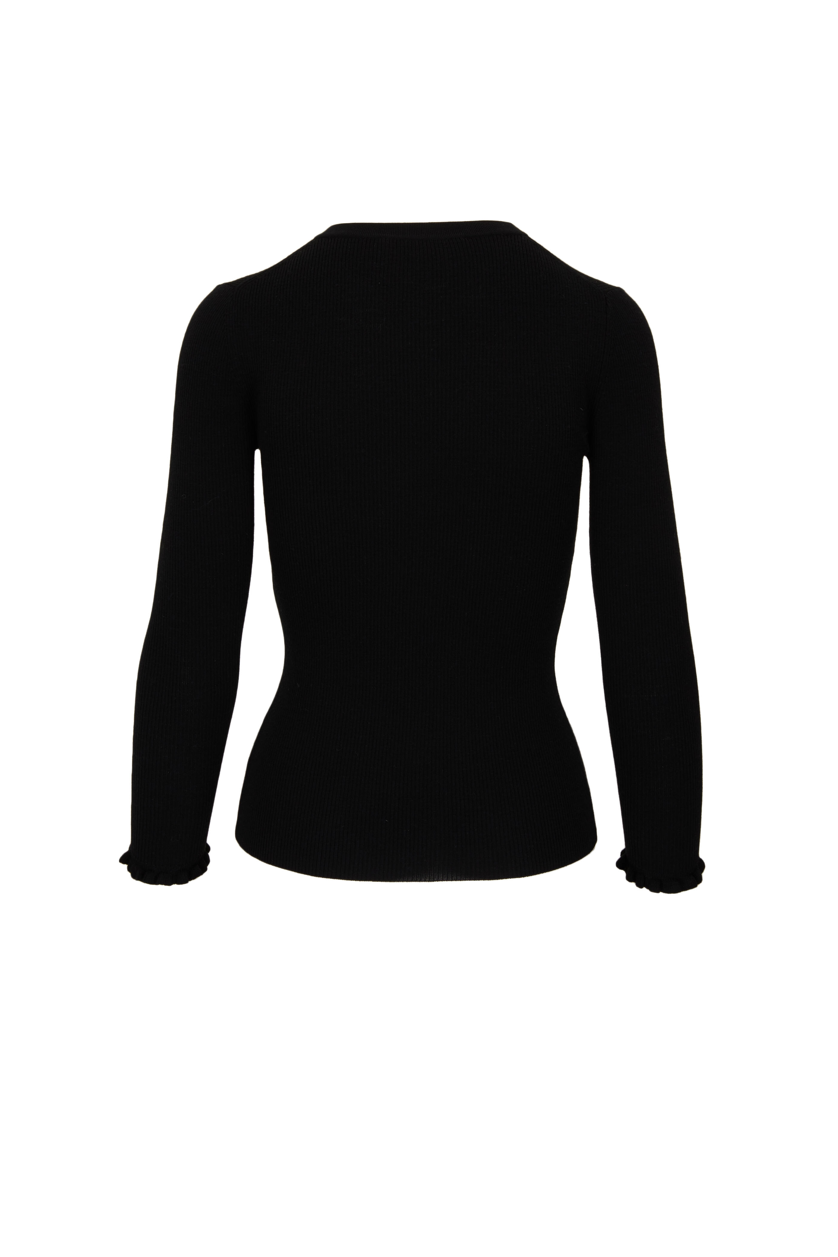 Black Ribbed Merino Wool Ruffle Pearl Henley