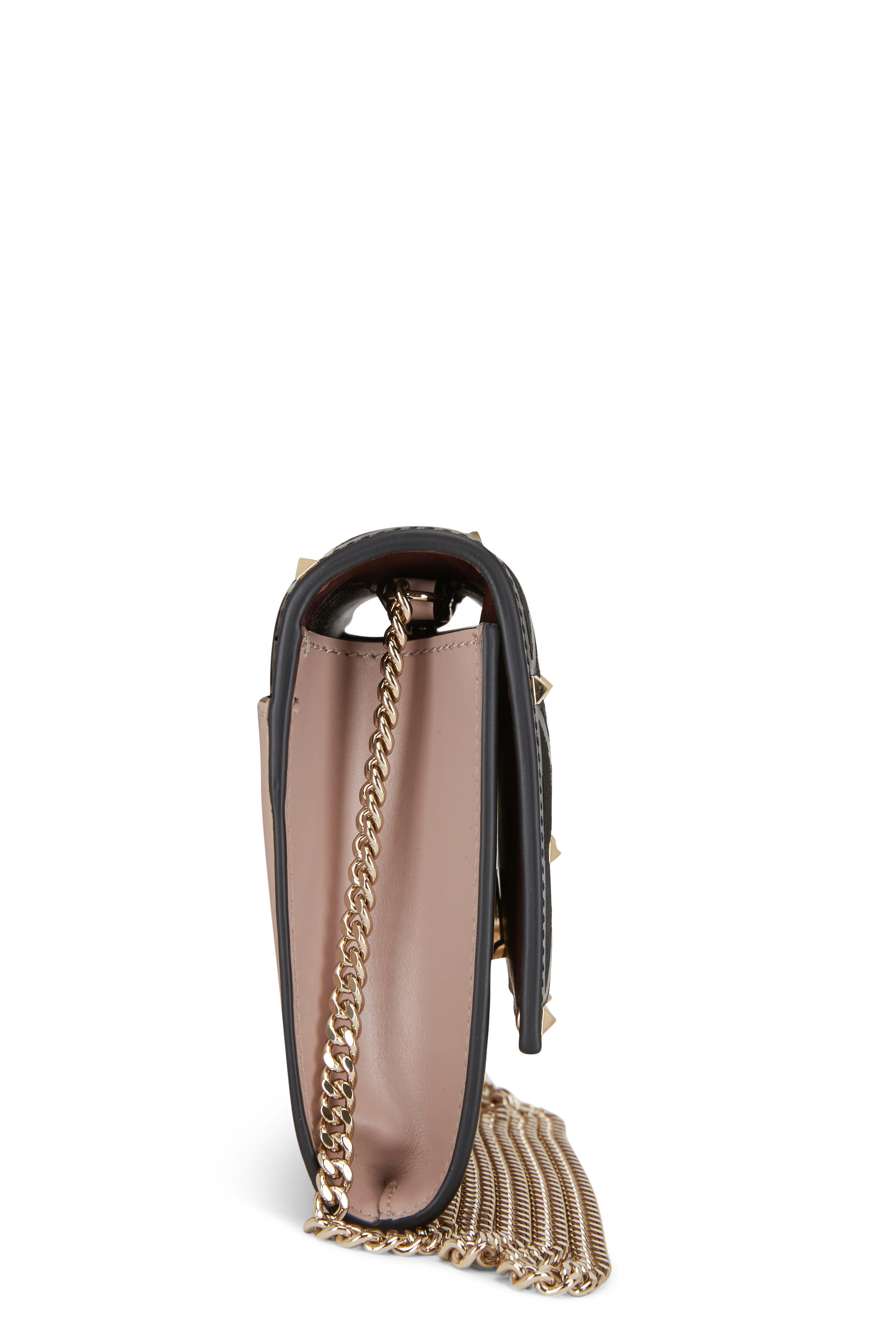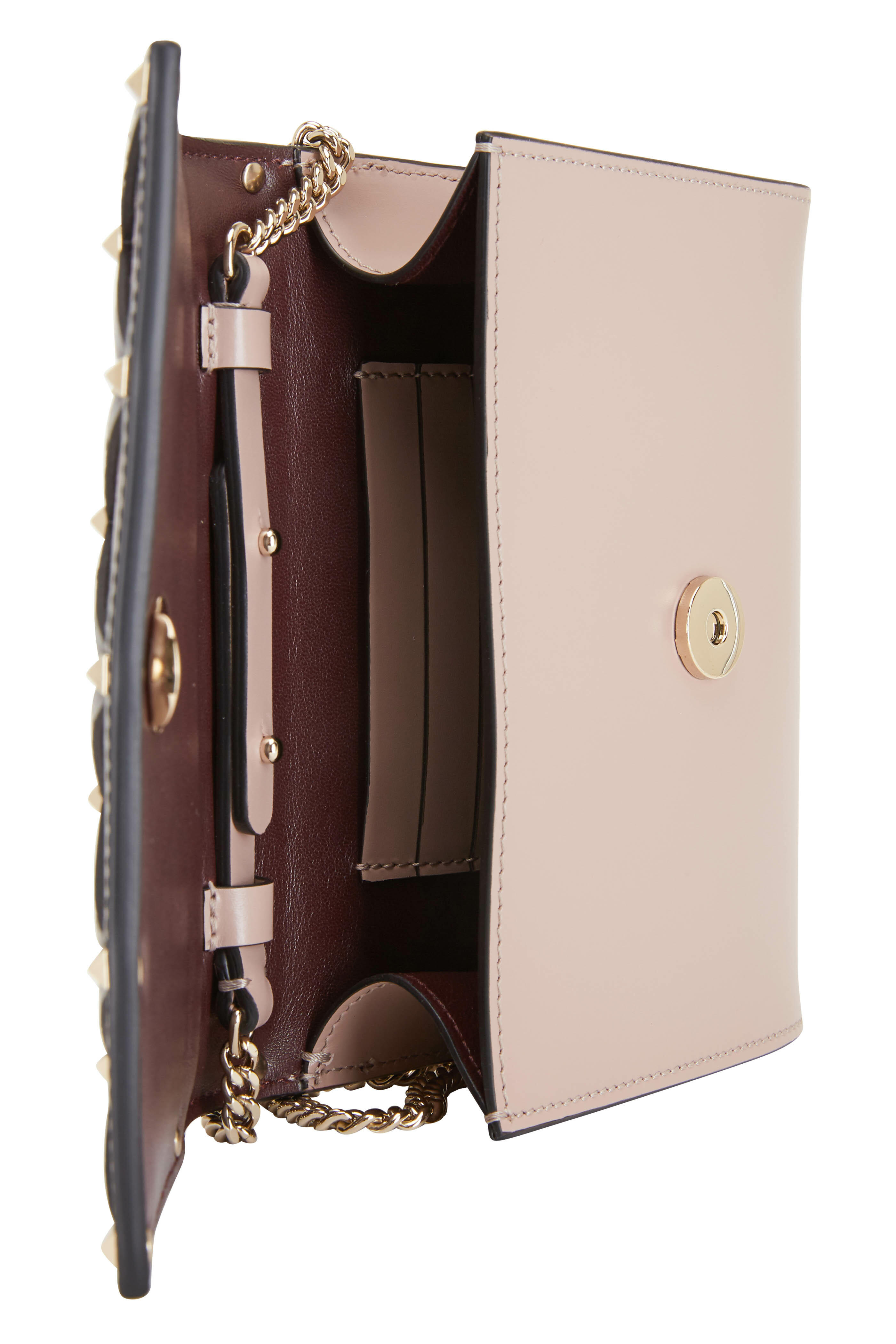 Calfskin leather. Magnetic clasp closure. Four card slots. Detachable chain strap. Platinum-finish studs & hardware. Made in Italy. Width: 6.5". Height: 5.1". Depth: 2".