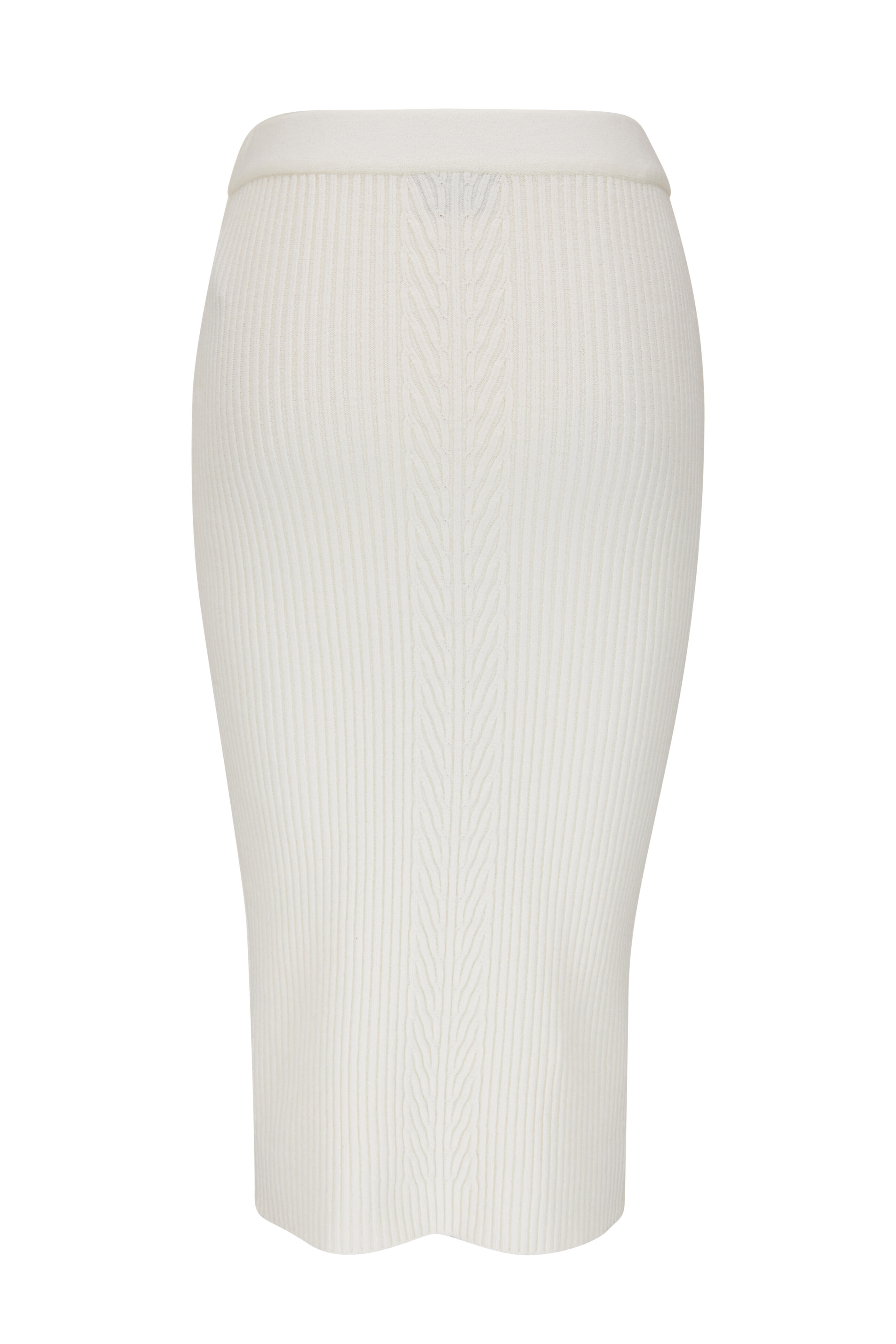 Off-center front zip closure. Side zip pocket. Made in Italy. High-rise. Below knee length. 87% virgin wool, 13% polyester. Dry clean.