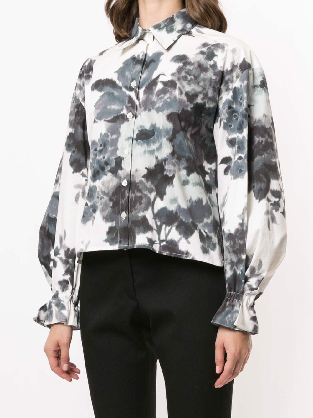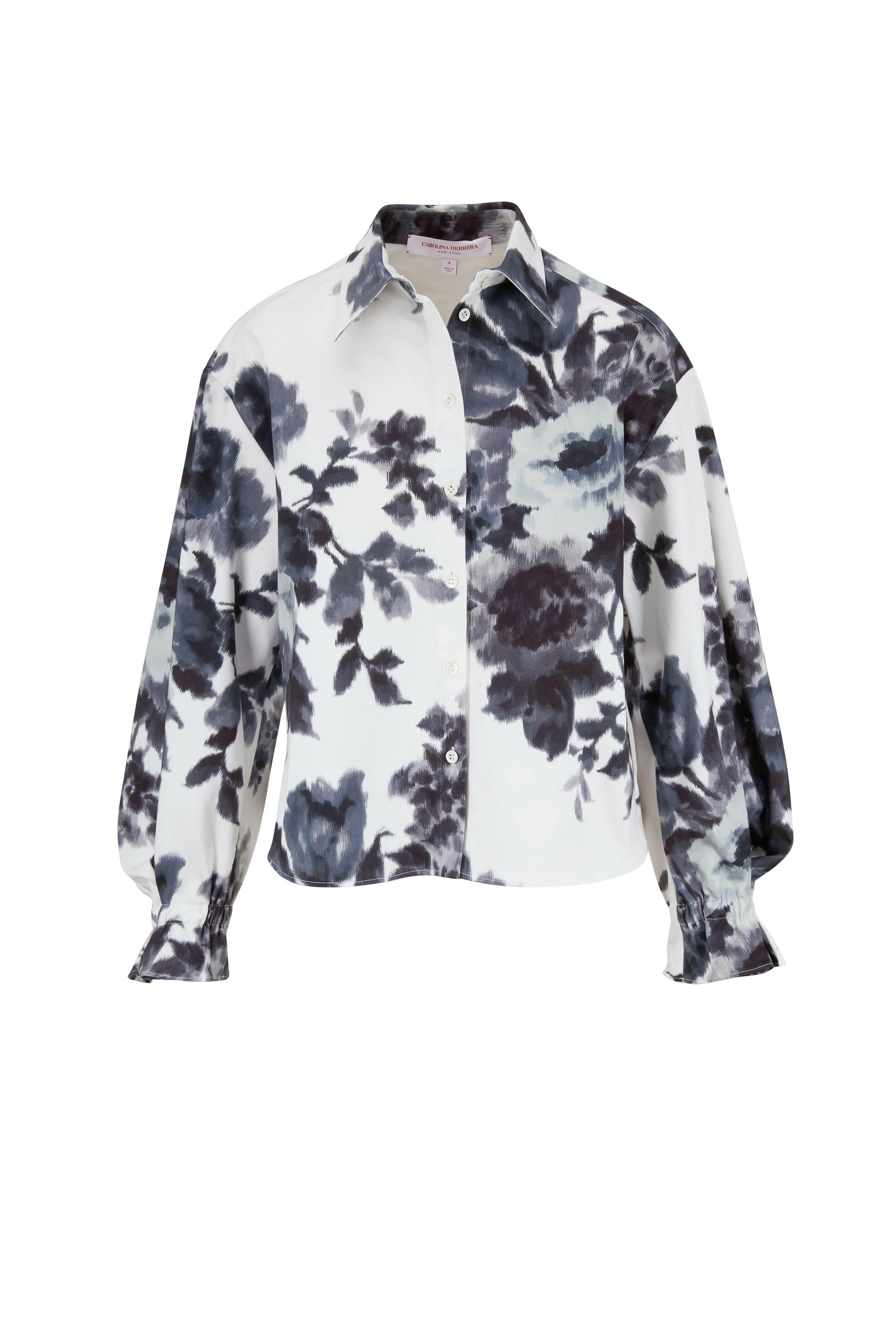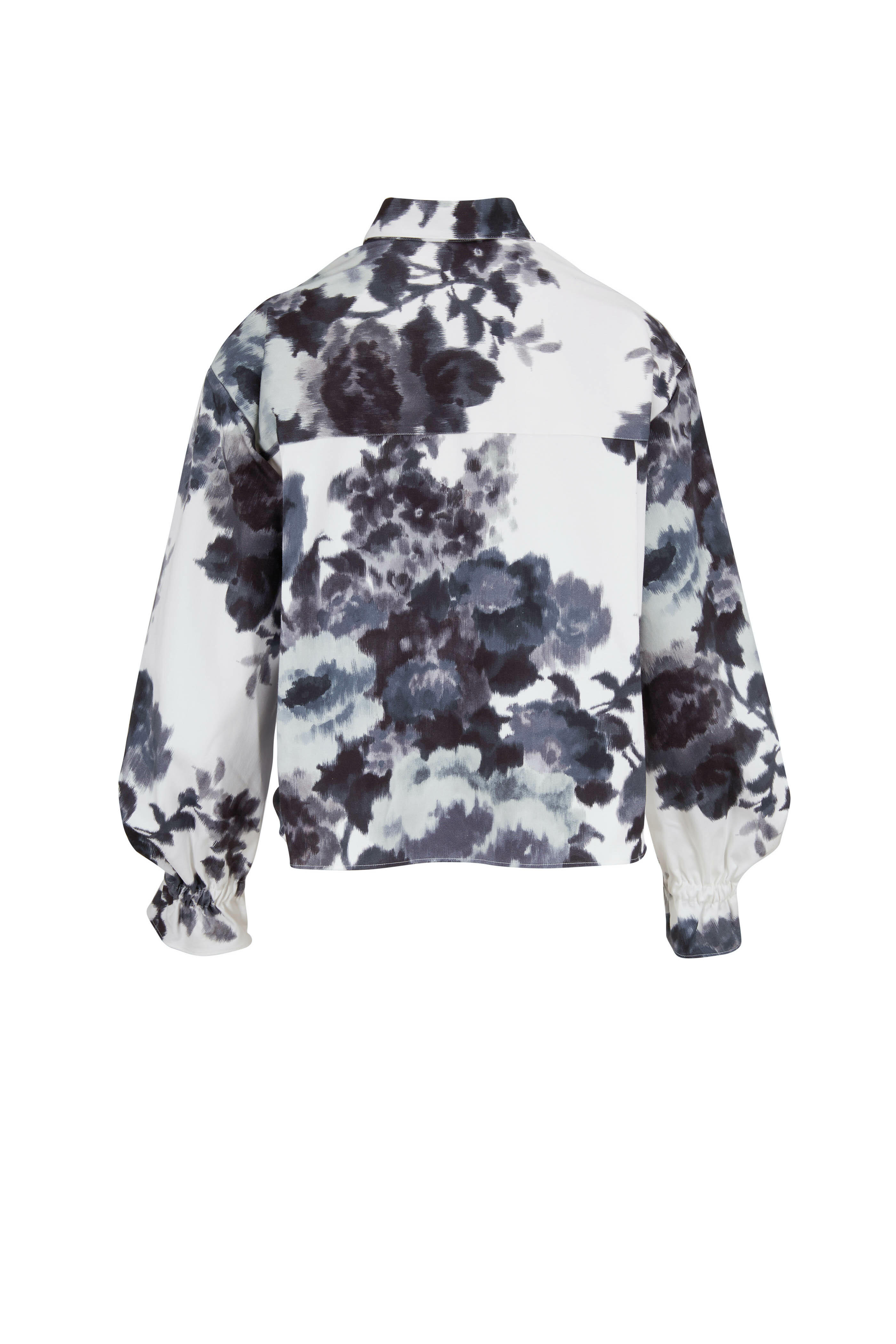 Spread collar. Button front. Puff sleeves. Straight hem. Made in the USA. Cropped & boxy fit. 97% cotton, 3% elastane. Dry clean.
