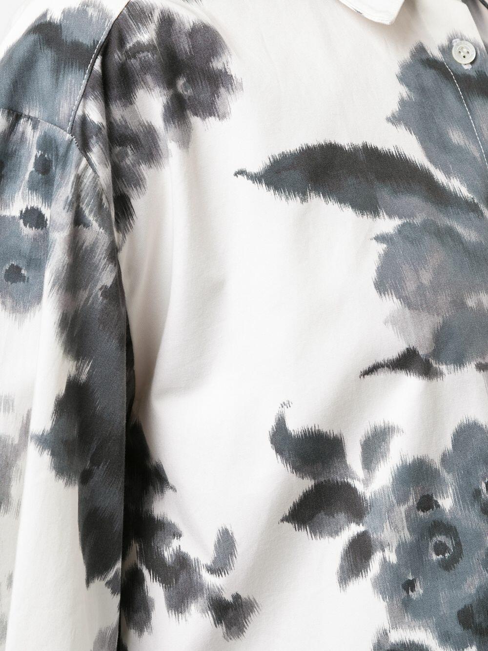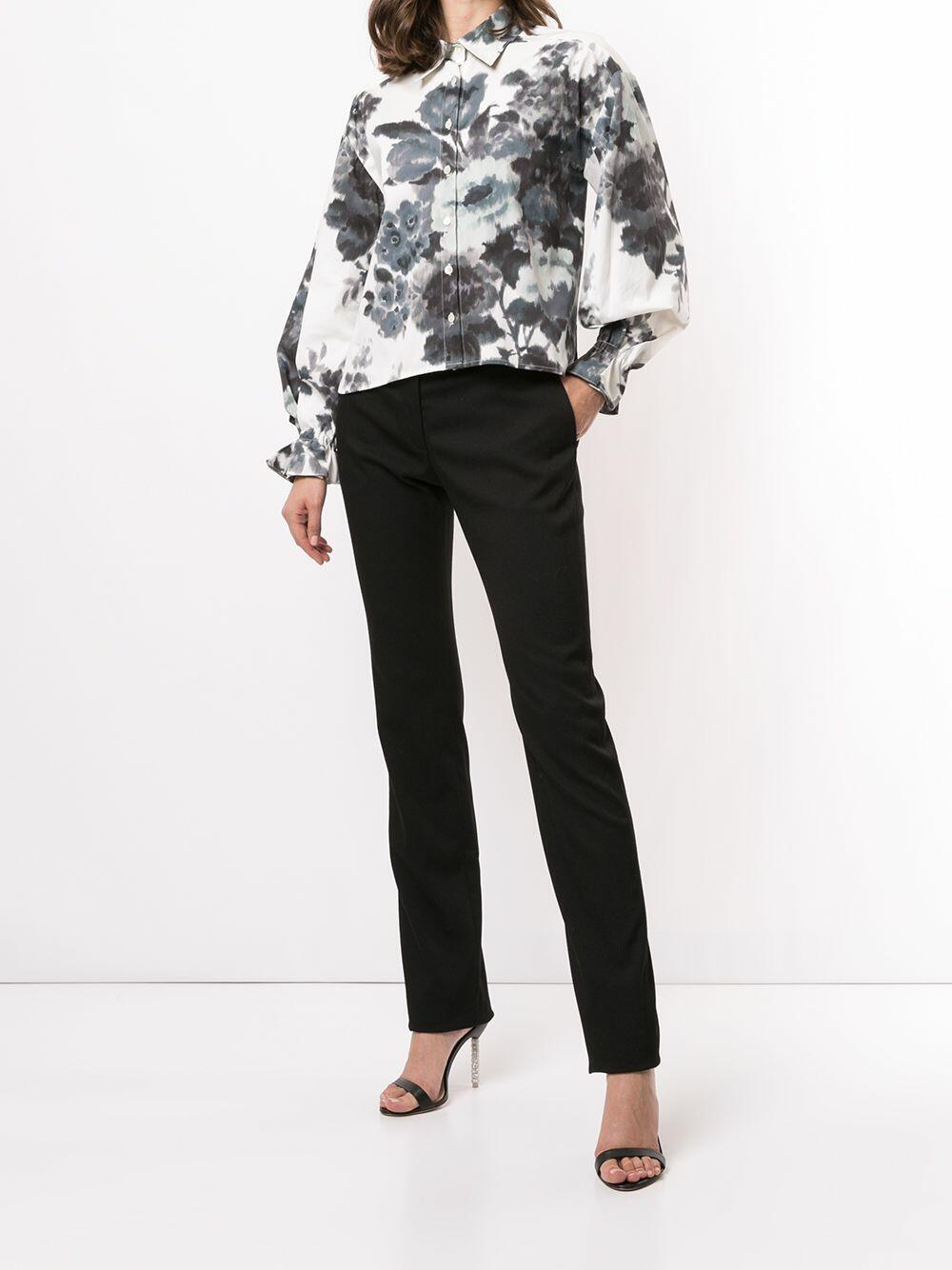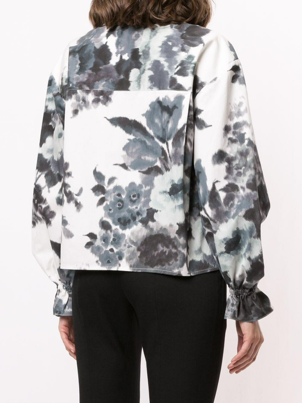 Spread collar. Button front. Puff sleeves. Straight hem. Made in the USA. Cropped & boxy fit. 97% cotton, 3% elastane. Dry clean.