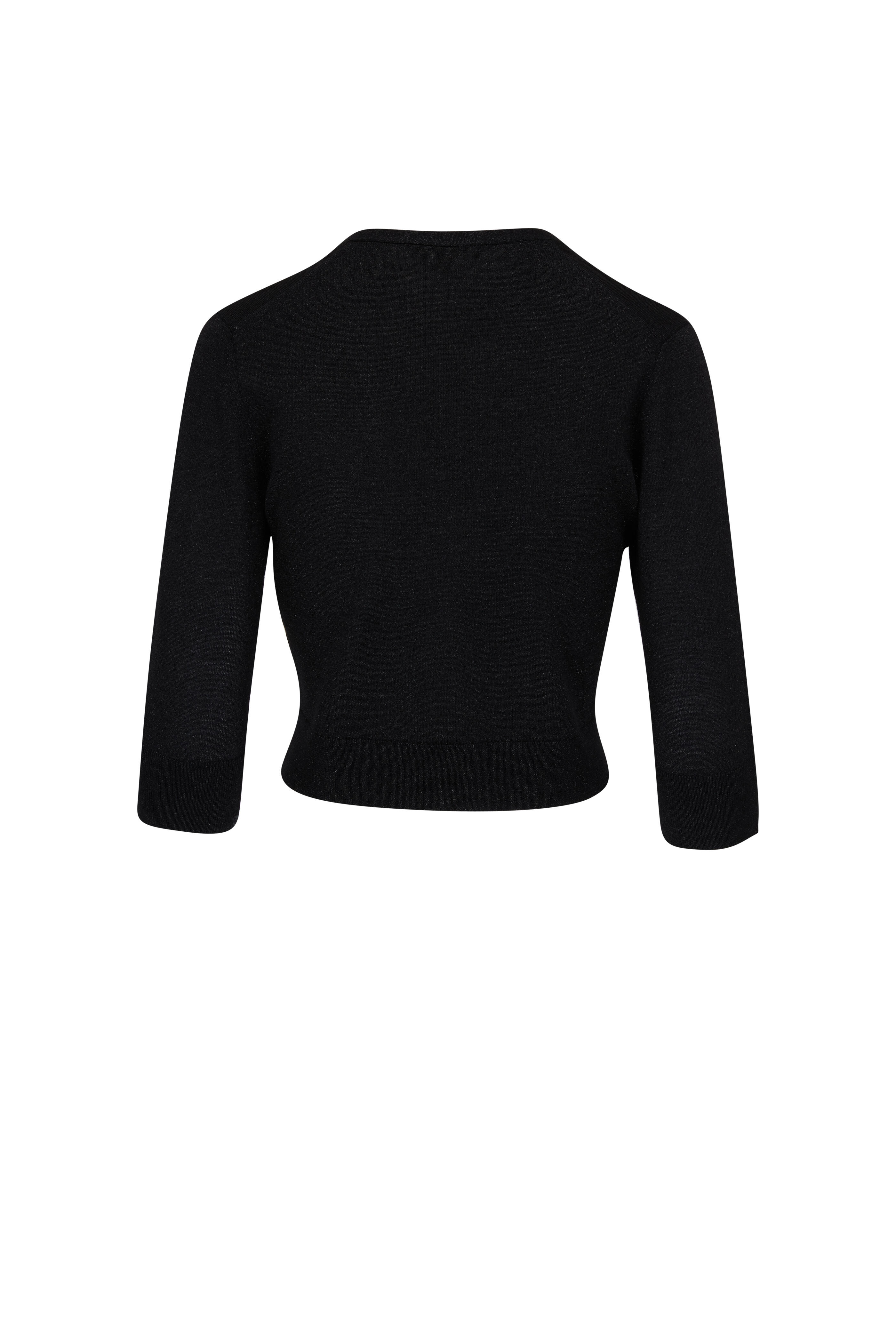 V-neckline. Single button front closure. Three-quarter sleeves. Ribbed trim. Side slits at hem. Imported. 73% wool, 23% polyester. Dry clean.