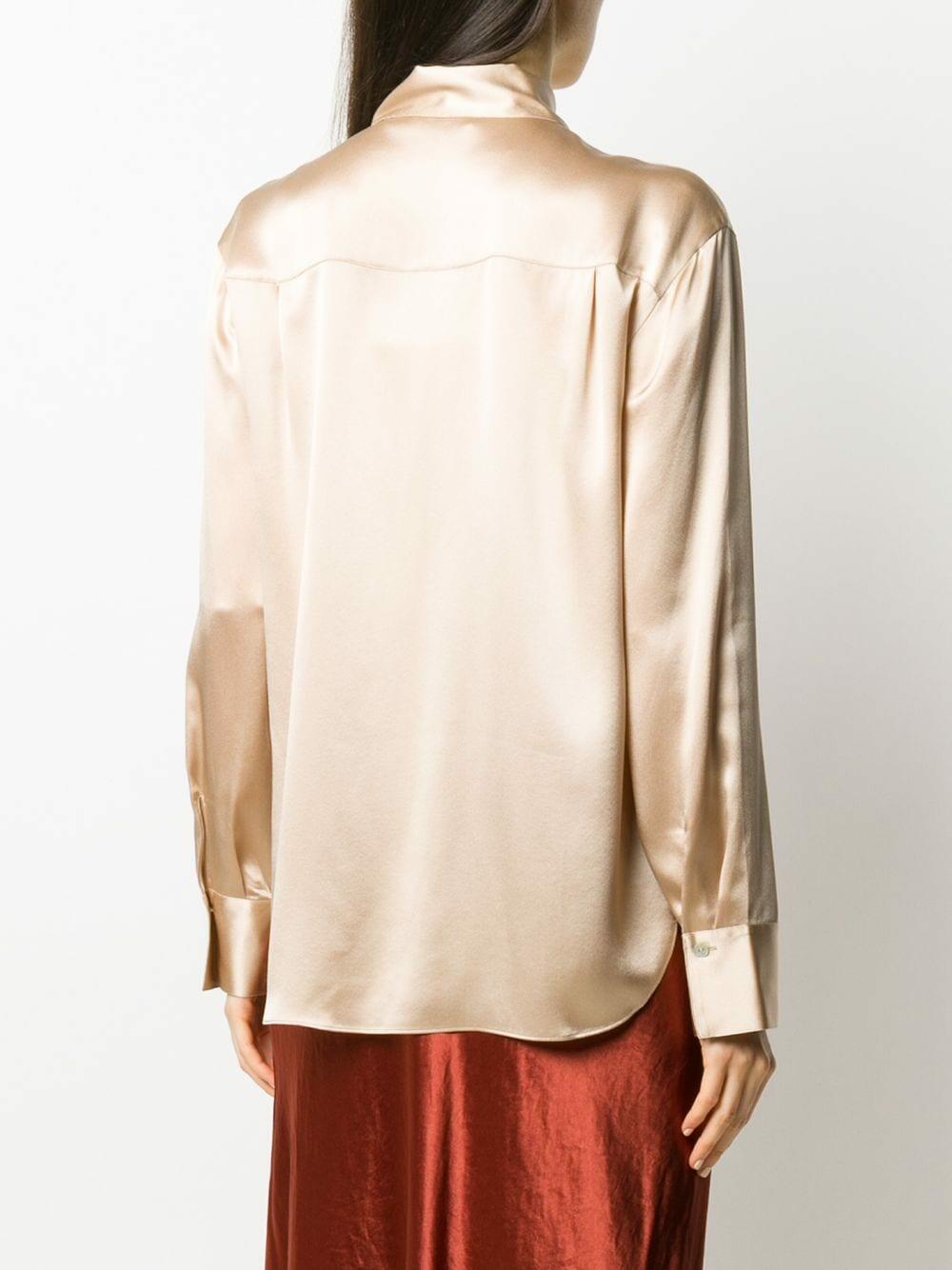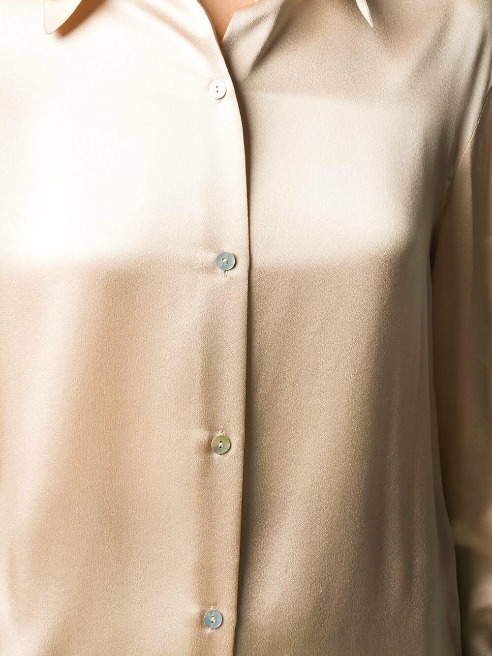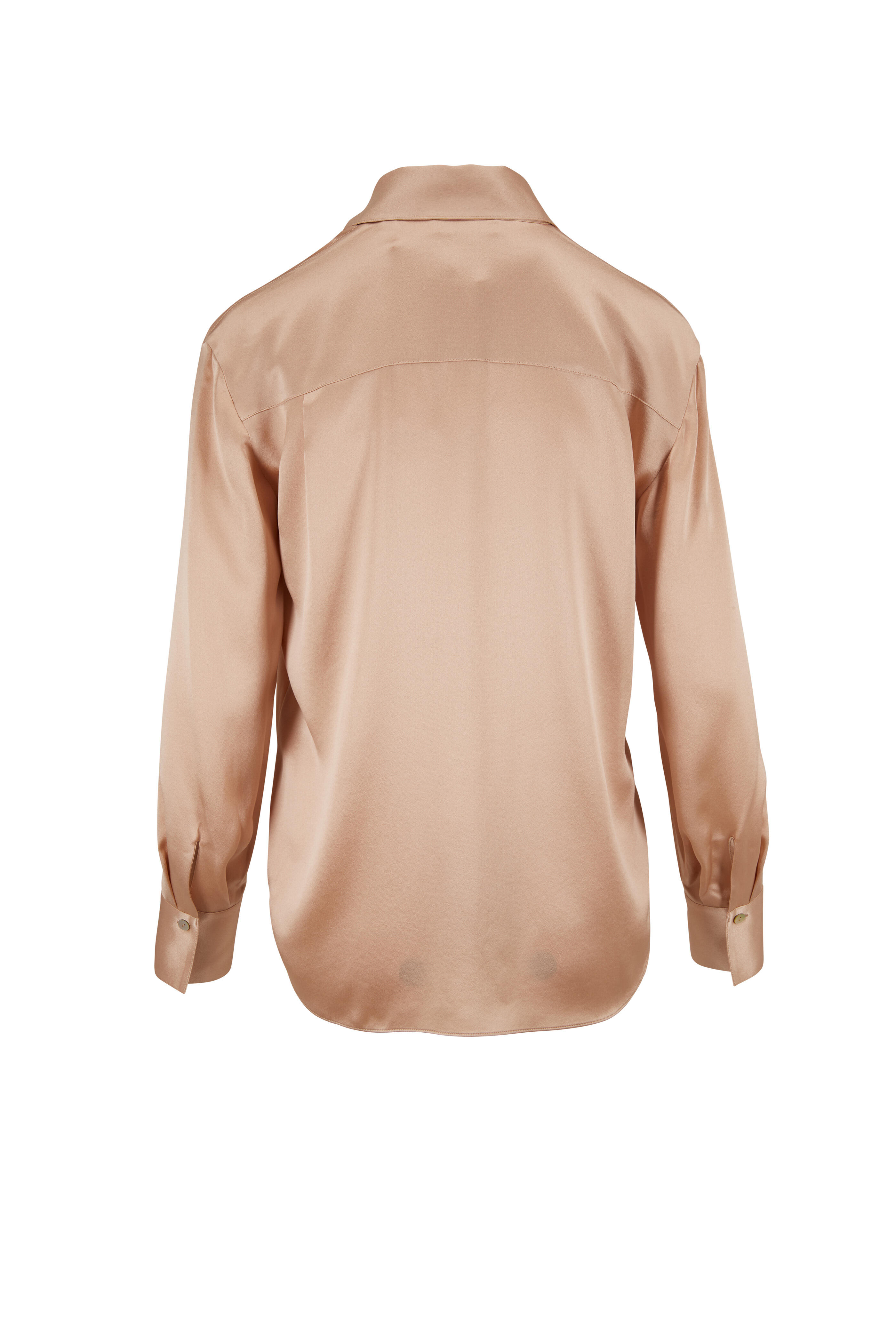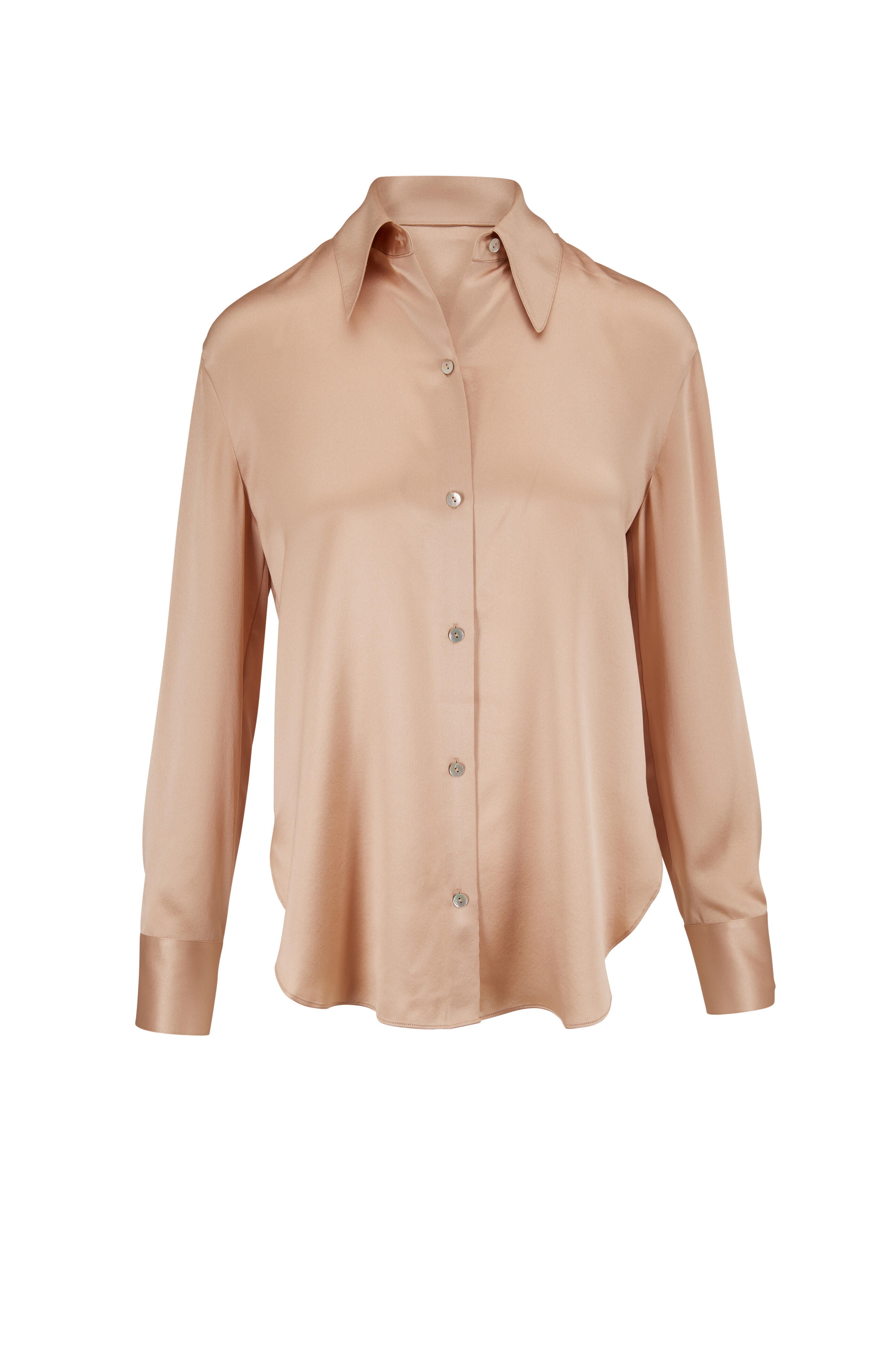 Extended pointed collar. Button front placket. Single button cuffs. Imported. 100% silk. Dry clean.