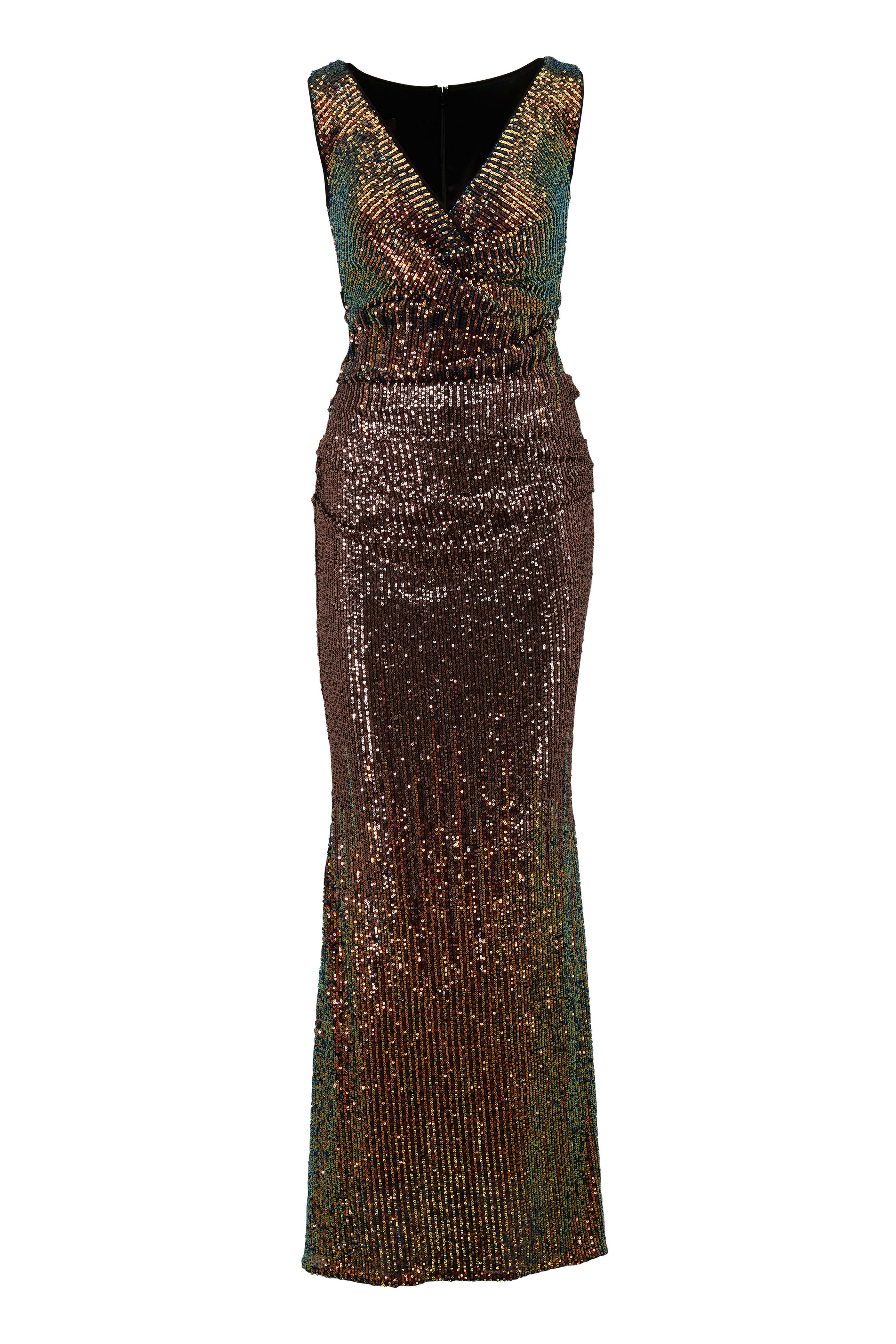 Wet clean. V-neckline. Concealed back zip. All over sequin detailing. Made in Germany. 85% cupro, 15% elastane.