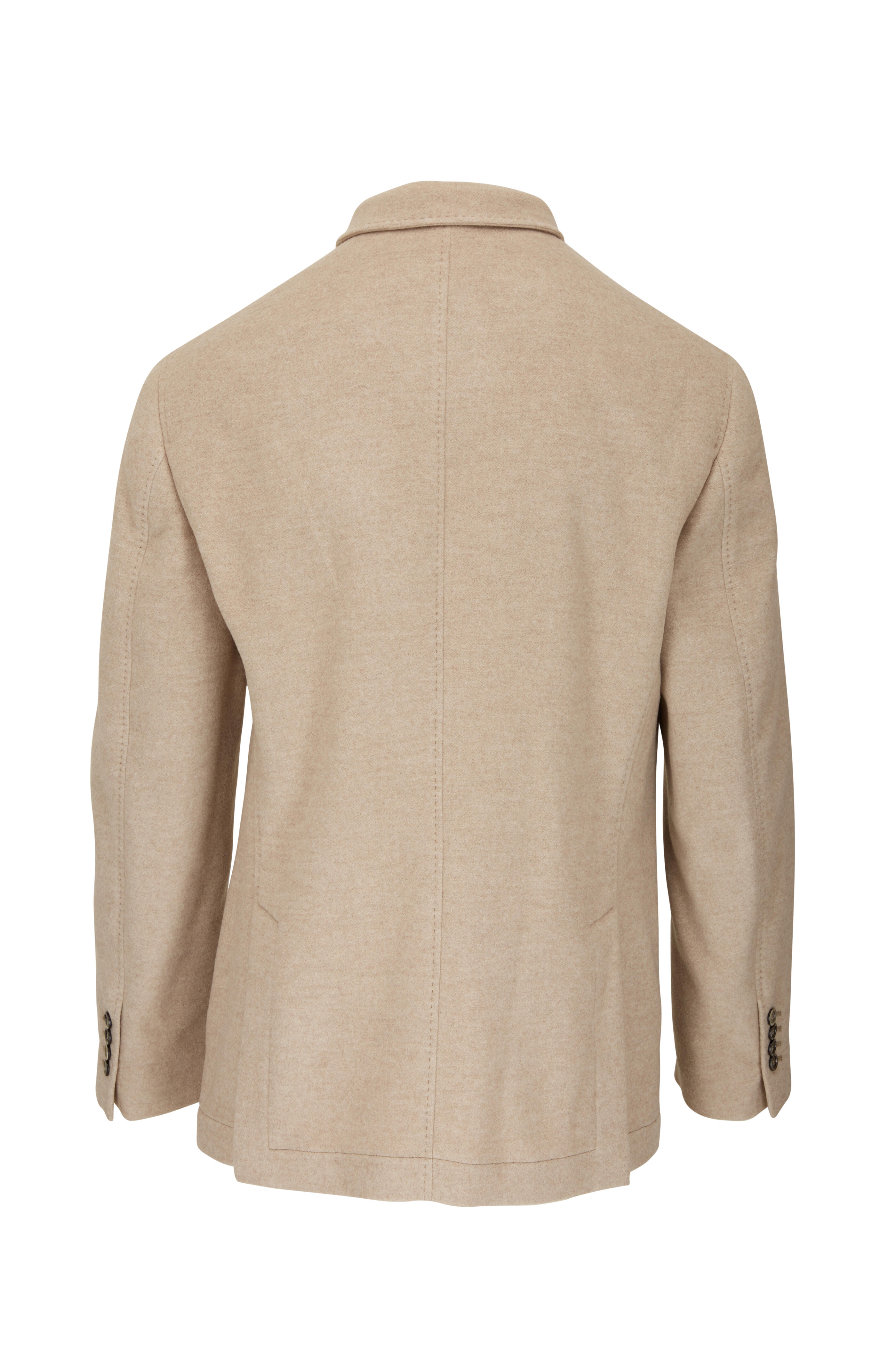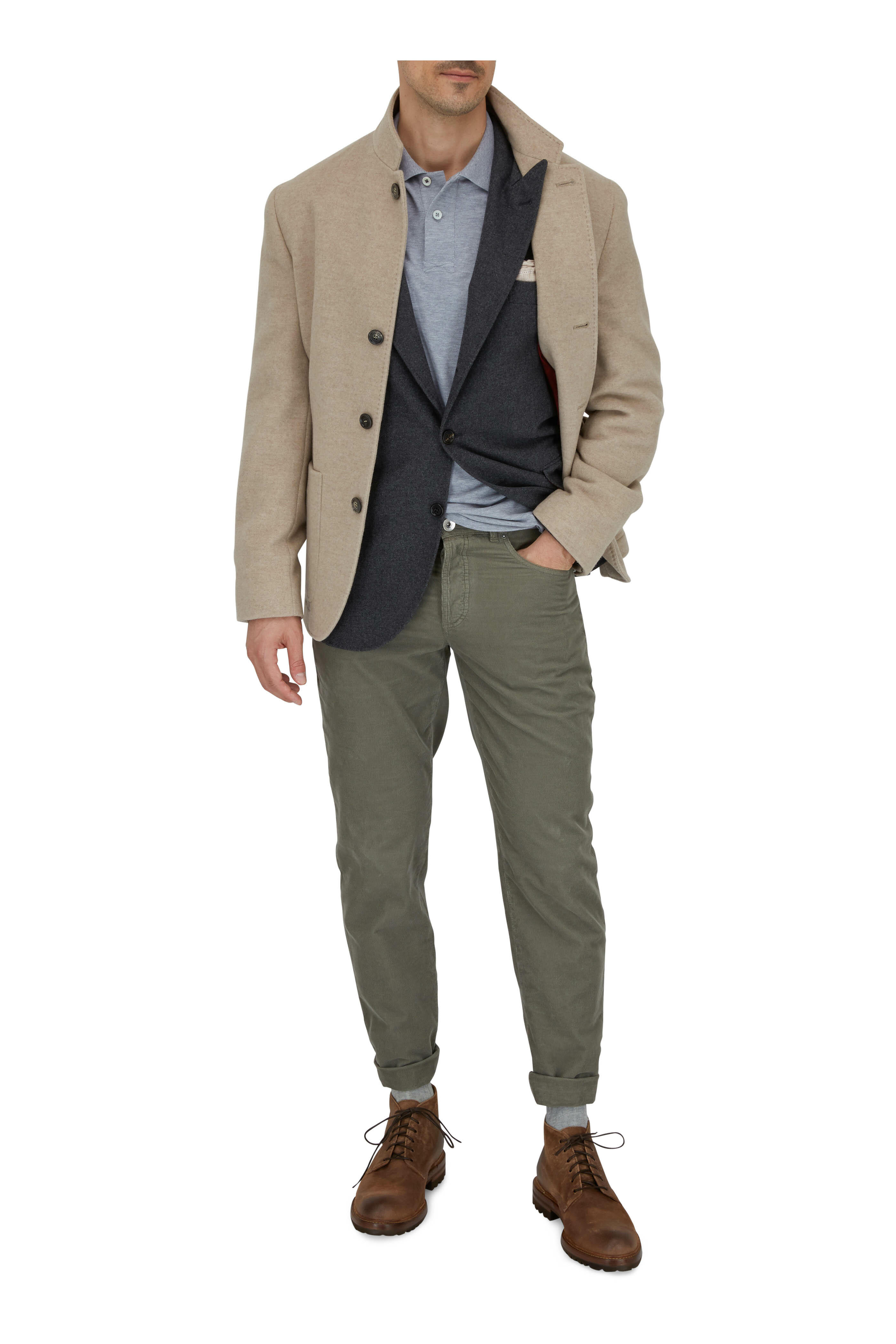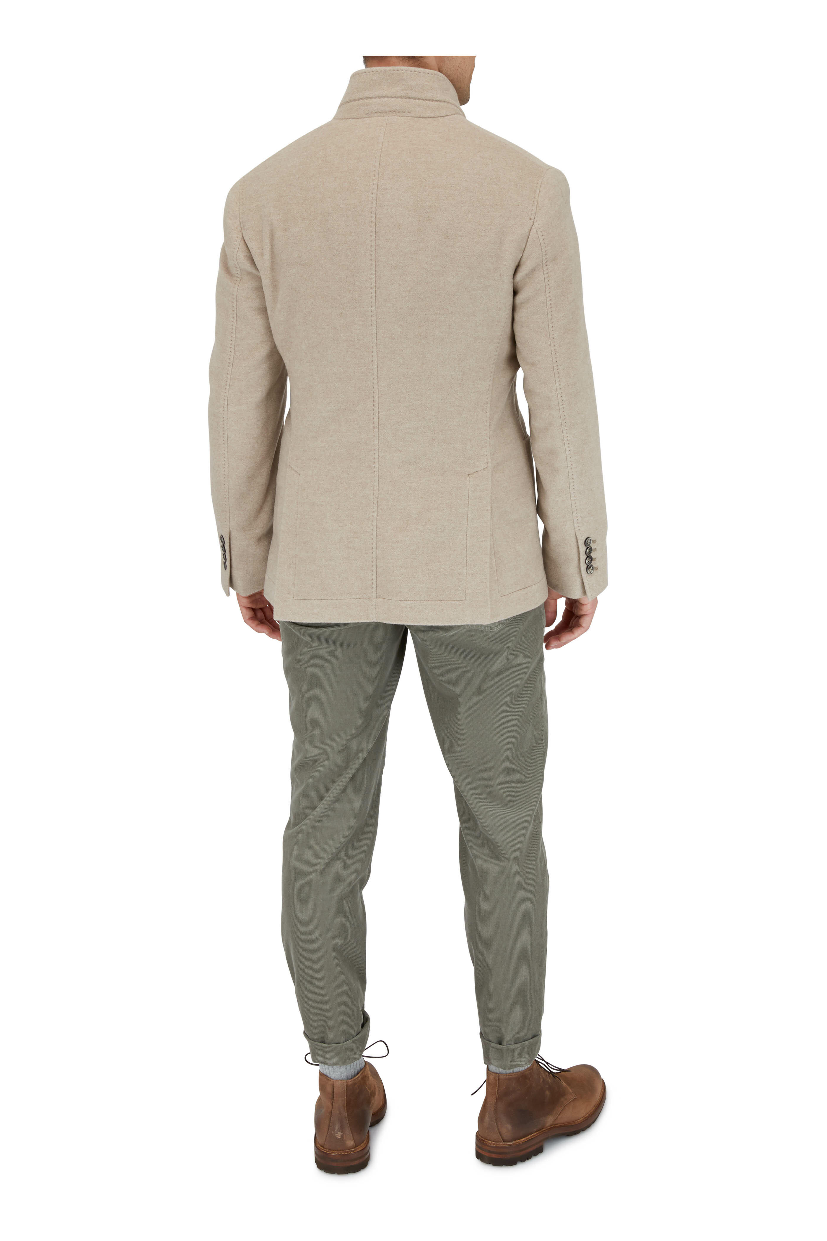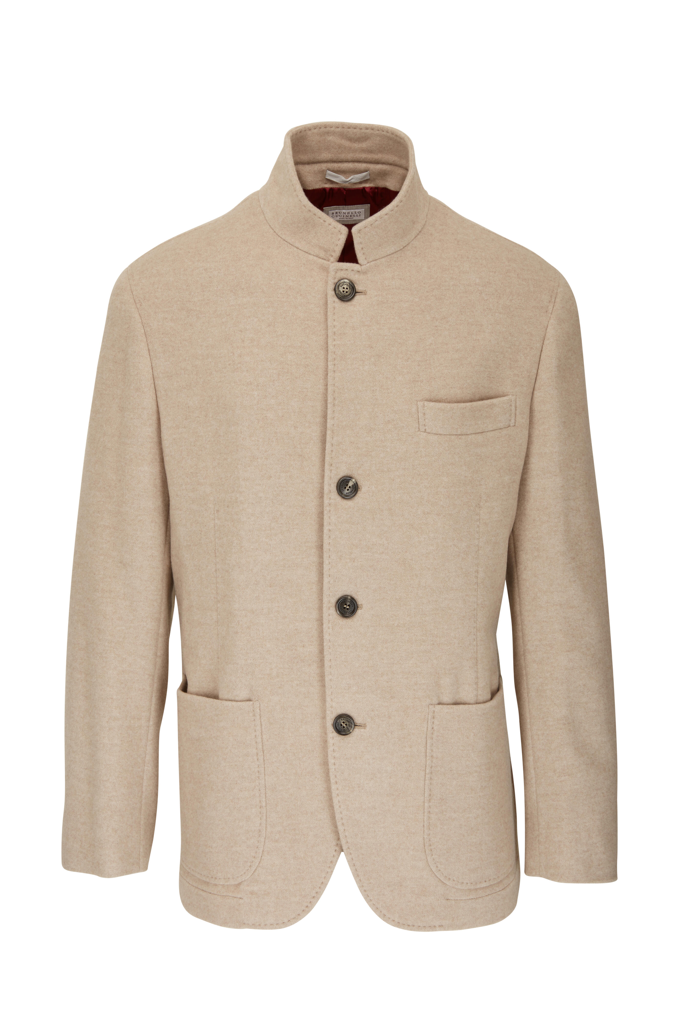Stand collar. Front button placket. Lower patch pockets; chest welt pocket. Double vent. Made in Italy. 100% cashmere; unlined. Dry clean.