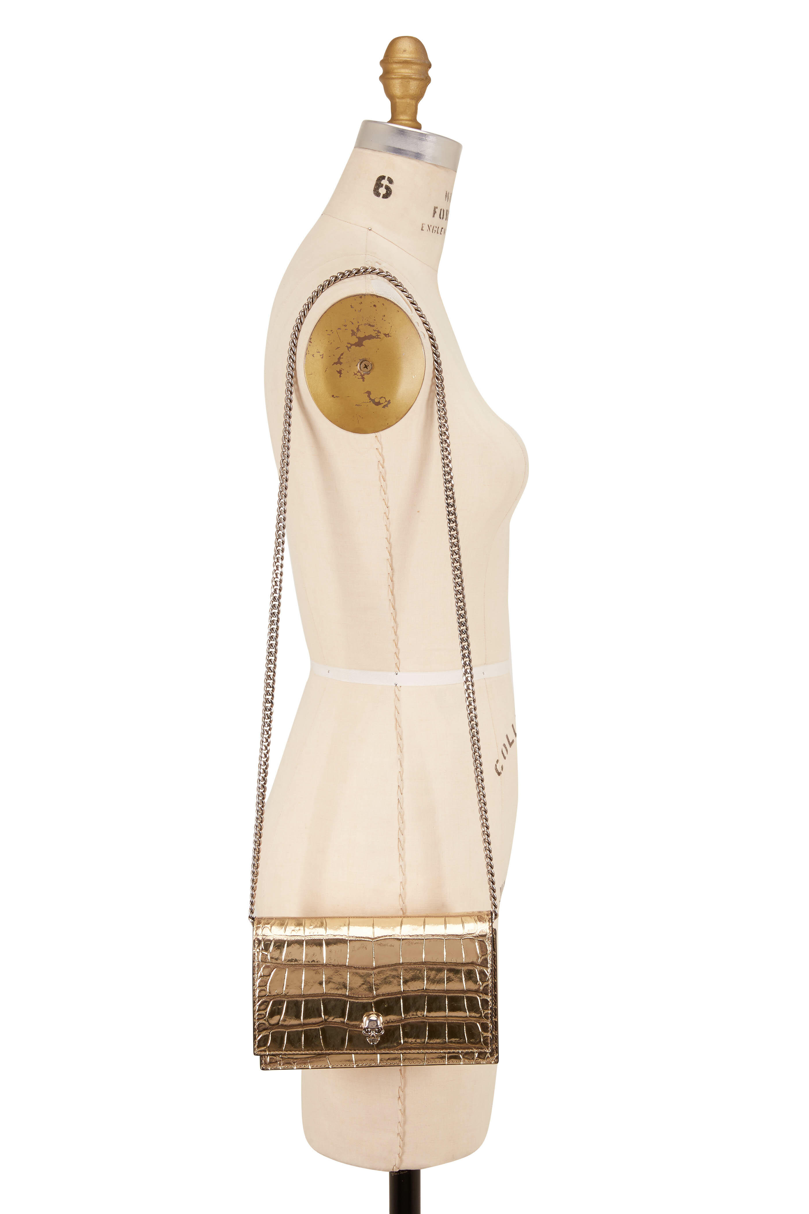 Embossed calfskin leather. Tuck-in chain link strap. Flap front, magnetic snap closure. Signature crystal skull detail. One interior slip pocket. Lined in suede. Made in Italy. Width: 7 ½". Height: 5". Depth: 2". Detachable strap drop: 20".