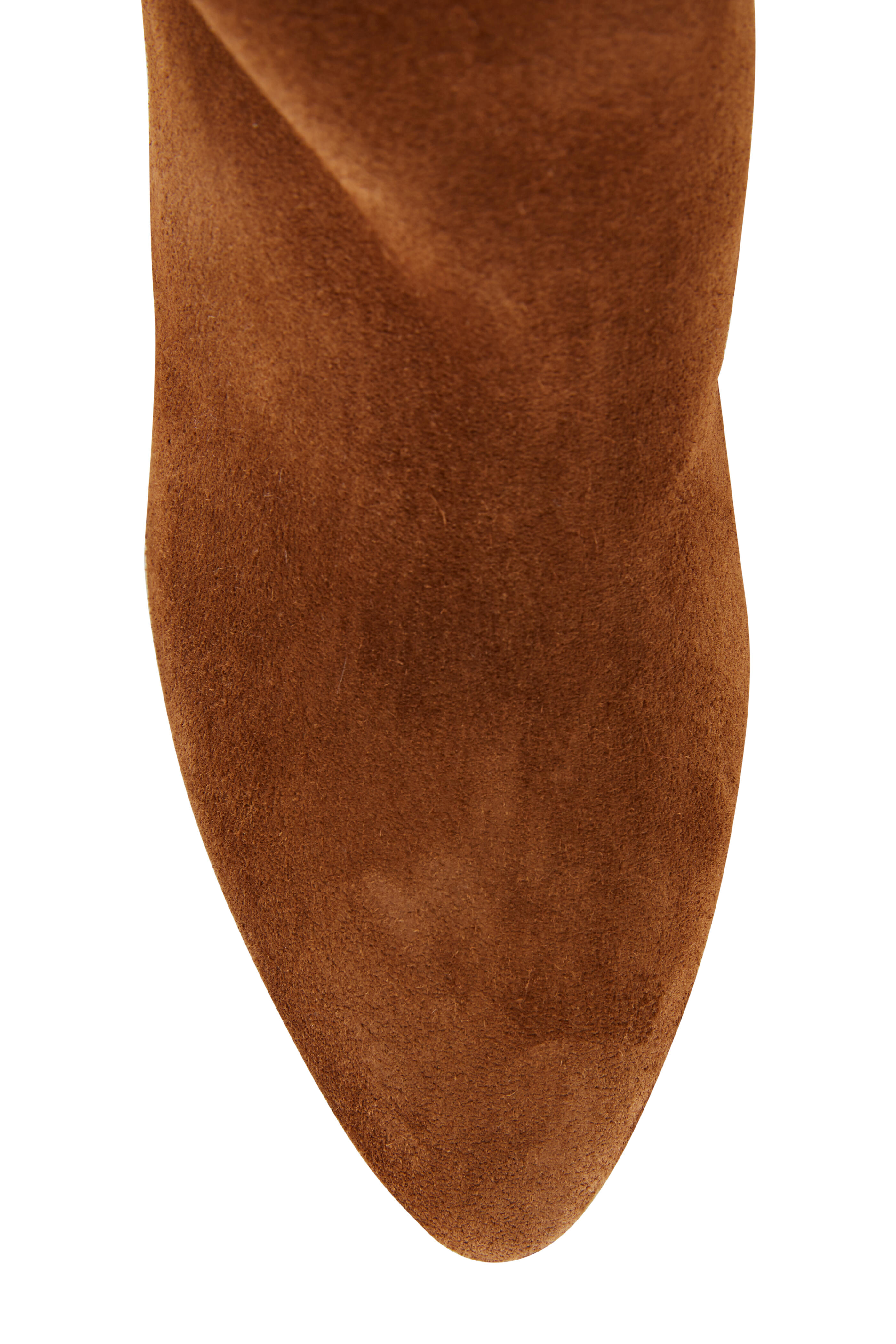 Calfskin suede upper. Pointed toe. Pull-on style. Leather lining and insole. Tapered stacked leather heel. Leather sole. Made in Italy. Heel measurement: 60mm (2 ½"). Shaft: 28".