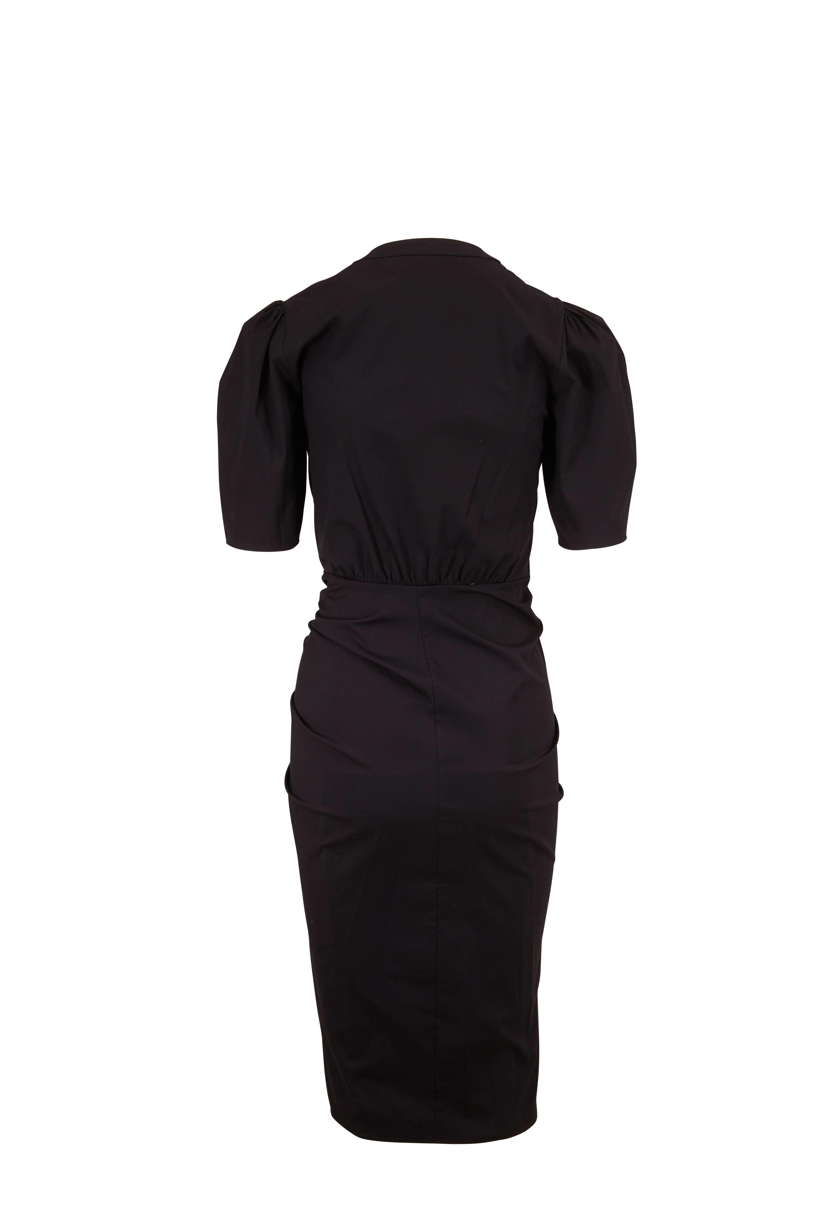 V-neckline. Asymmetrical front button placket; concealed zip closure. Puff elbow sleeves. Front ruching detail. Pencil skirt. Imported. 45" shoulder to hem. 97% cotton, 3% elastane. Dry clean.
