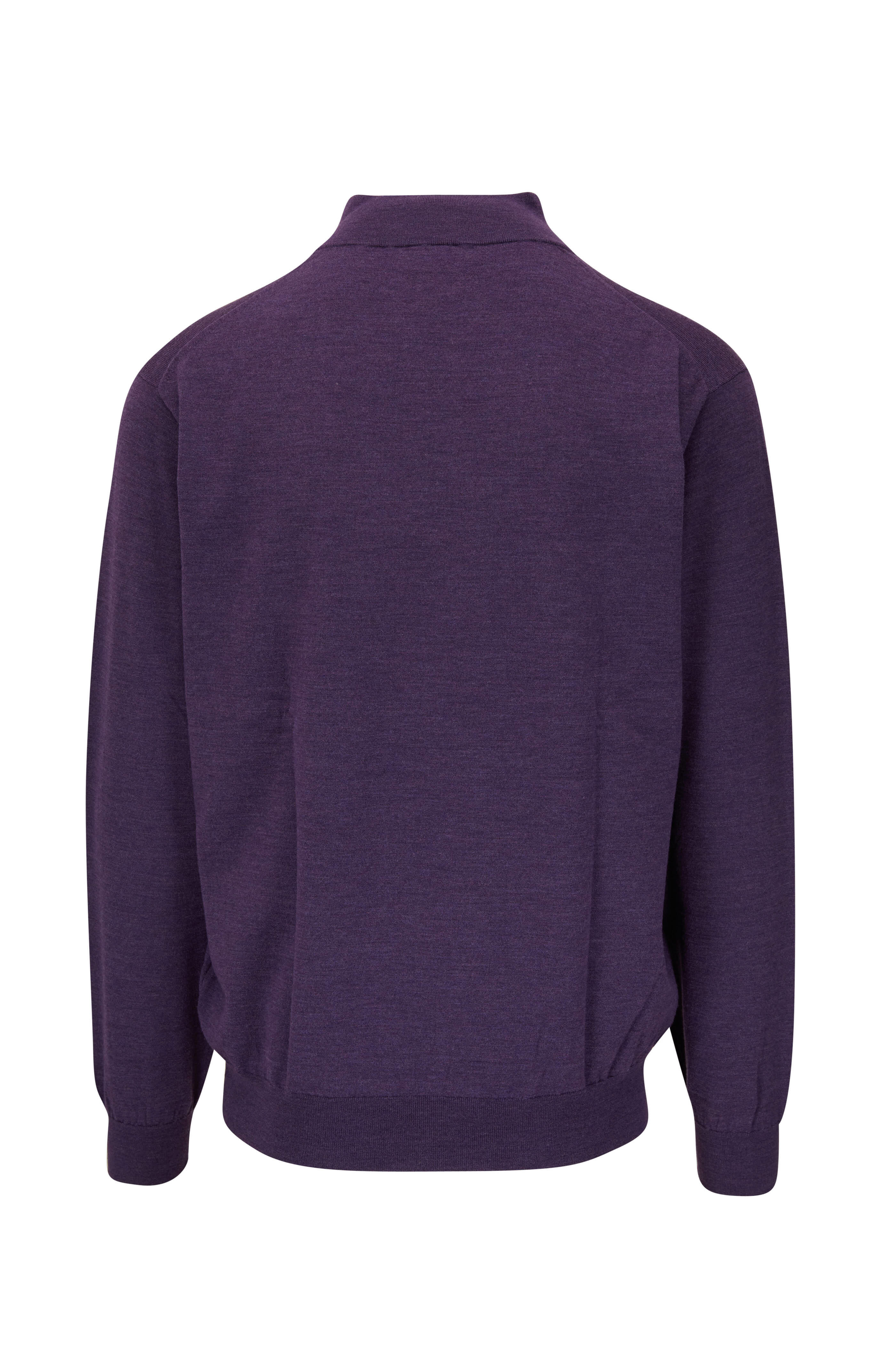 Stand collar. Quarter-zip placket; contrast leather trim. Ribbed trim. Imported. 93% merino wool, 7% polyester. Hand wash.