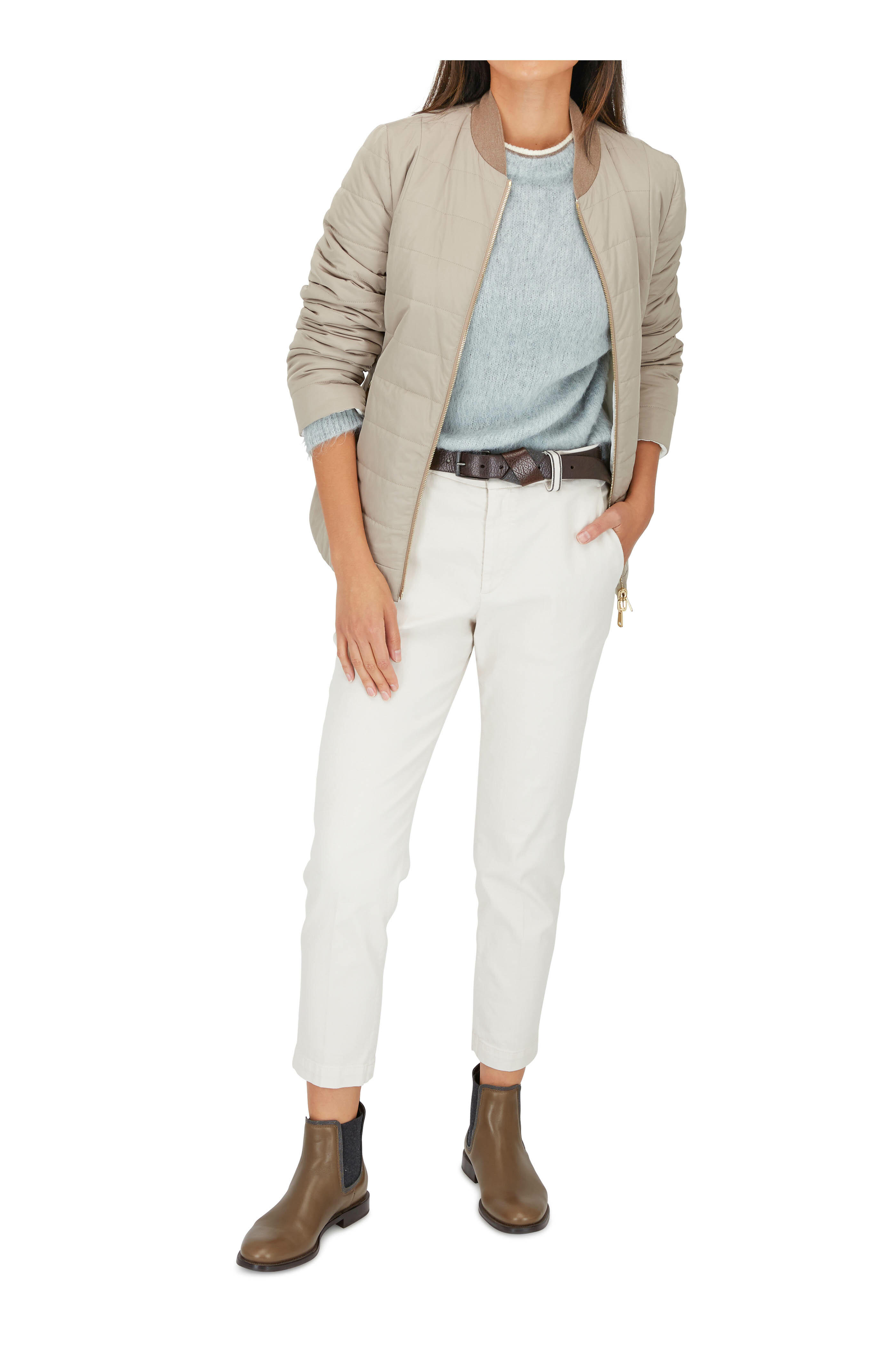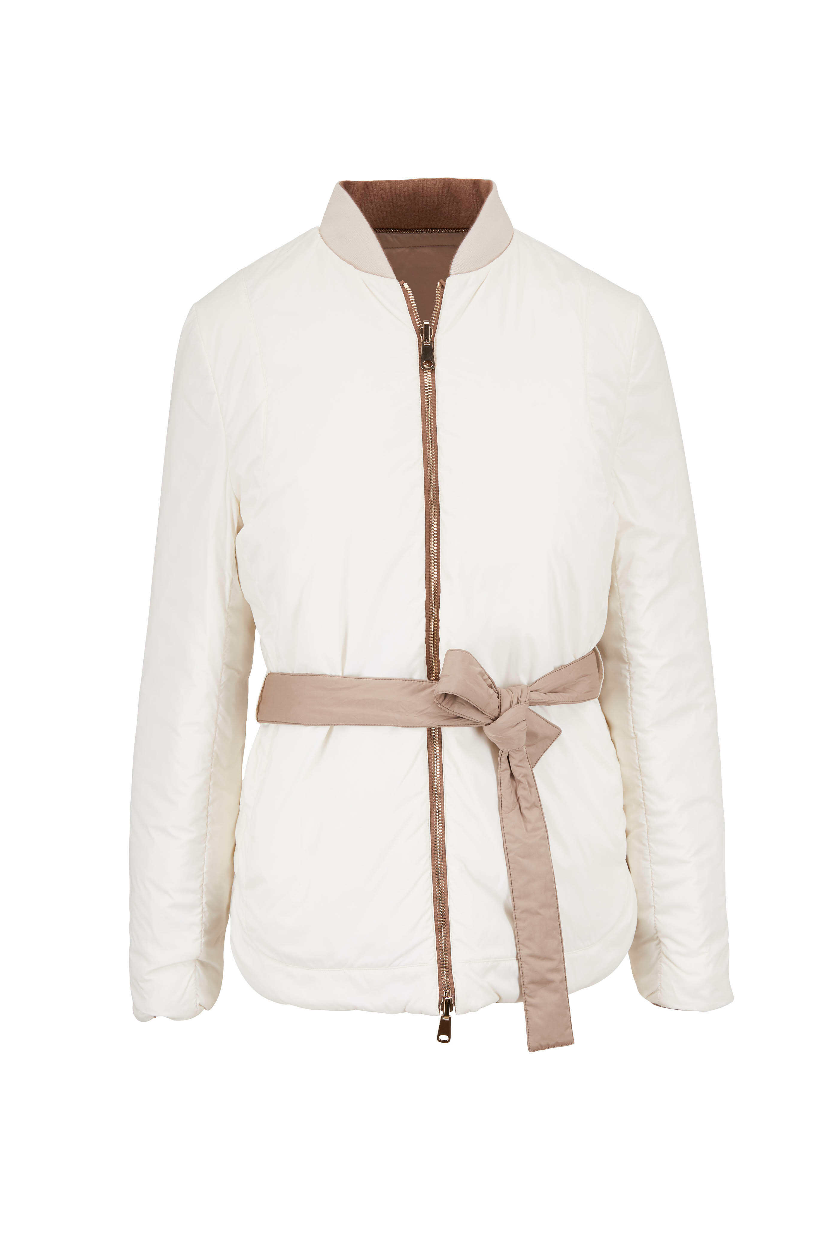 Contrast knit baseball collar. Two-way front zip closure. Self-tie belt at waist. Lower front zip pockets. Reverses to ivory. Shirttail hem. Made in Italy. 65% polyester, 35% nylon; filling: 90% down, 10% feathers. Dry clean.