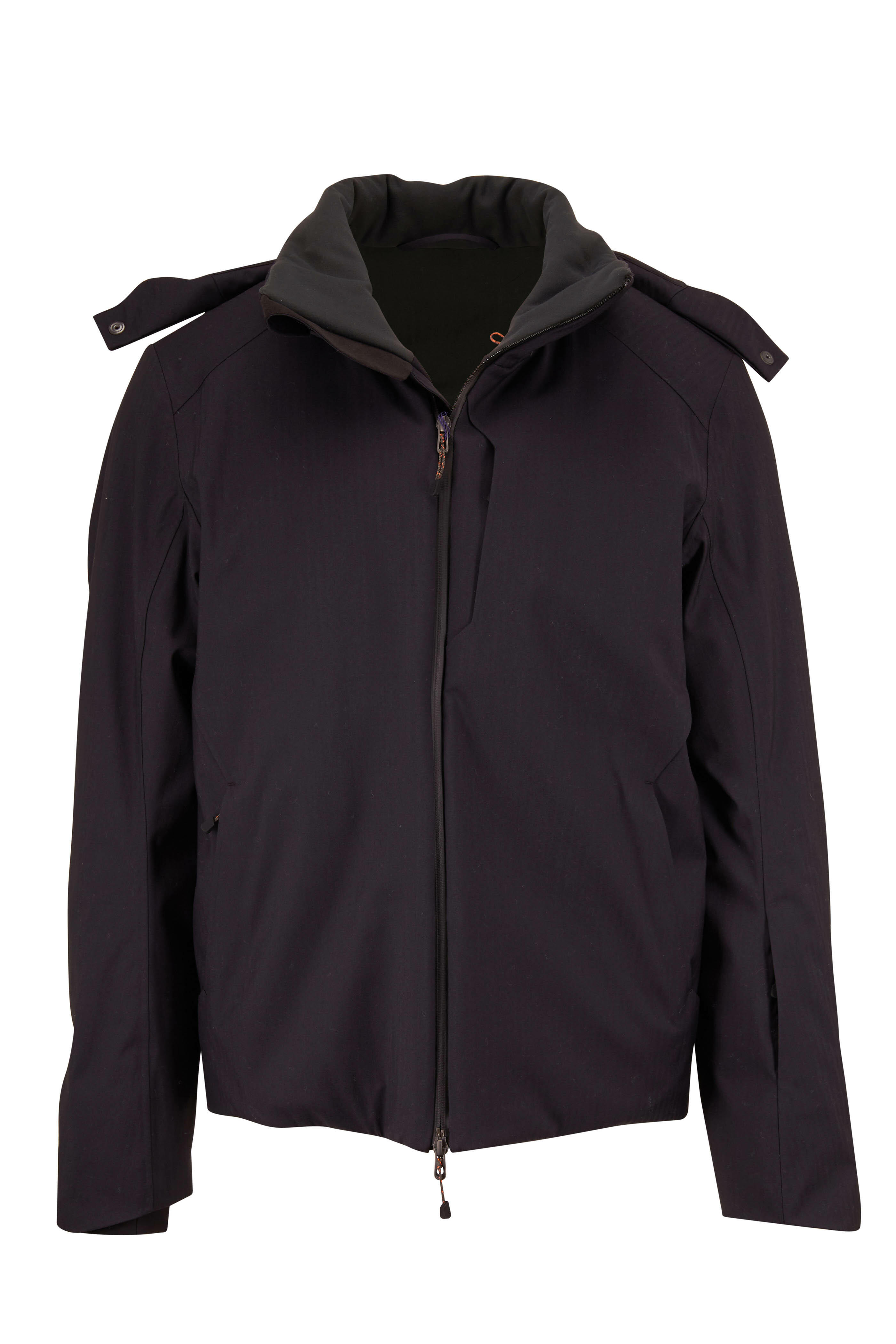 Detachable hood. Front full-zip closure. Side zip pockets. Made in Italy. 70% wool, 30% nylon. Dry clean.