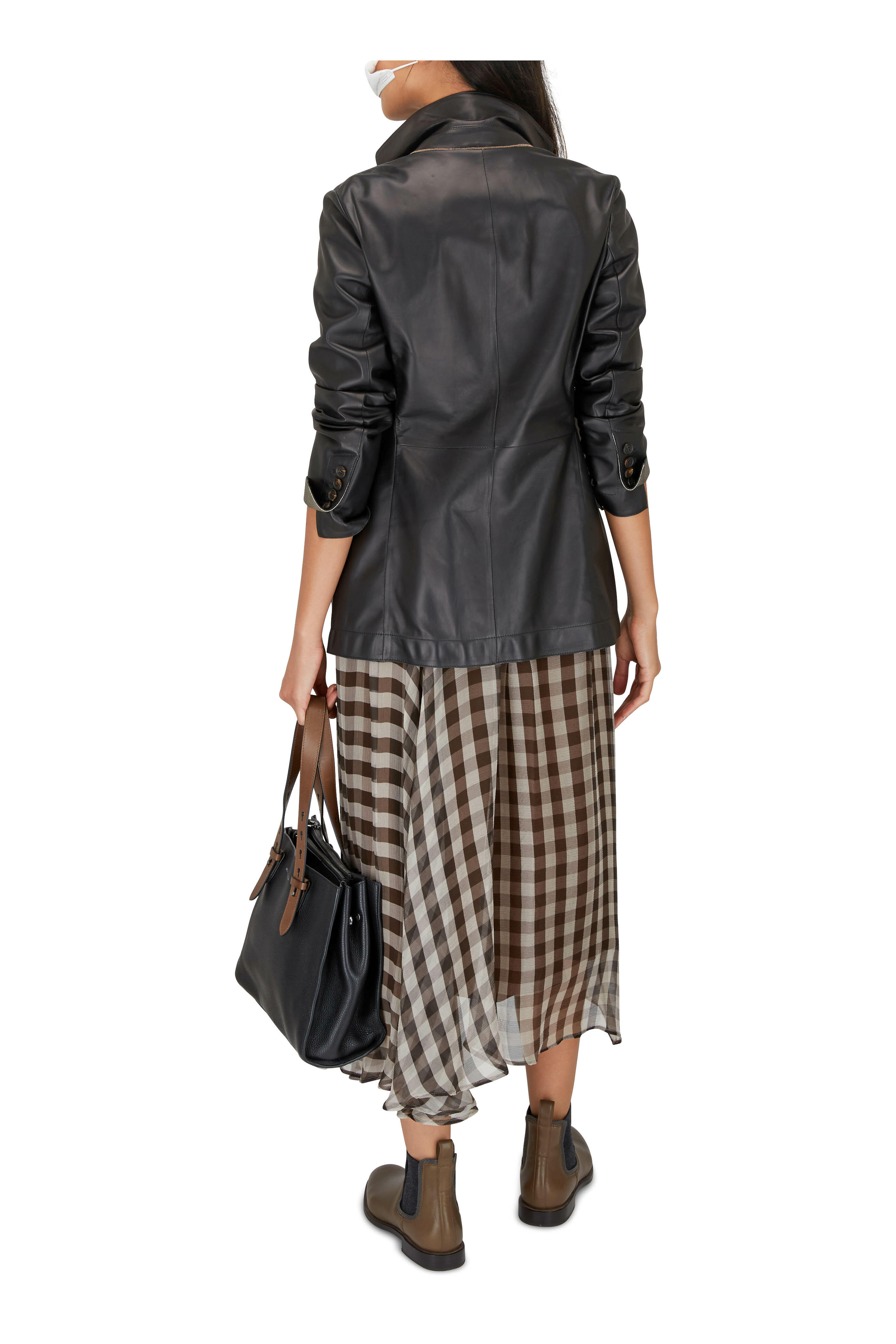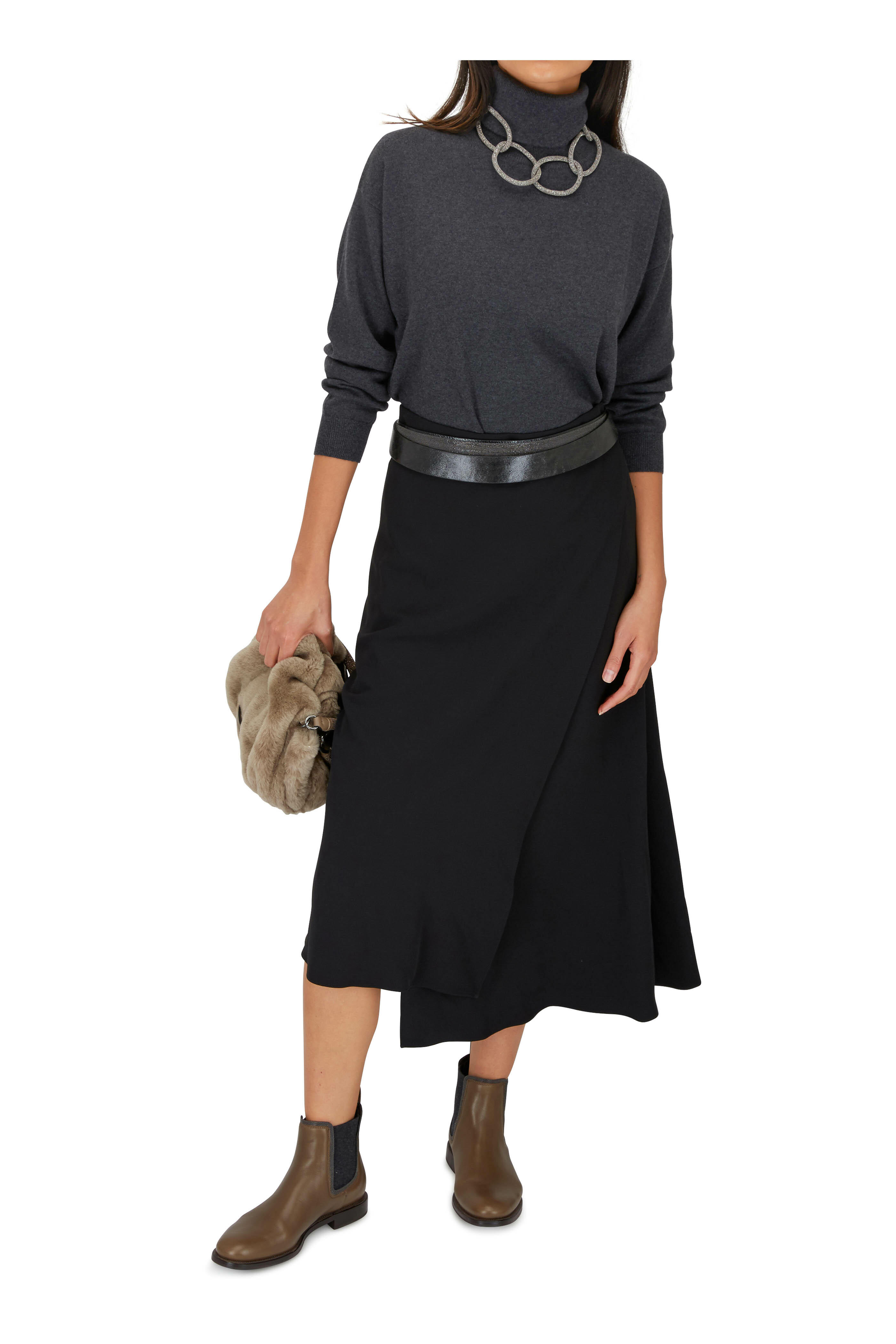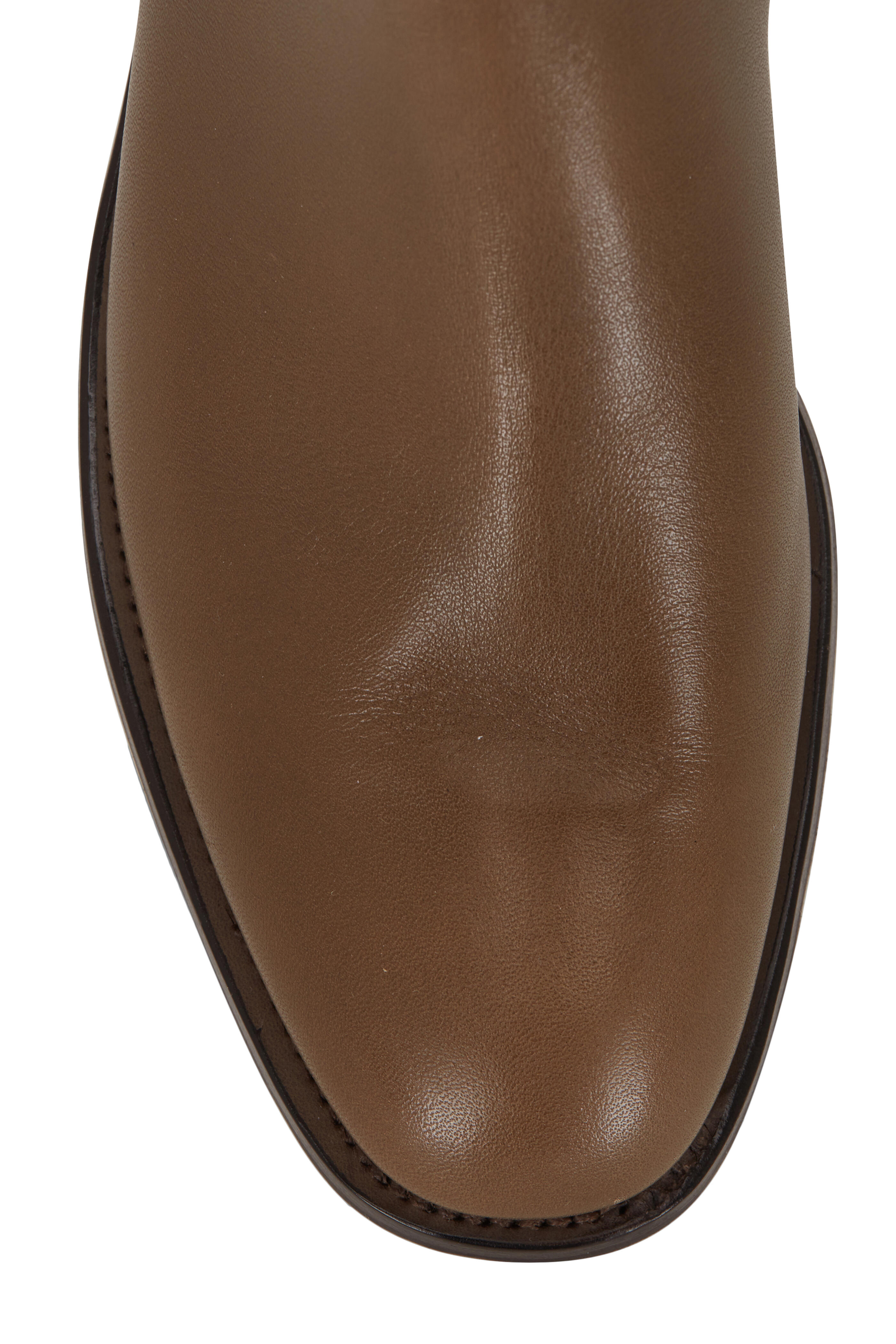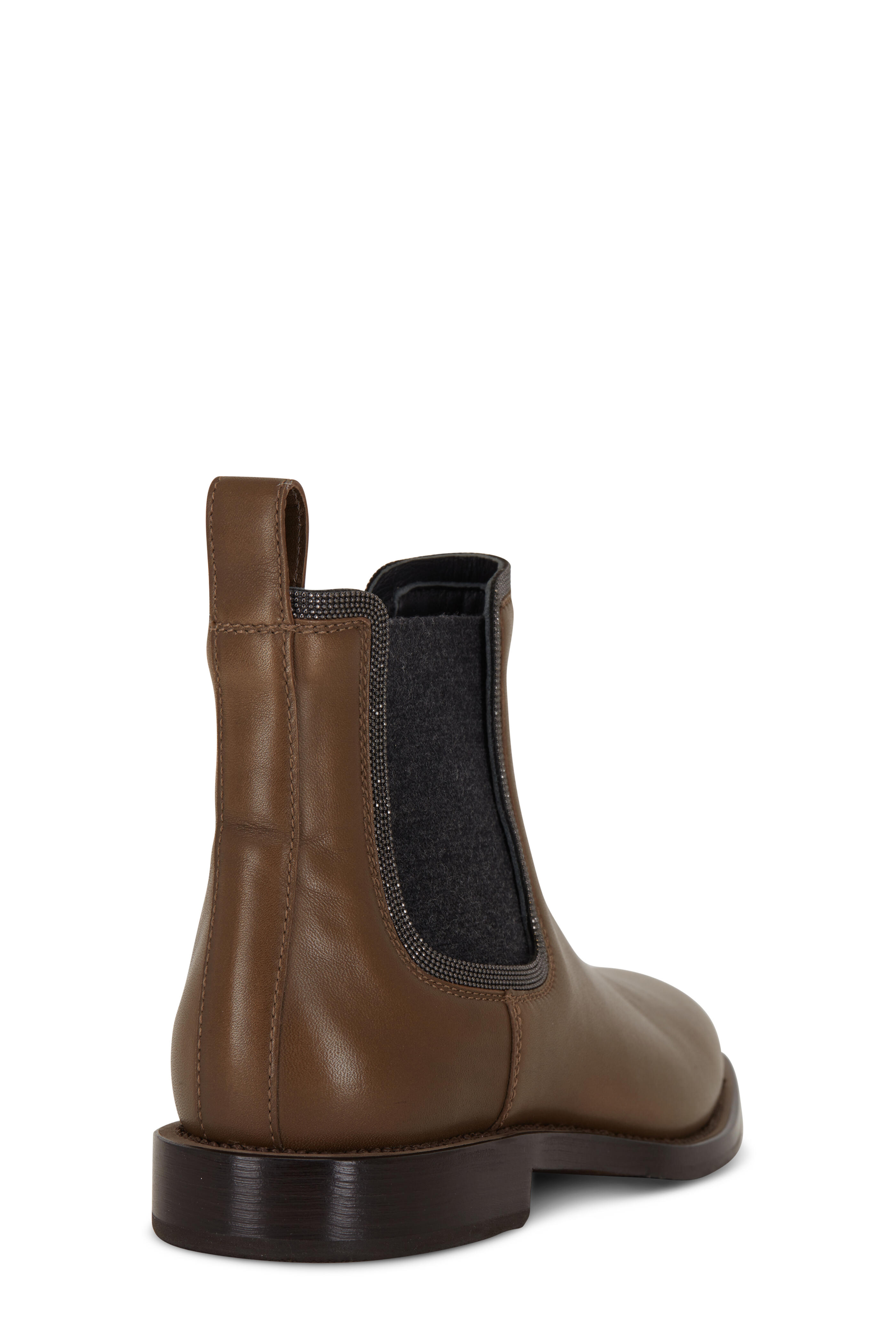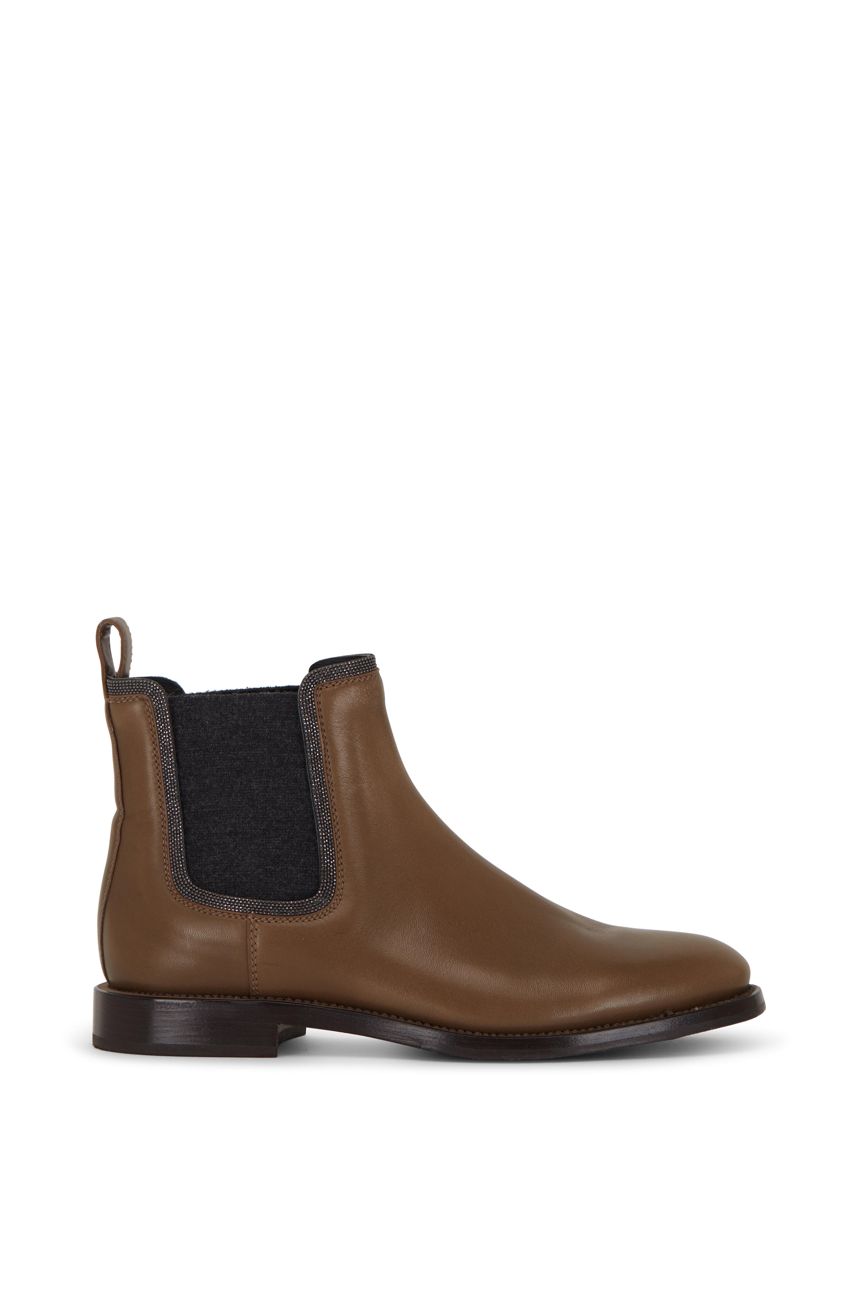 Calfskin leather upper. Almond toe. Elastic side gores. Monili trim. Pull-tab at back heel. Leather lining and insole. Stacked wooden heel. Leather sole. Made in Italy.