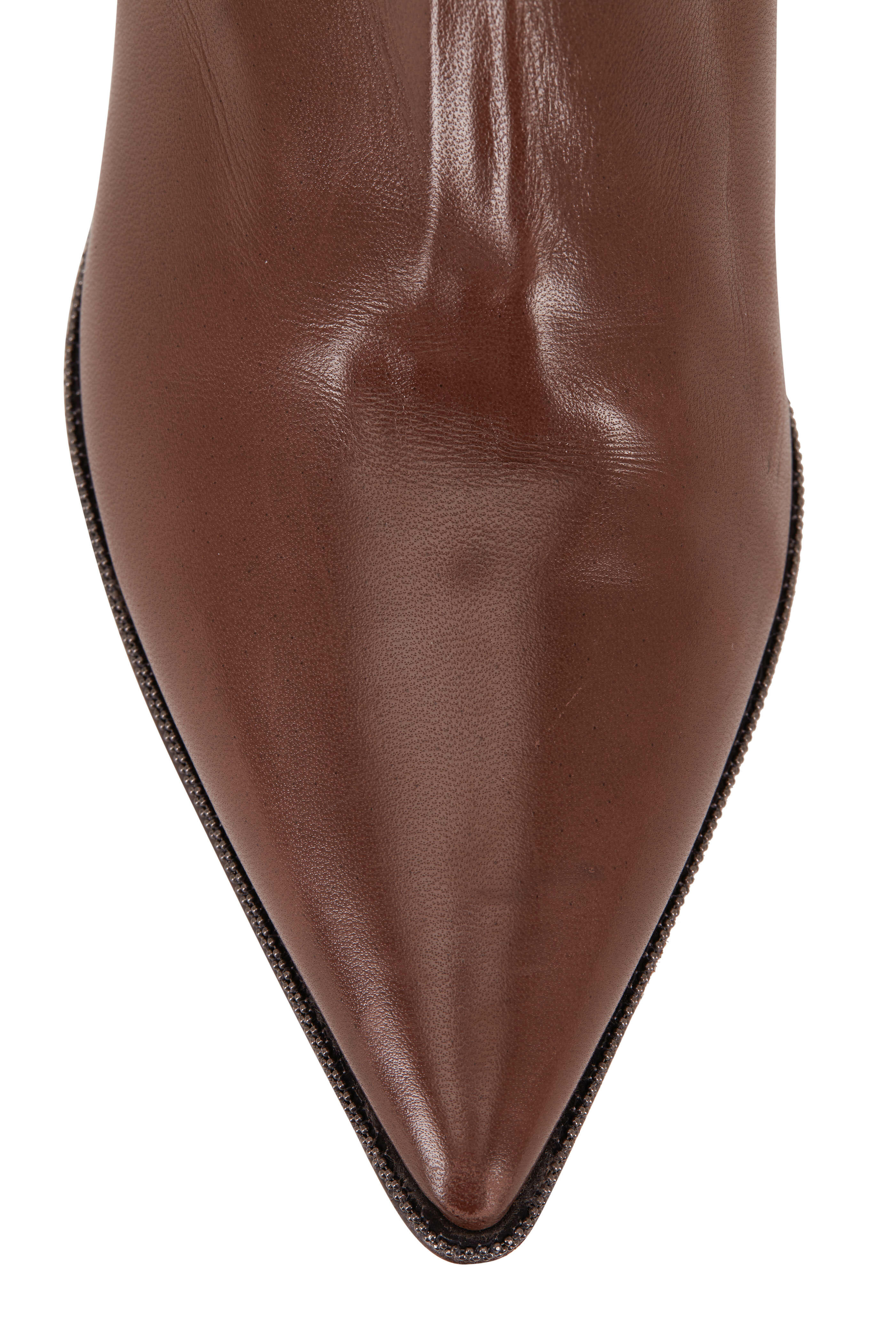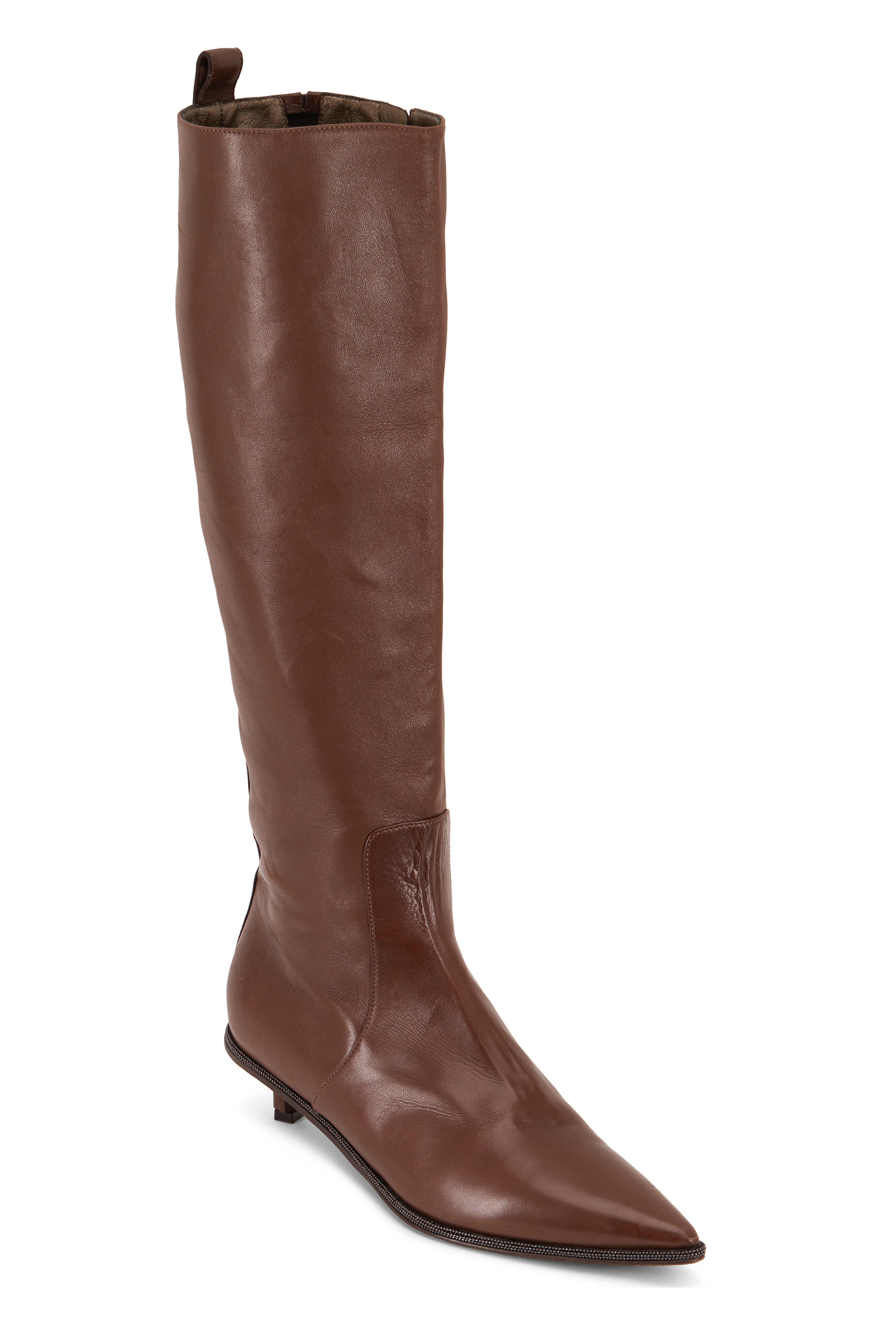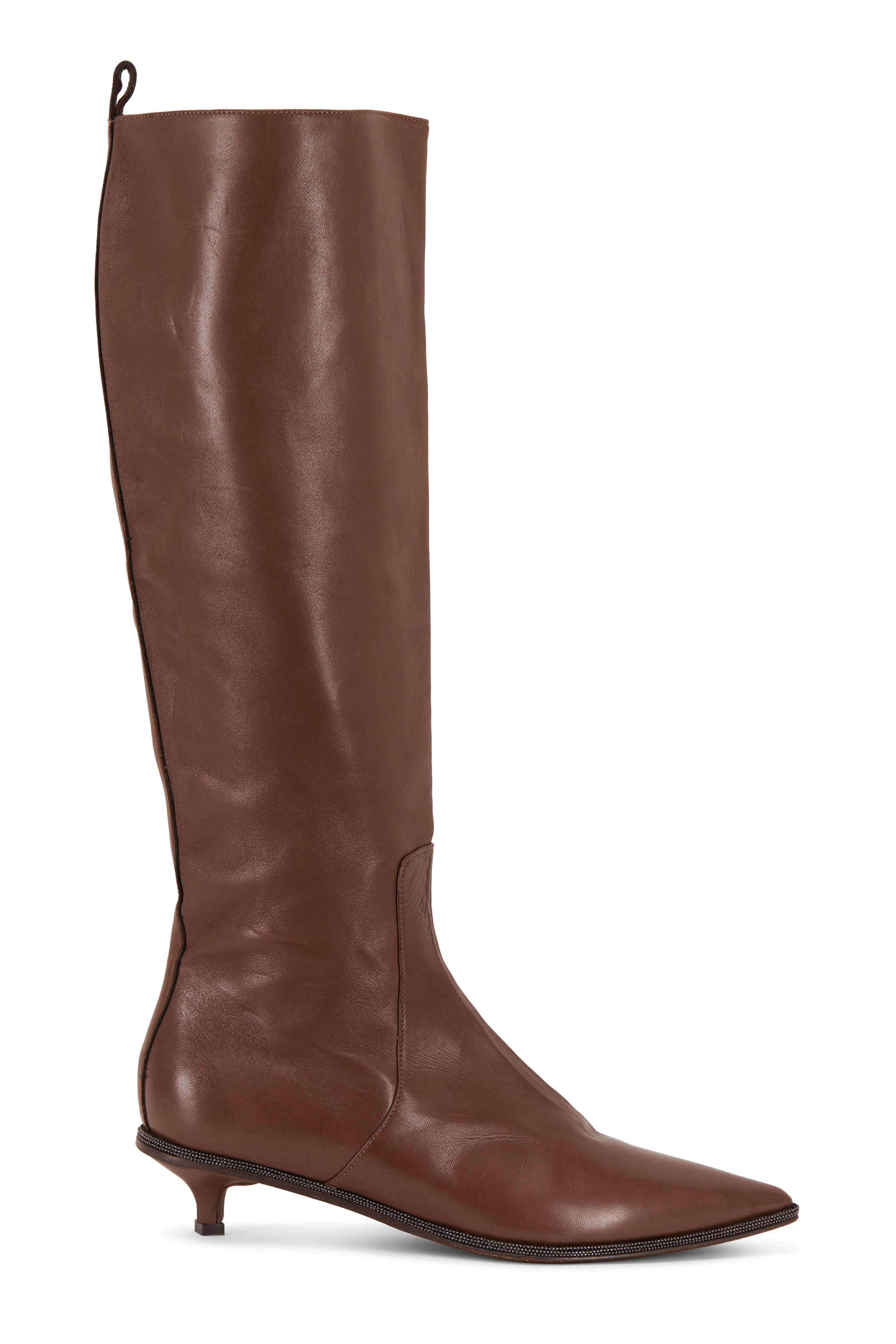 Nappa leather upper. Pointed toe. Side zip closure. Leather lining and insole. Monili trim at mid-heel. Self covered kitten heel. Leather sole. Made in Italy. Heel measurement: 30mm (1 ¼"). Shaft: 17".