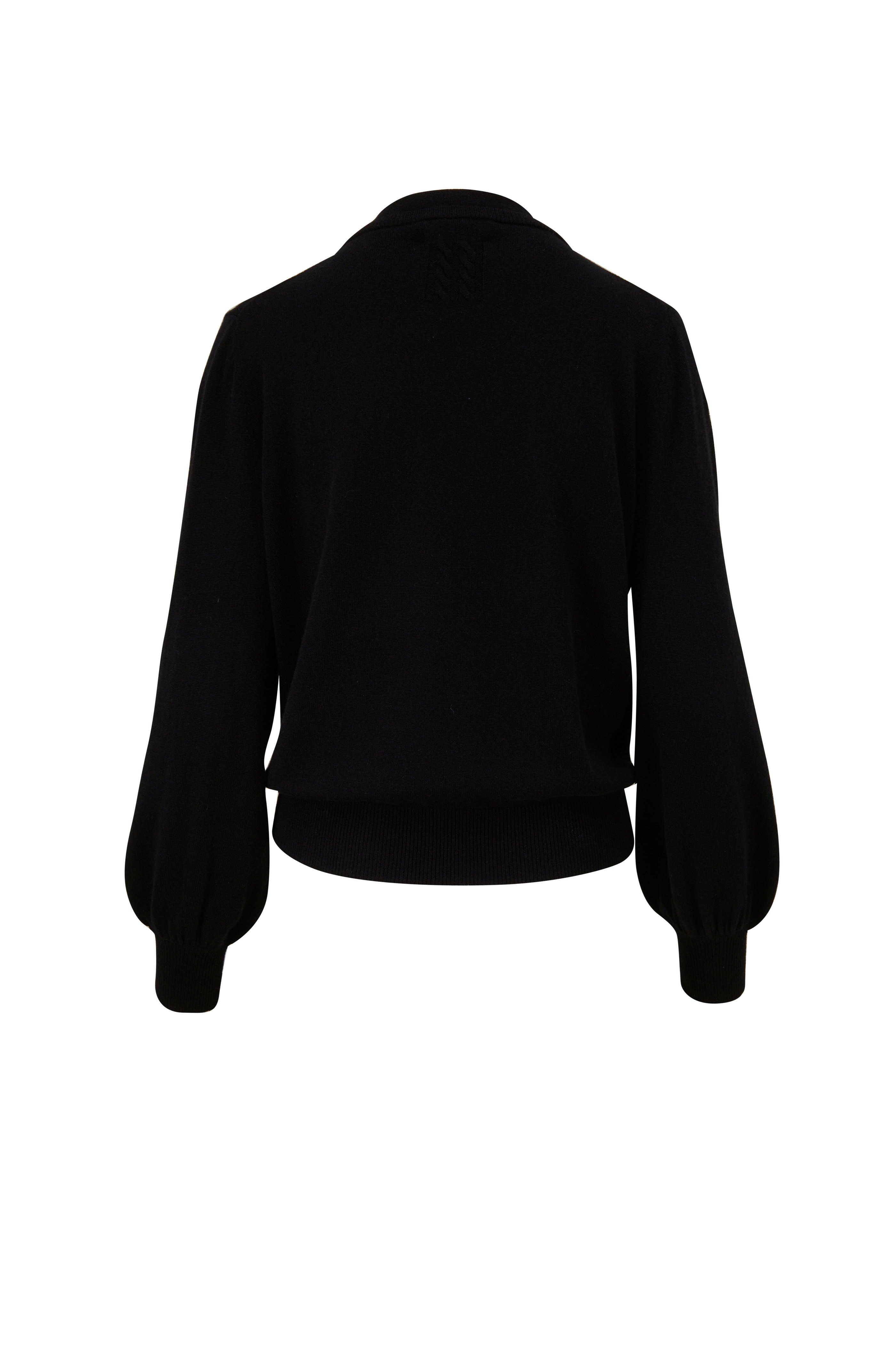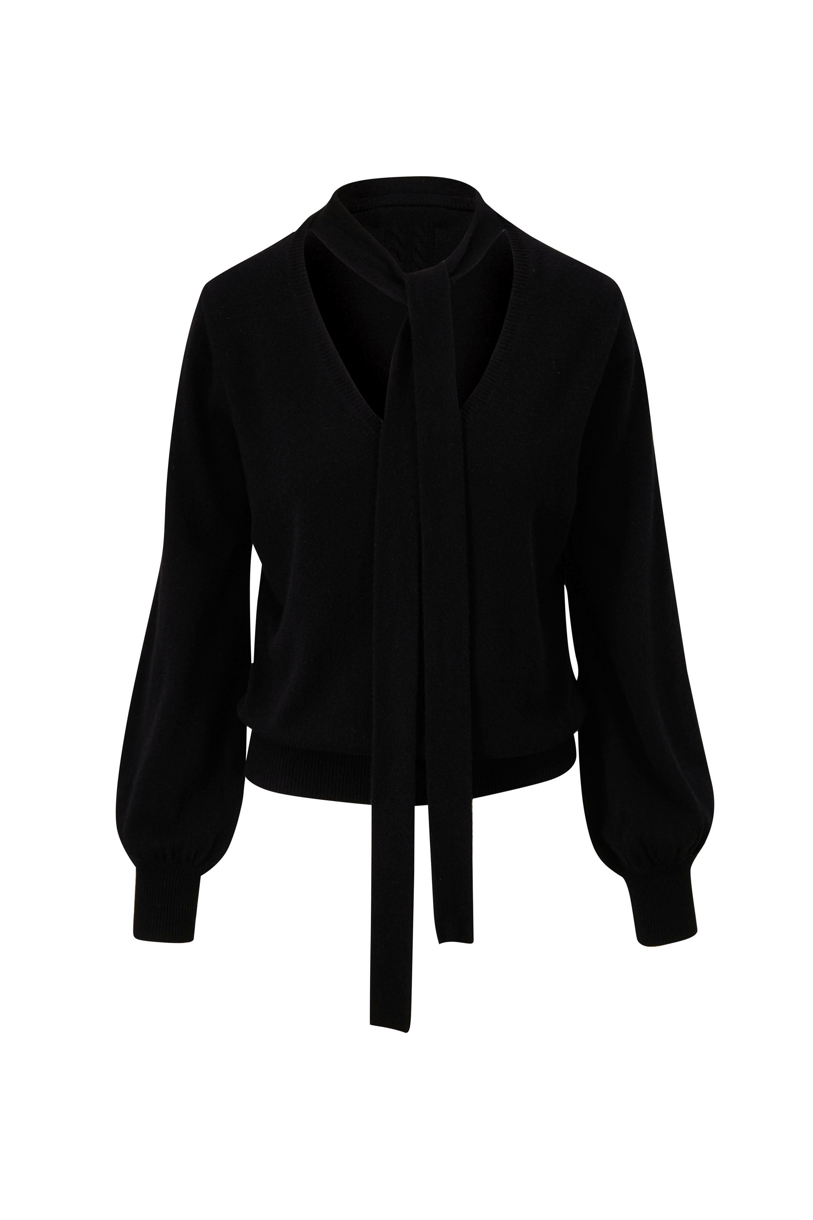 Self-tie neckline. Ribbed trim. Imported. 100% cashmere. Dry clean.
