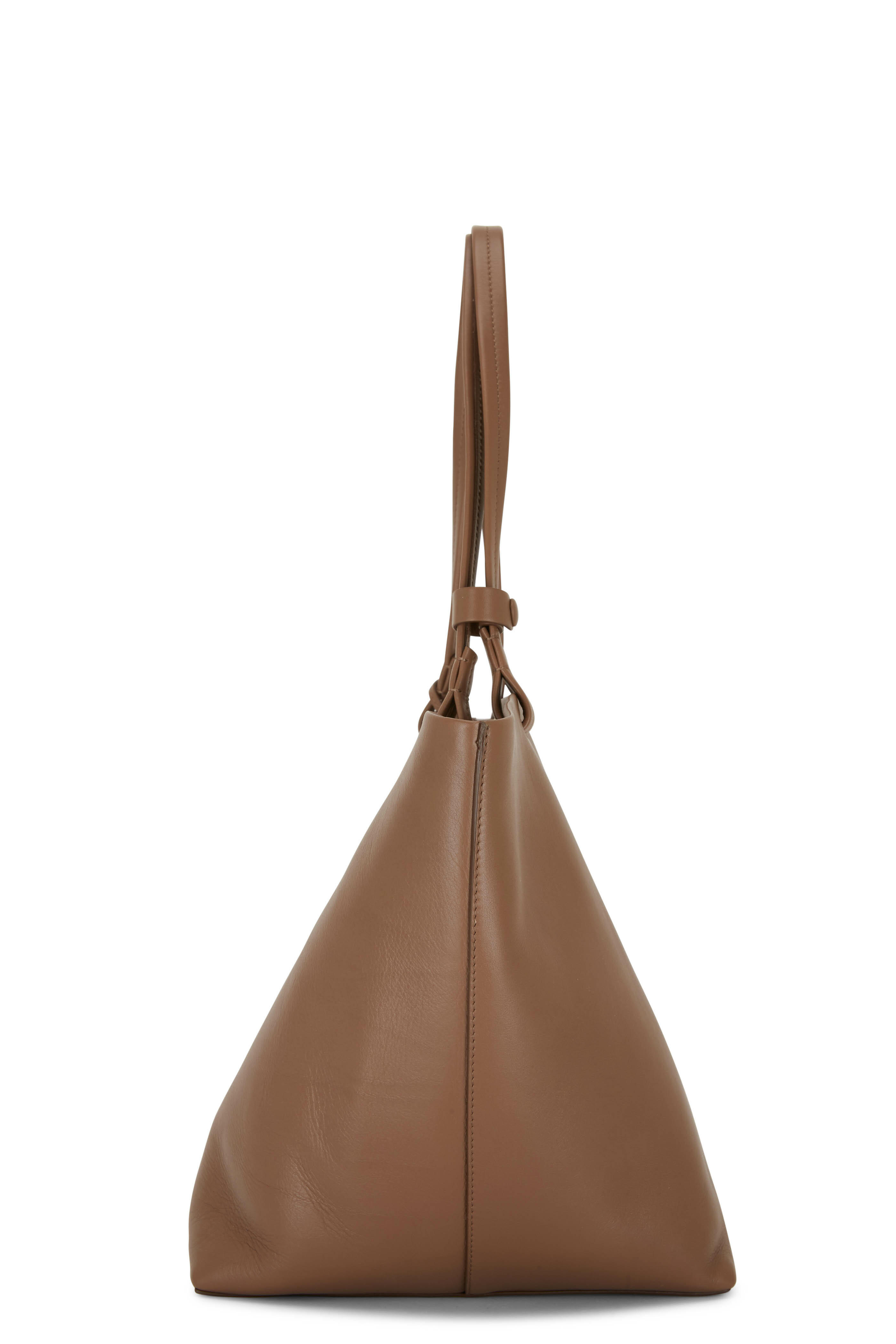 Smooth leather. Dual flat top handles. Center tie closure. Removable flap pouch. Made in Italy.