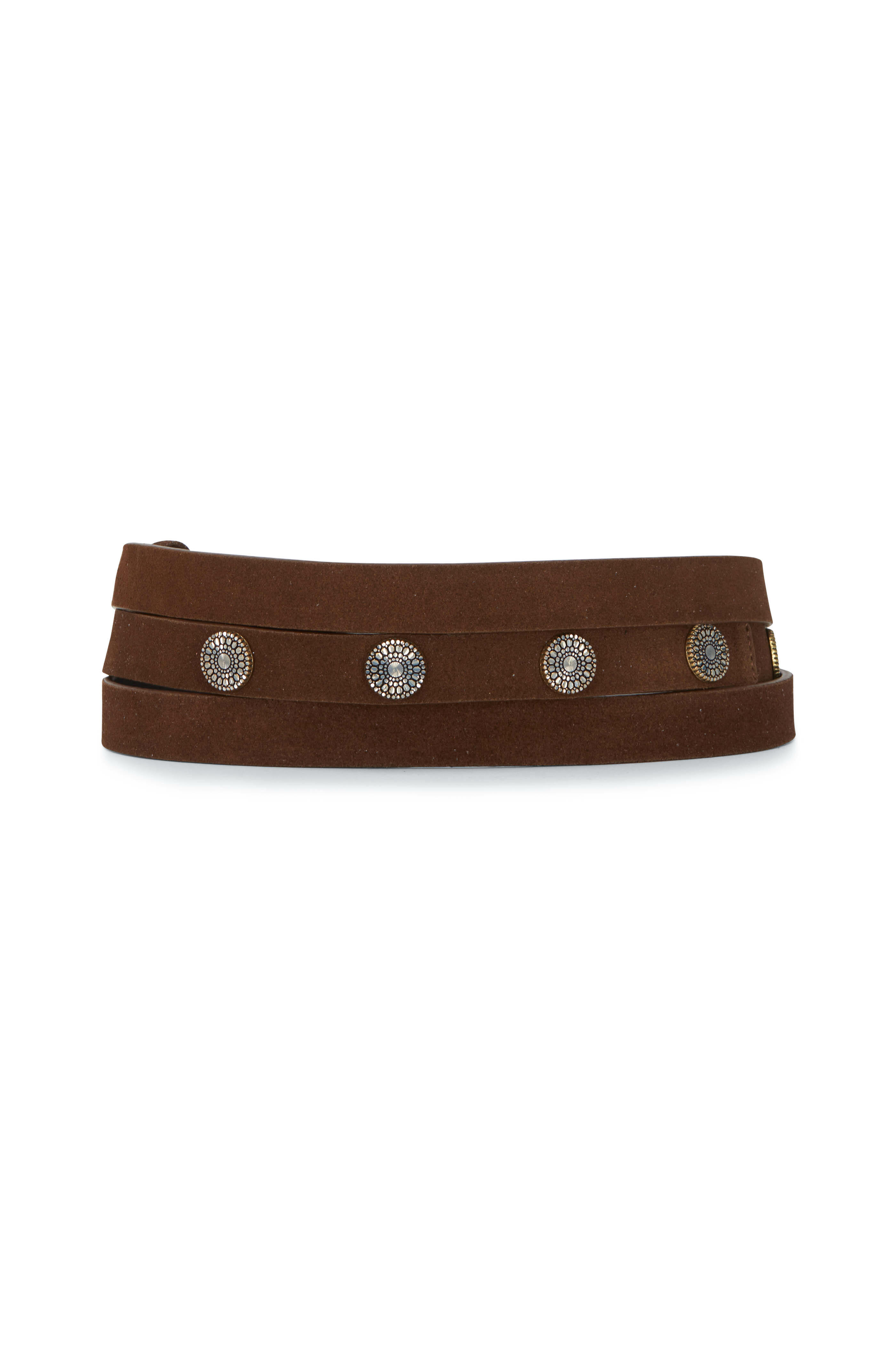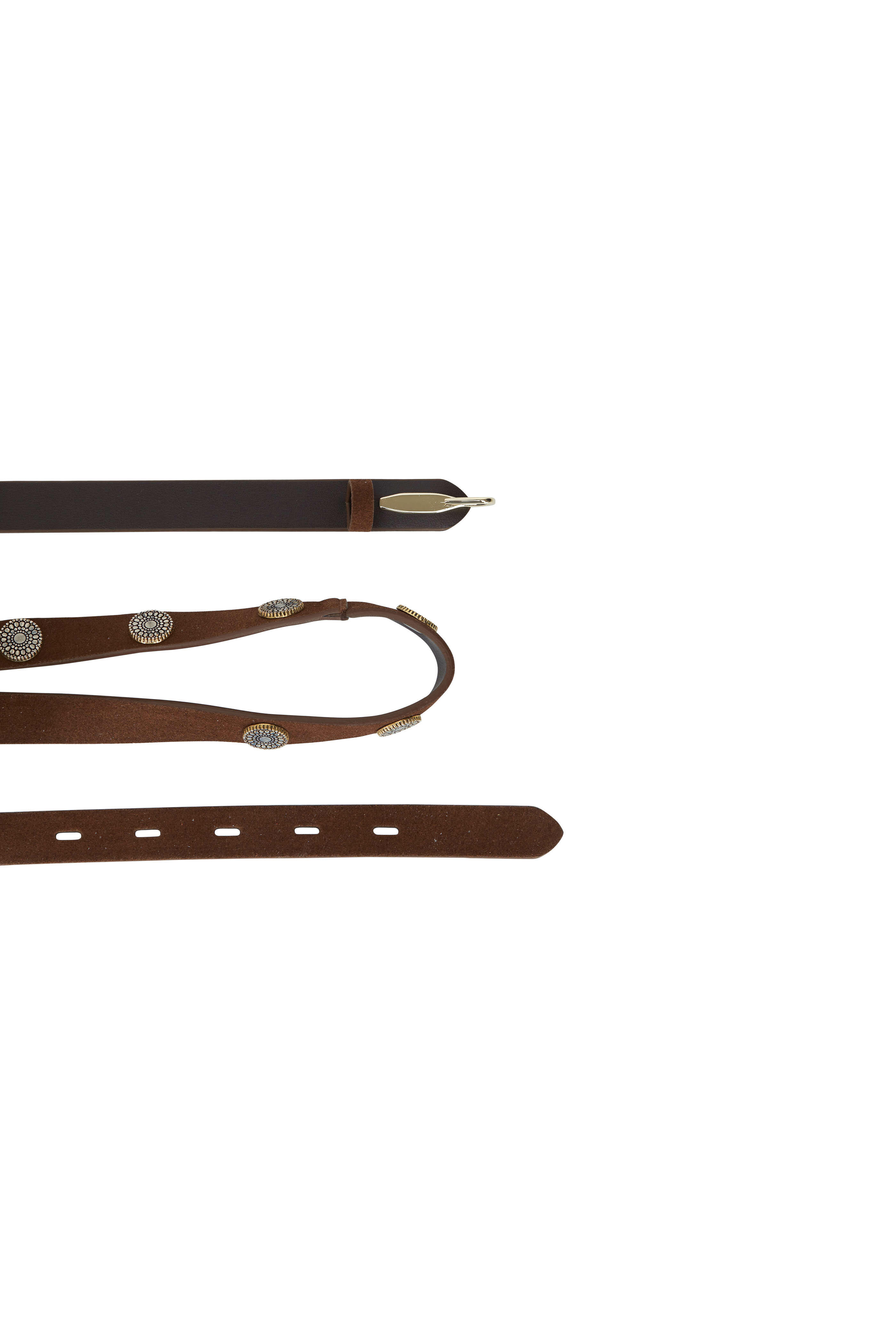 Silver-toned hook closure. Single loop keeper. Tapered tip. Silver-tone medallion details. Made in Italy. ¾" width. 100% leather.