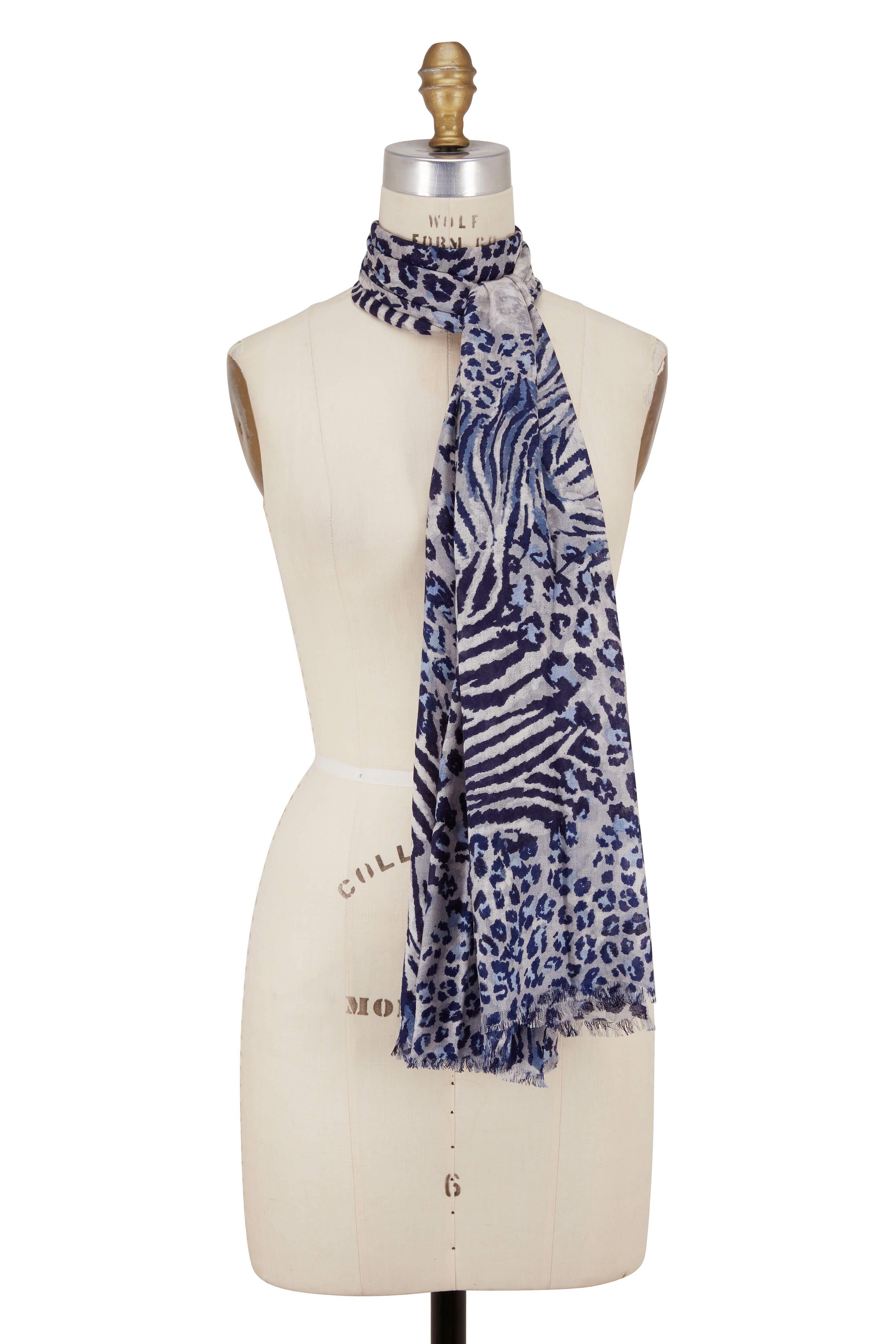 Navy Cashmere & Silk Mixed Animal Print Scarf