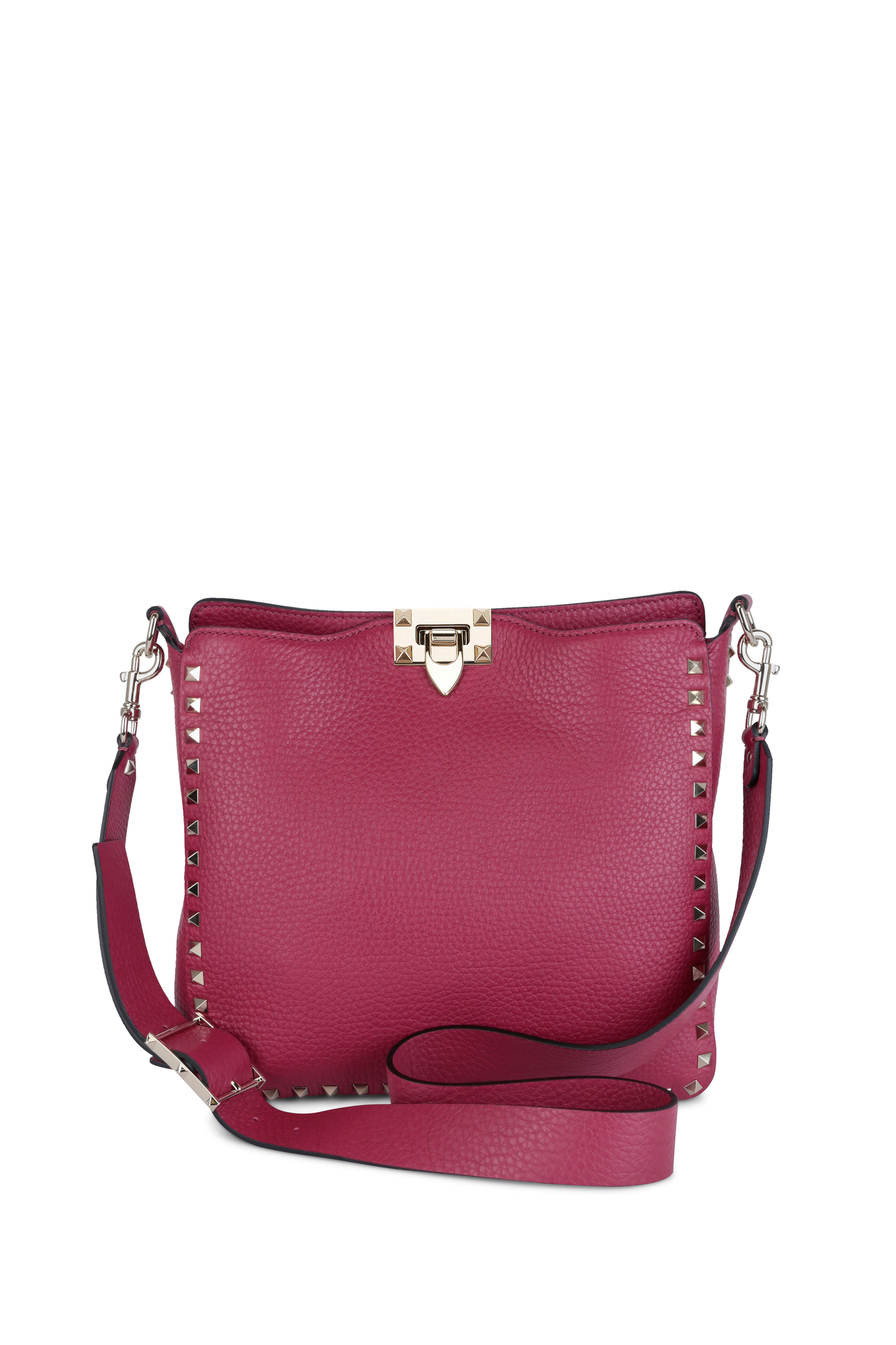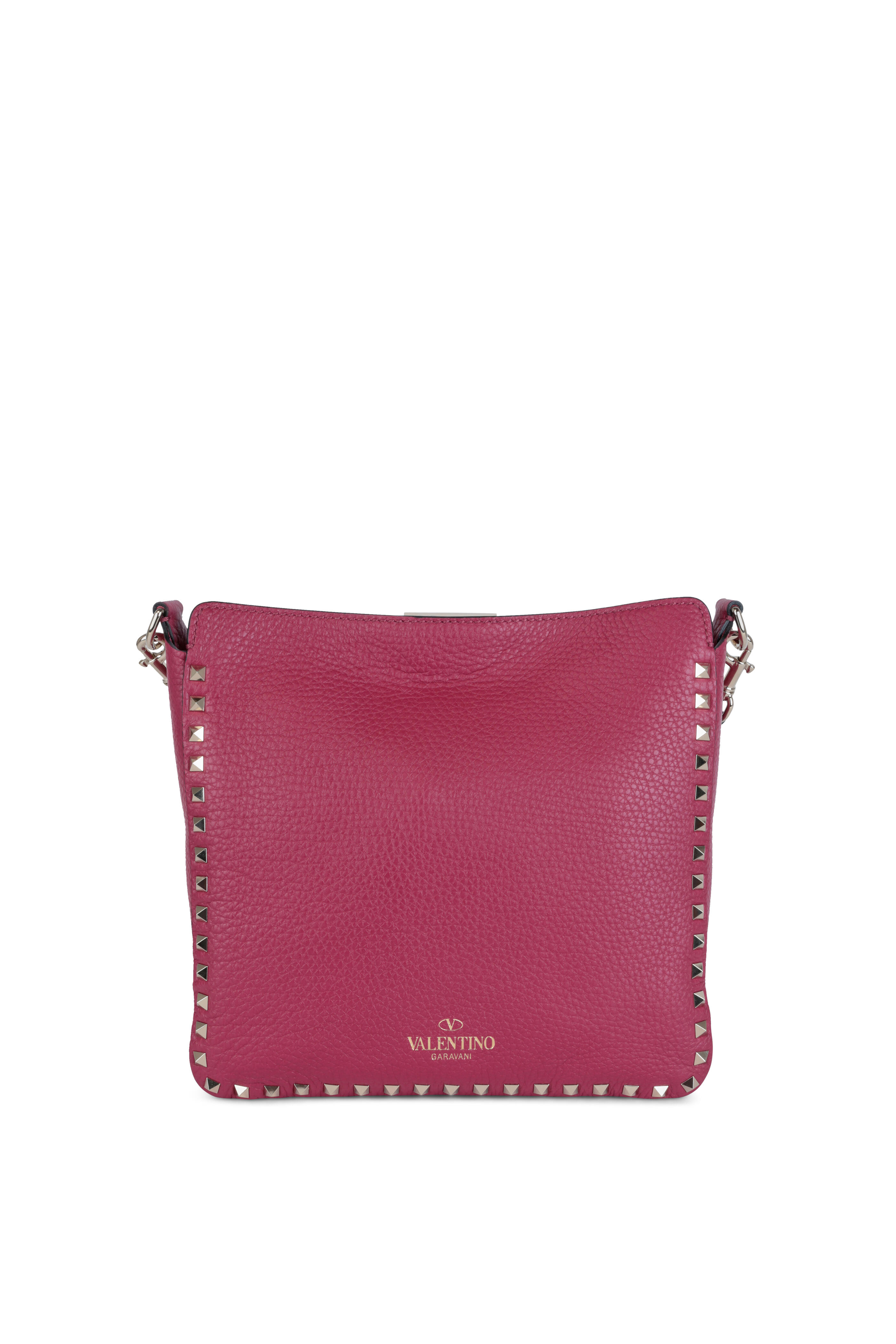 Grained calfskin leather. Adjustable flat crossbody strap. Flip-lock closure. Signature gold-toned rockstud detail. One interior zipped pocket. Lined in suede. Made in Italy. Width: 10". Height: 10". Depth: 3". Adjustable strap drop: 20".