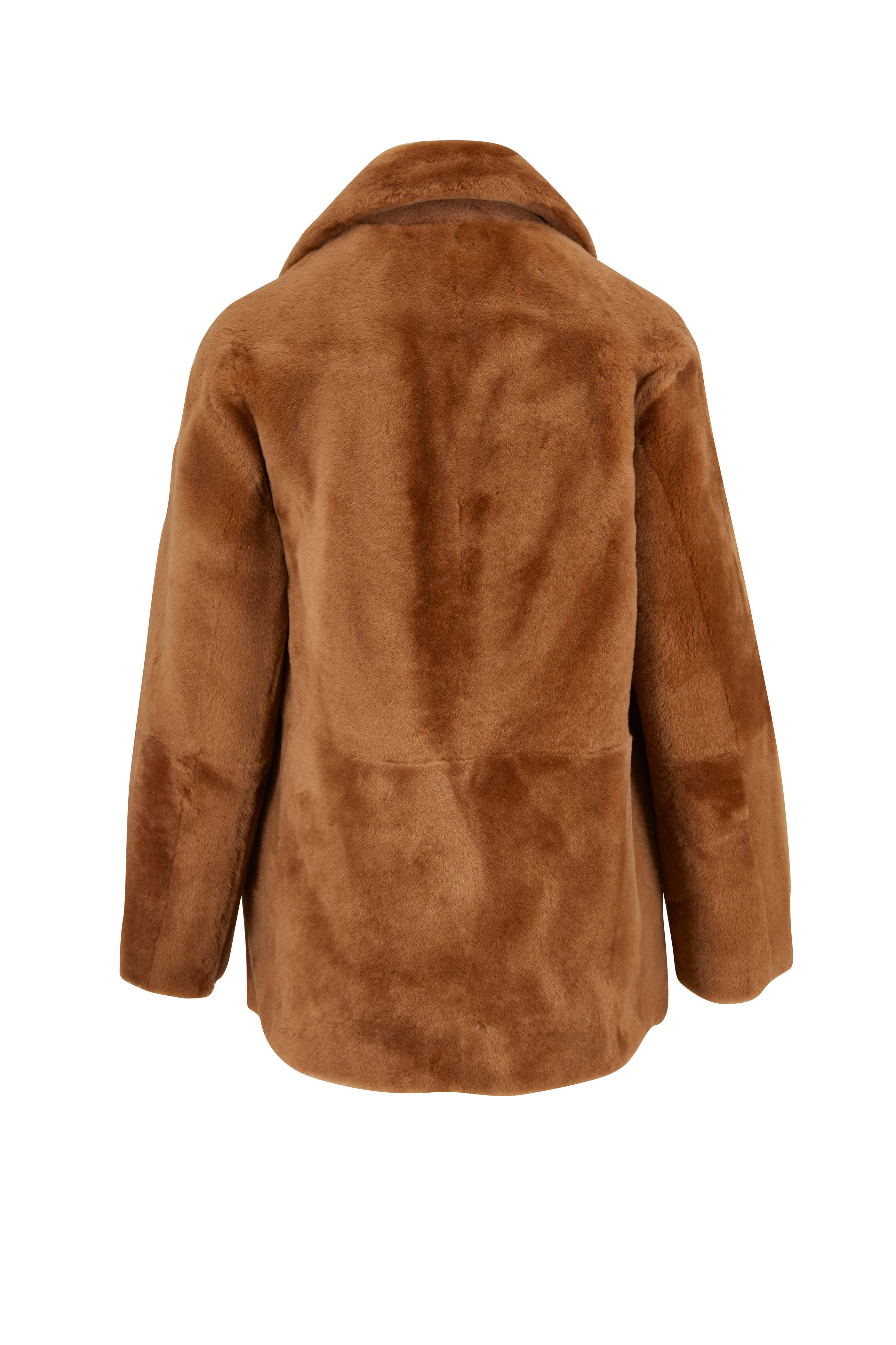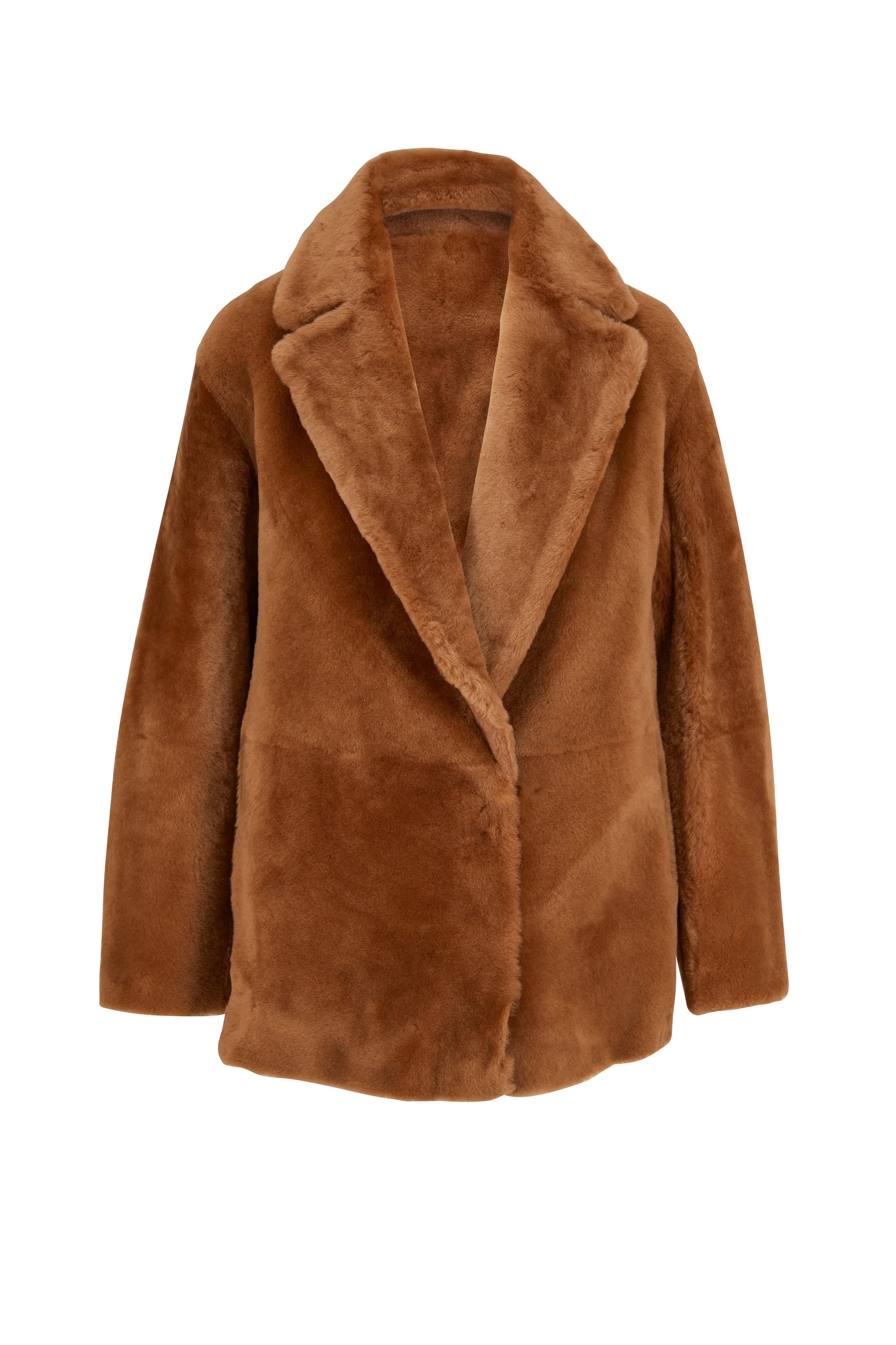 Specialist clean. Peak lapels. Concealed hook and eye closure. Side seam pockets. Imported. 100% lamb shearling; unlined.