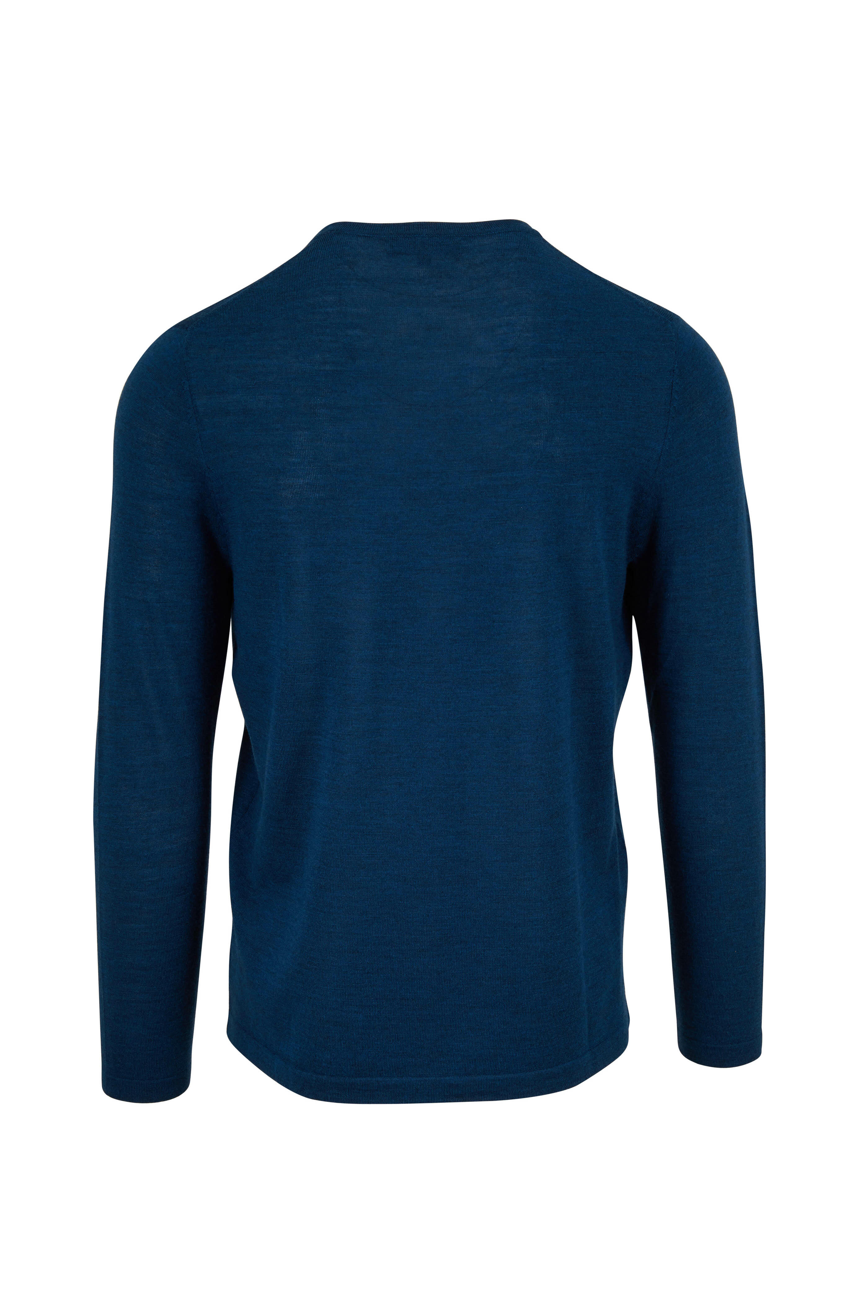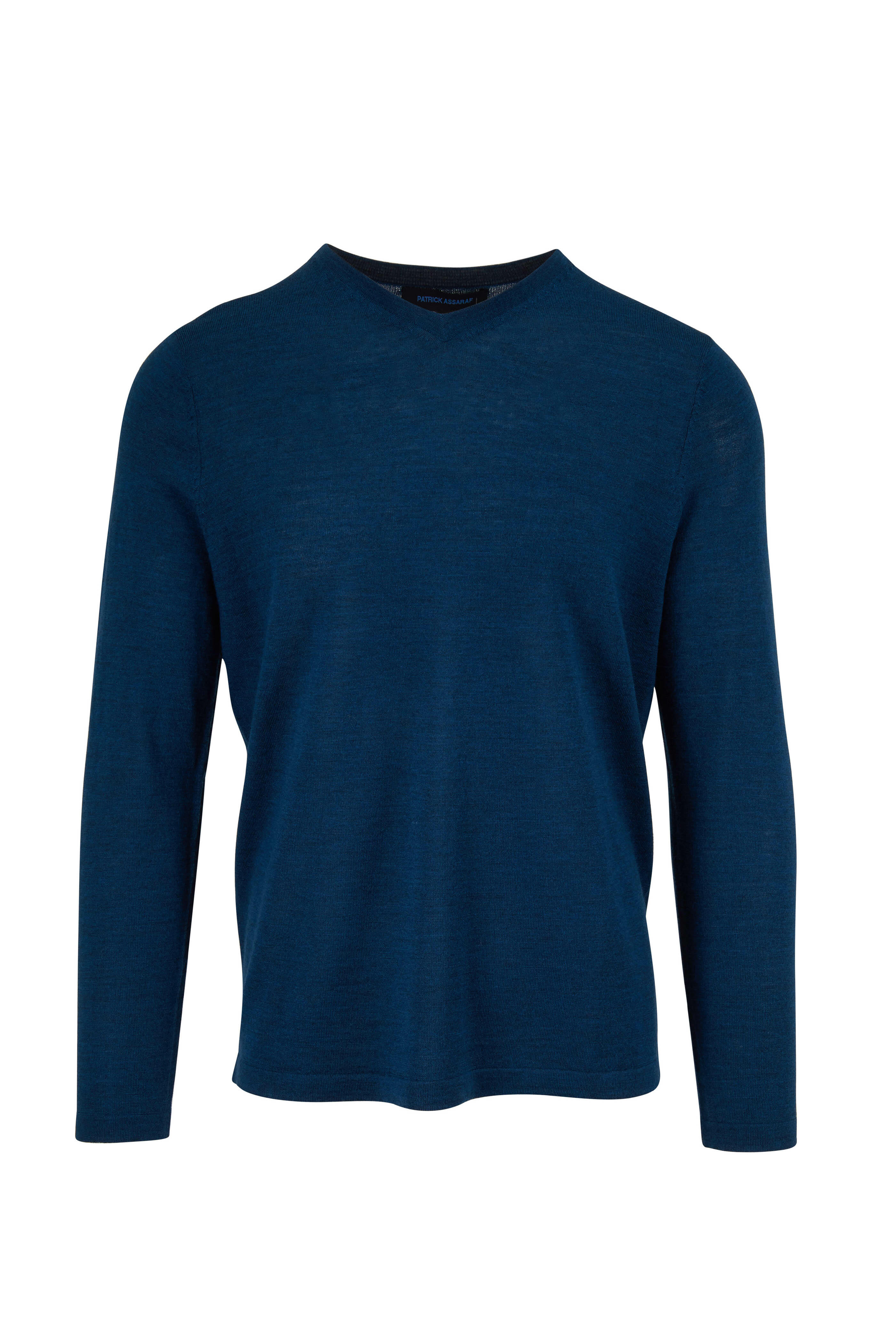V-neck. Ribbed trim. Imported. 100% extrafine merino wool. Hand wash.