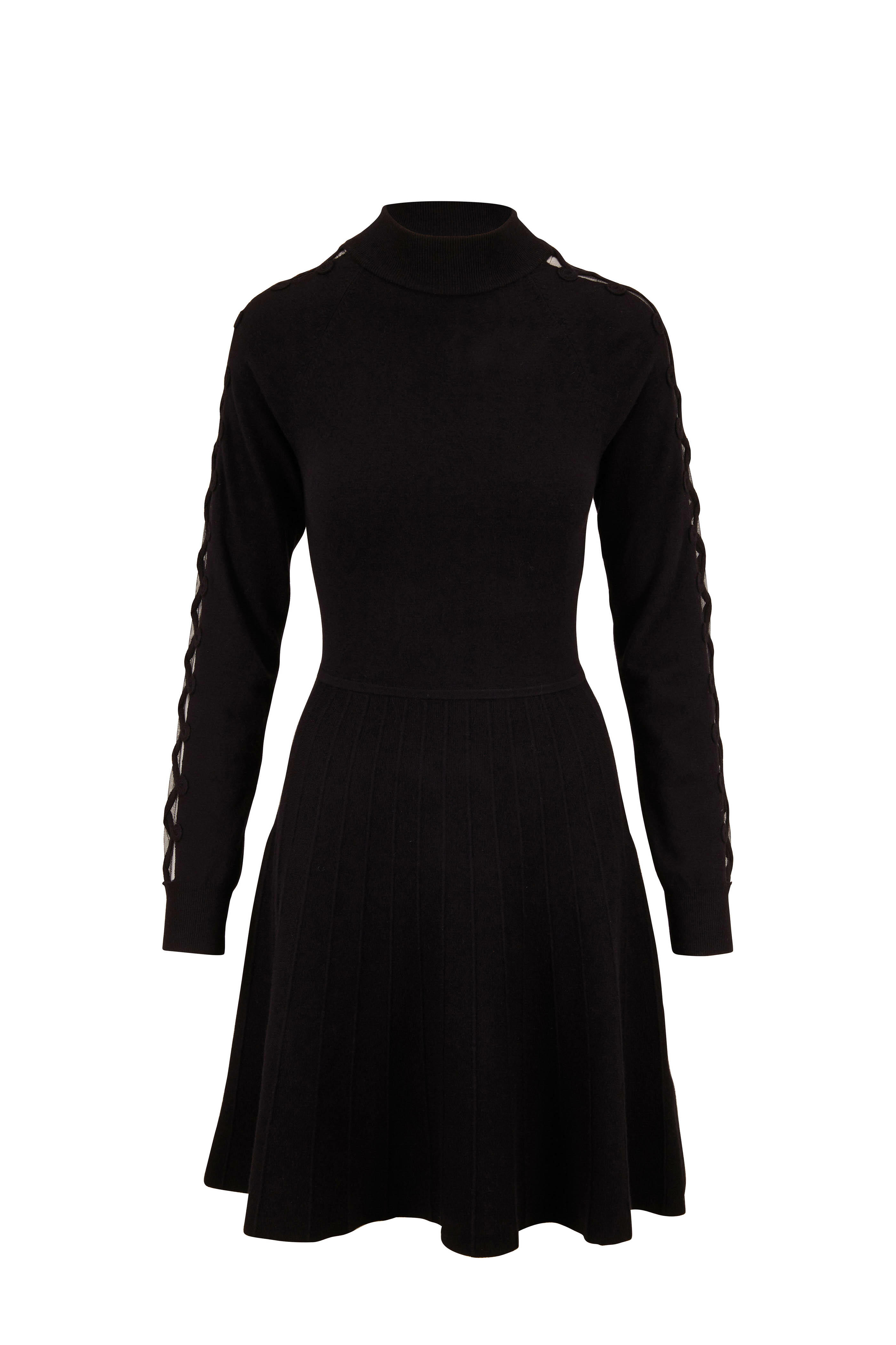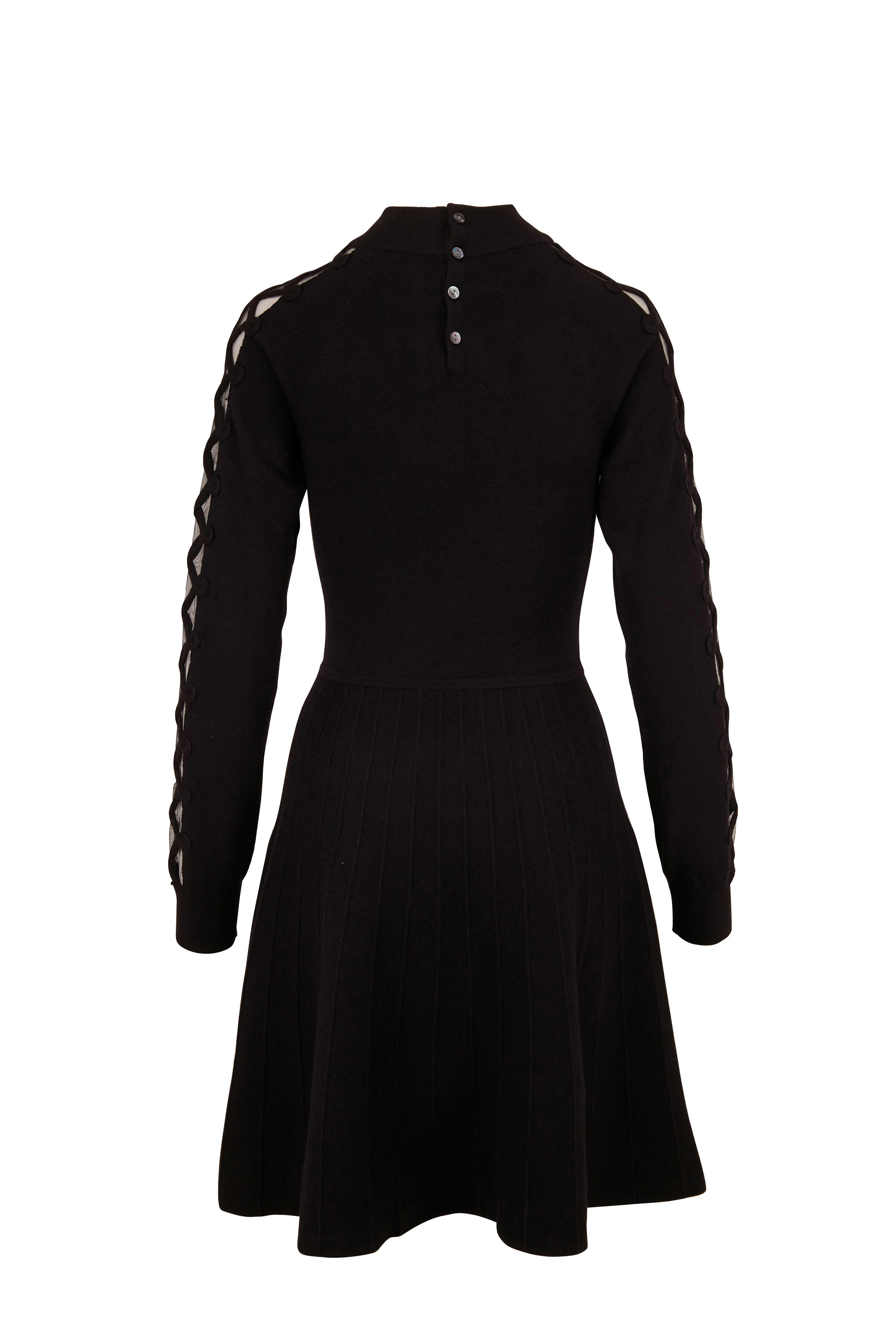 Mock neck. Back, four button closure. Sheer, long sleeves. Seamed skirt. Imported. 39" shoulder to hem. 75% wool, 25% silk. Hand wash.