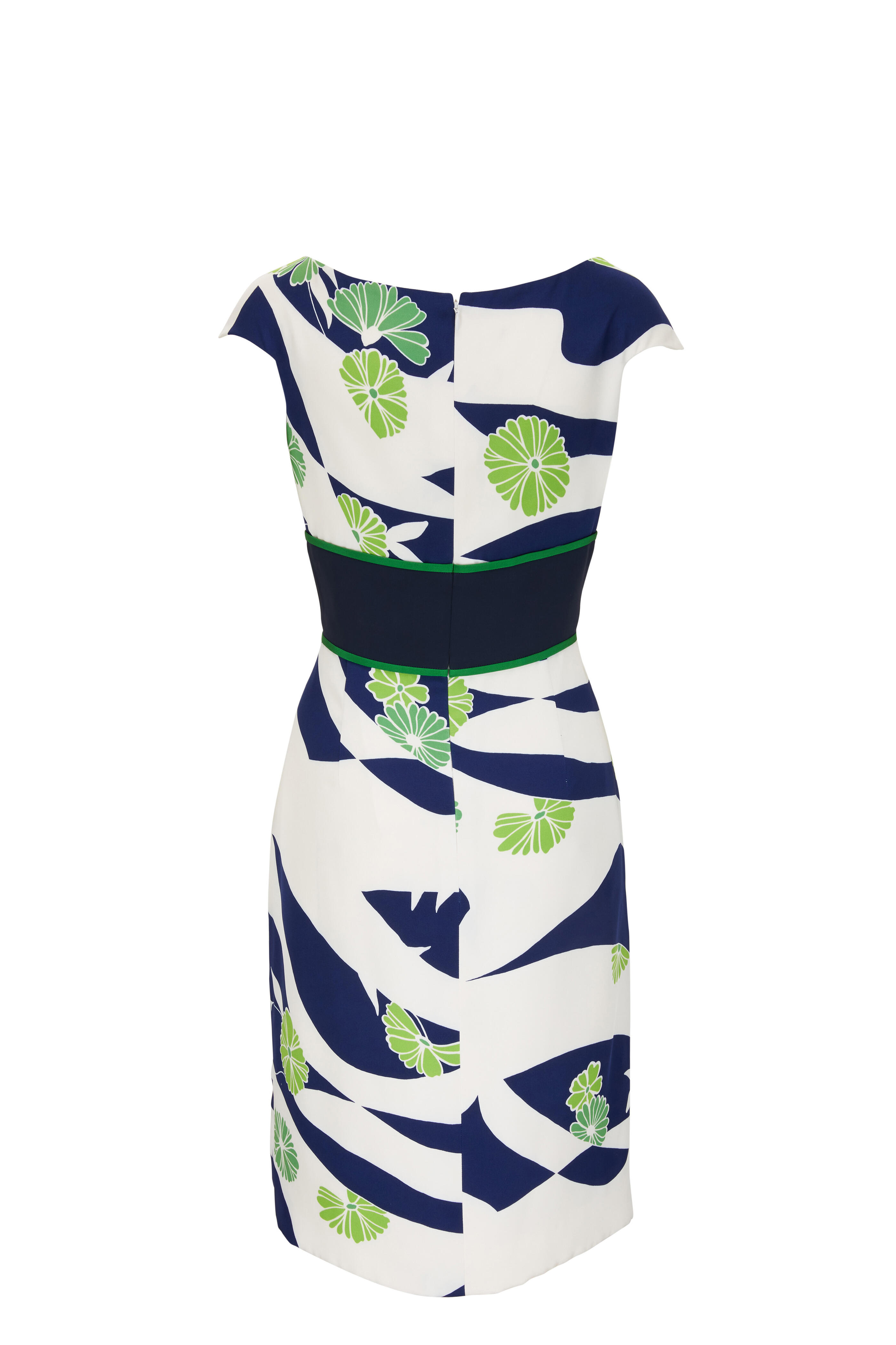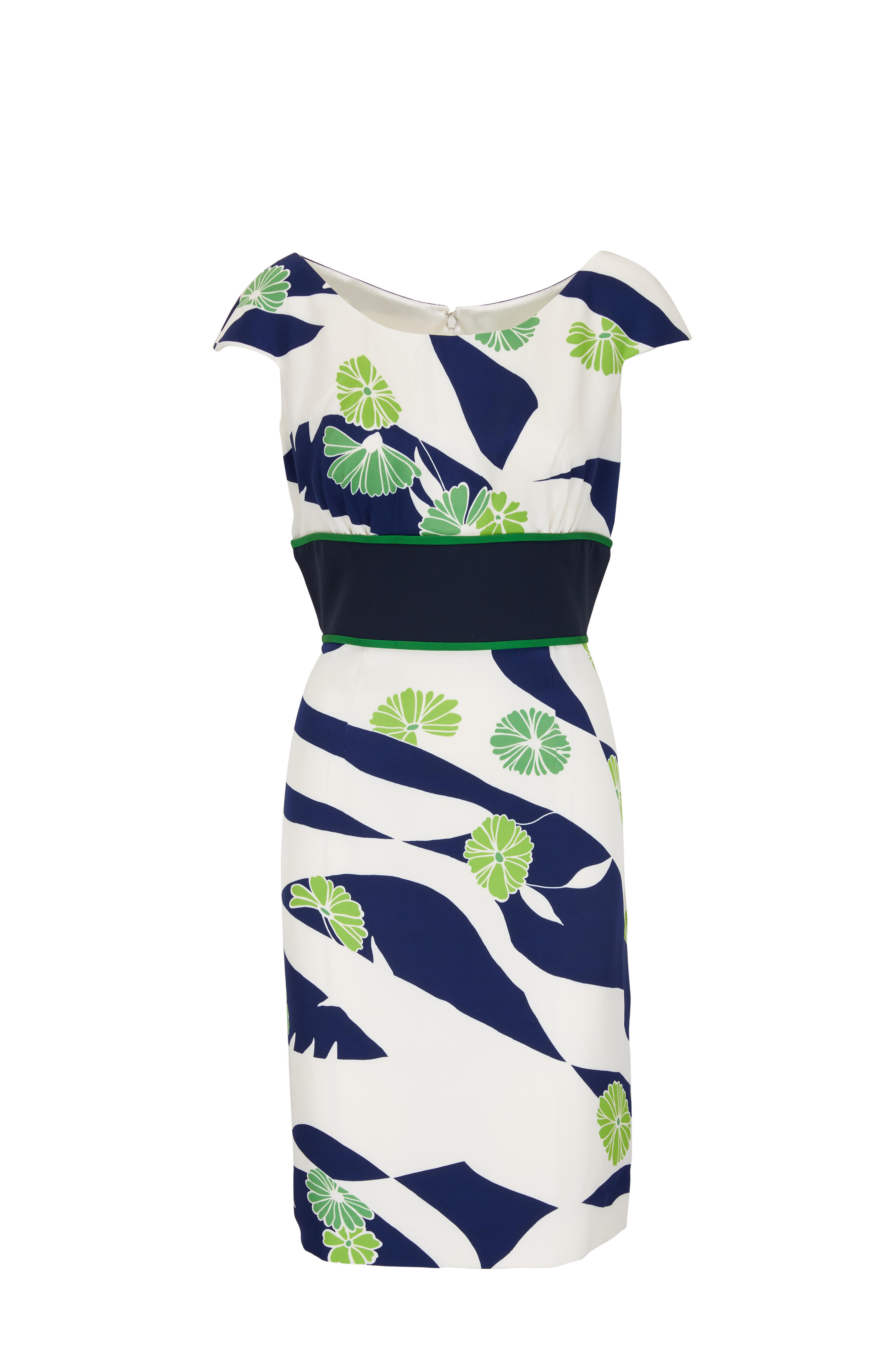 Silk; silk lining. Bateau neckline. Concealed back zip. Cap sleeves. Made in the USA. 40" shoulder to hem. Dry clean.