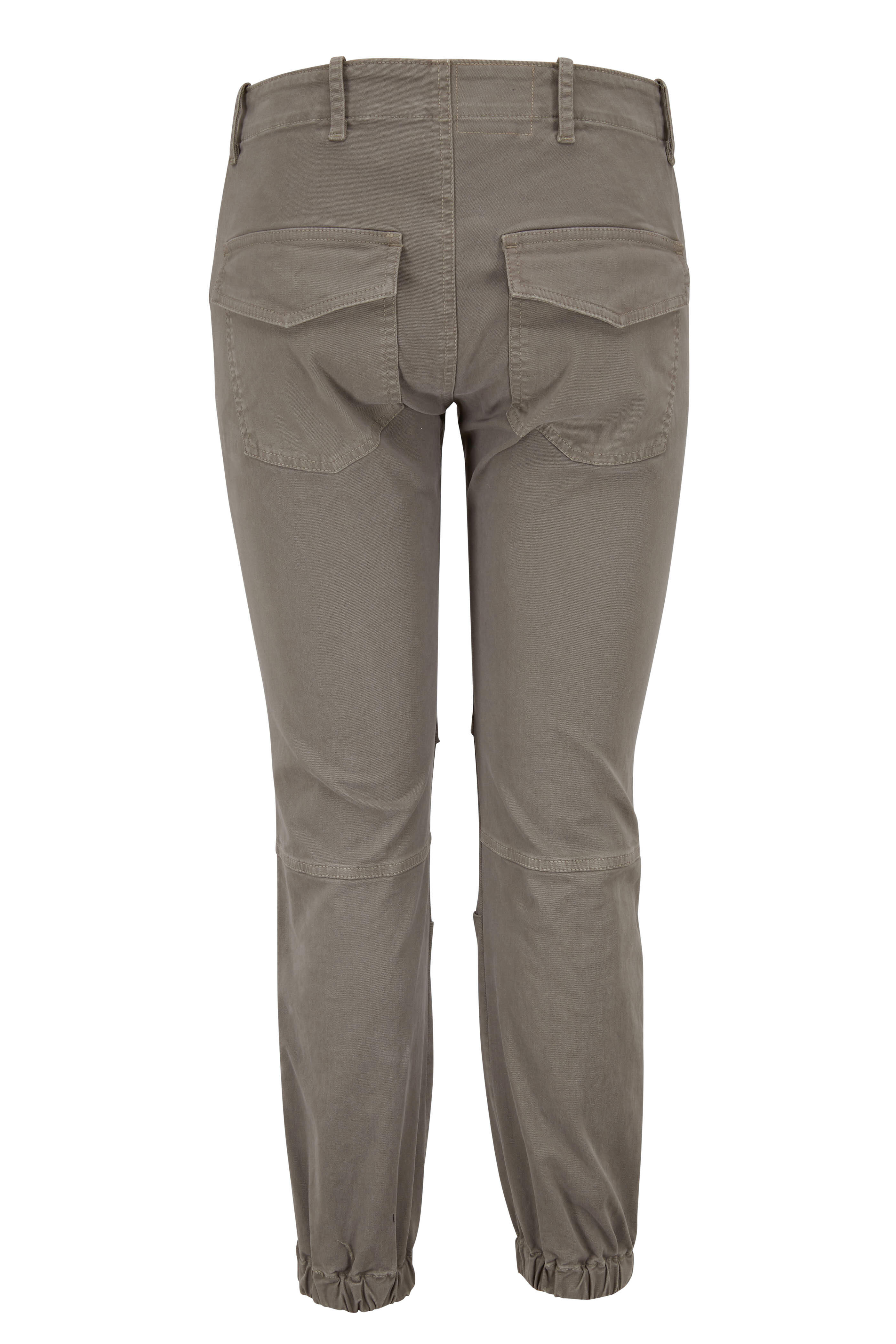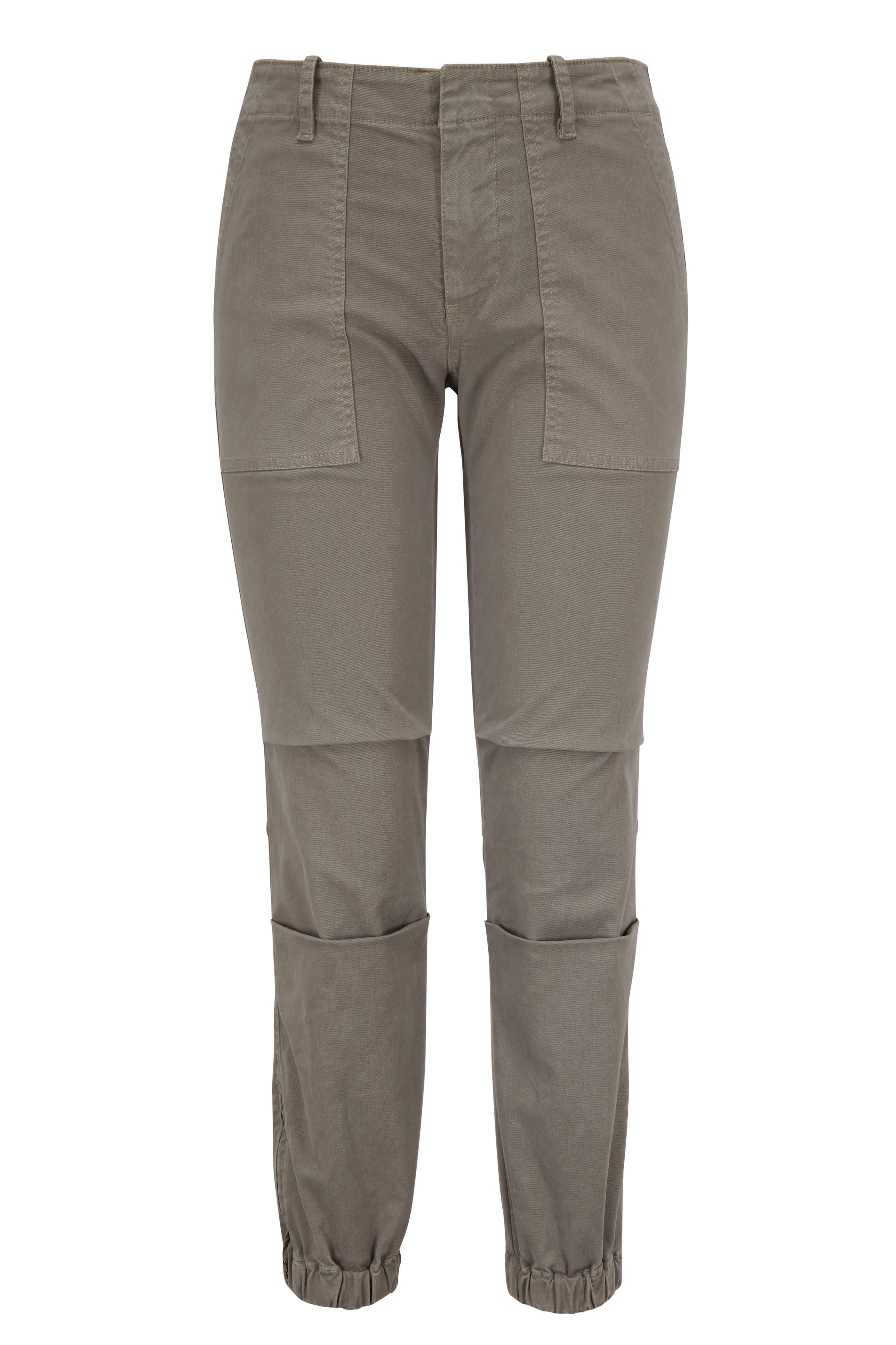 Pleating at knees. Front patch and back flap pockets. Elasticized ankle cuffs. Made in the USA. Cropped slim fit. 98% cotton, 2% elastane. Machine wash.
