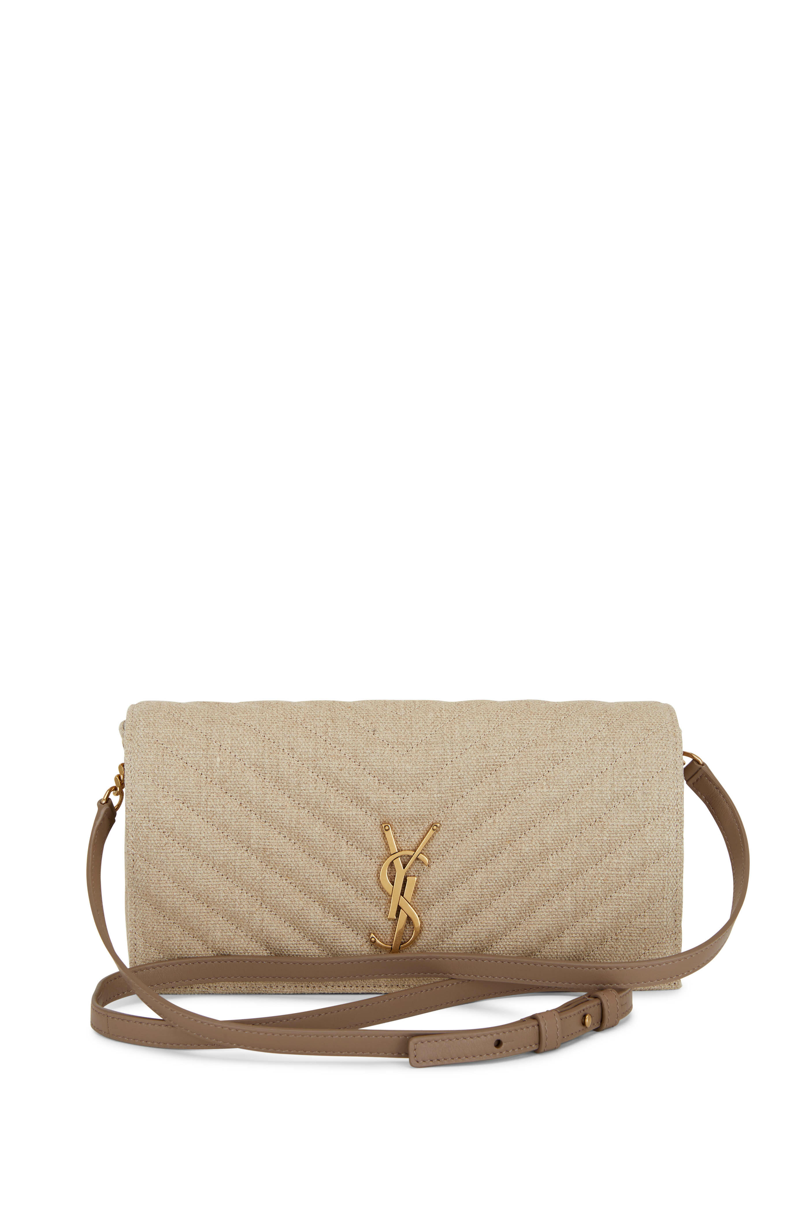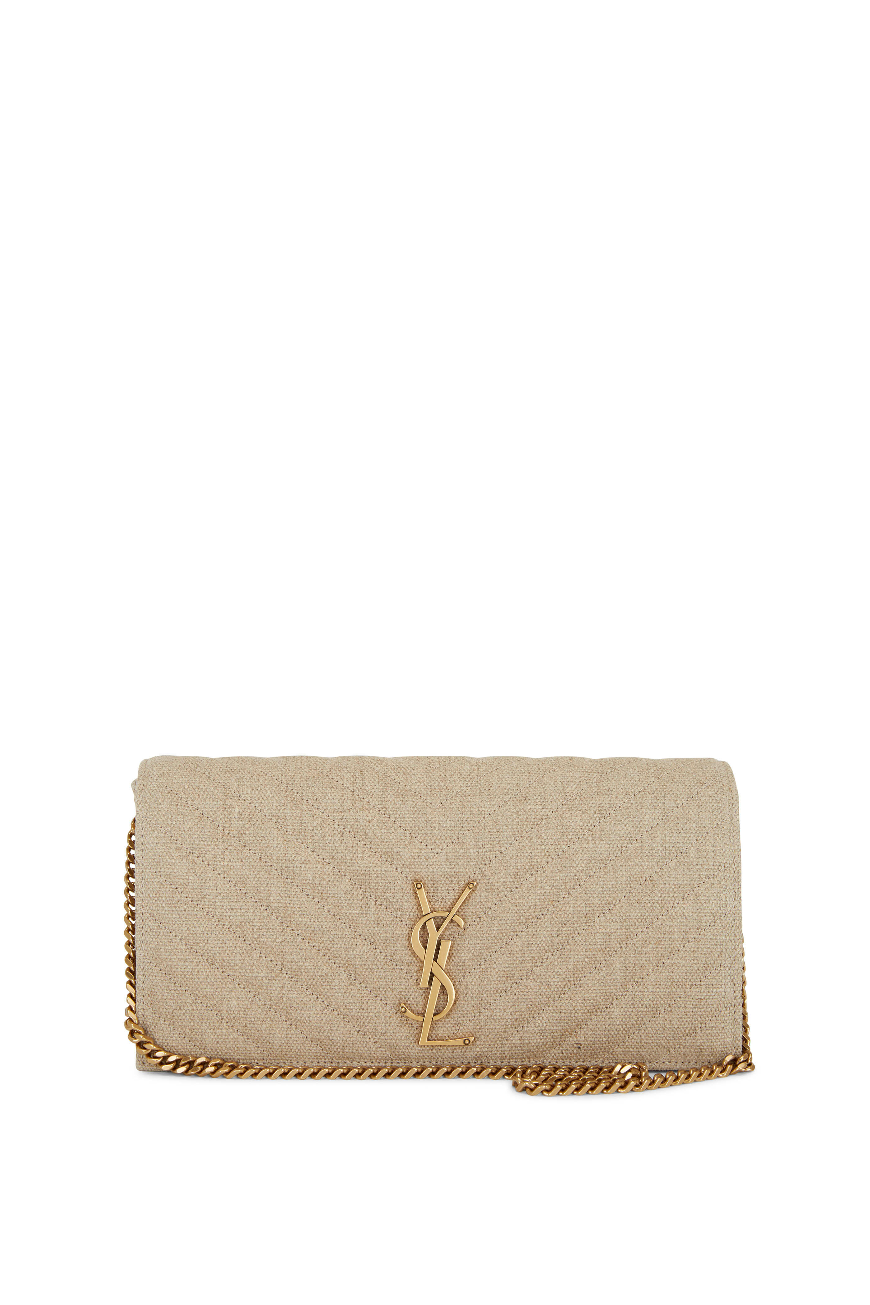 Linen. Removable bronze tone chain strap. Front flap, magnetic closure. Interior zip pocket. Bronze tone logo detail. Made in Italy. 10.2" X 5.3" X 1.7".