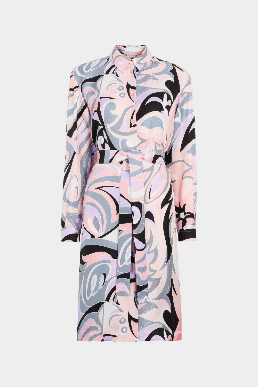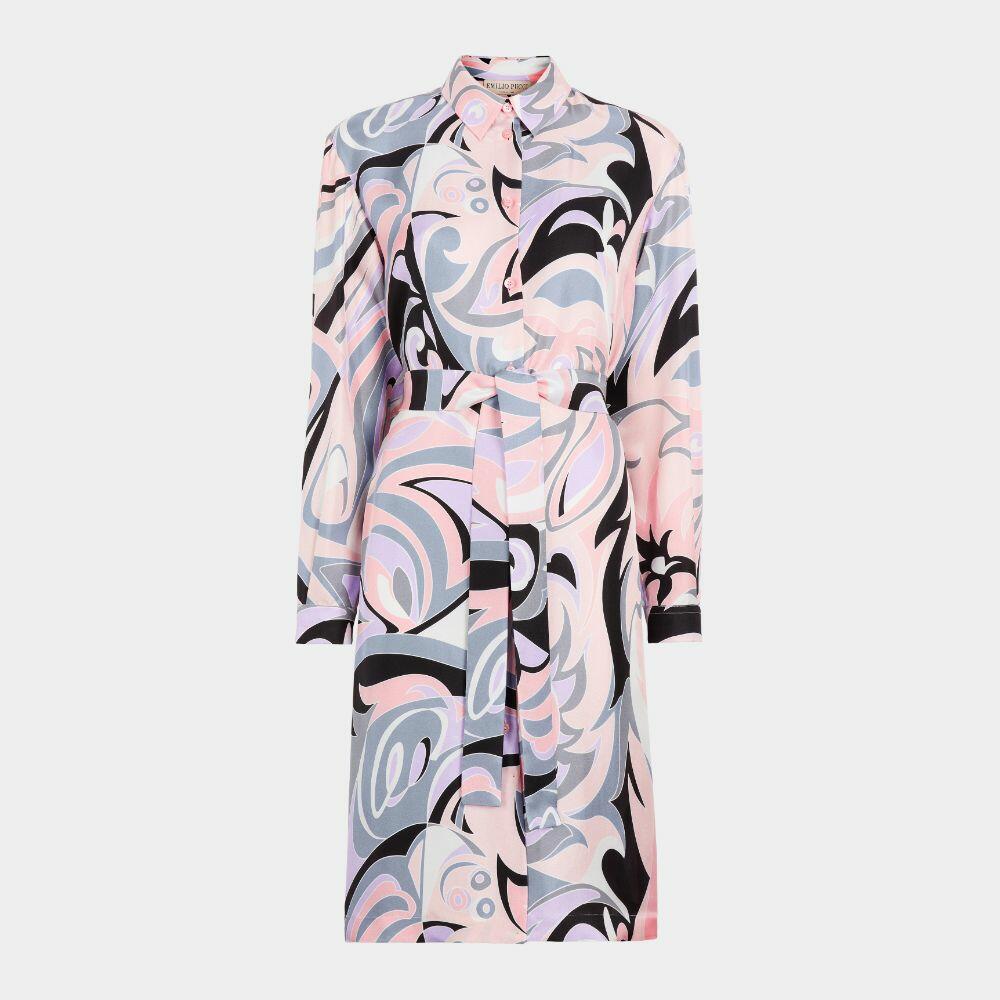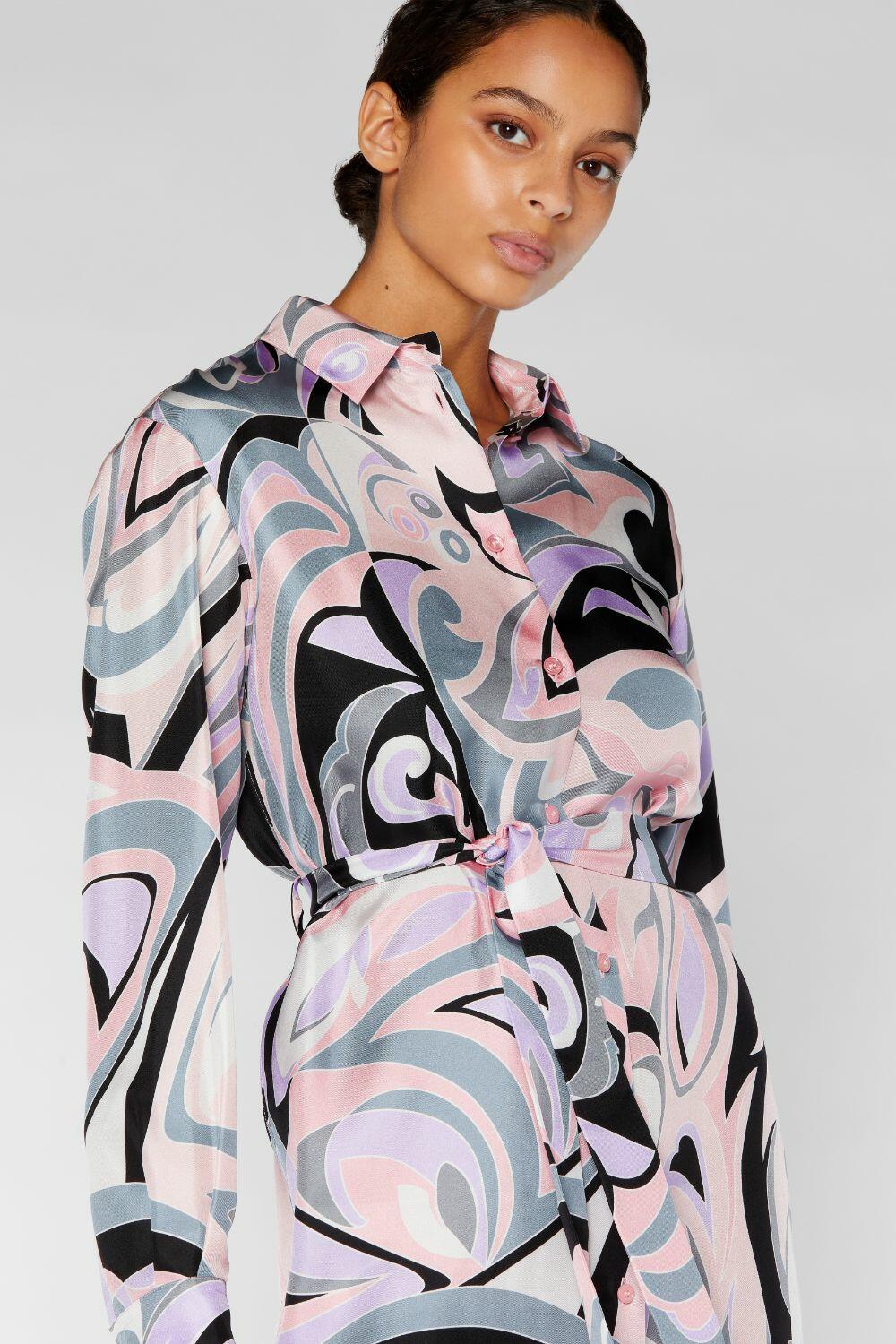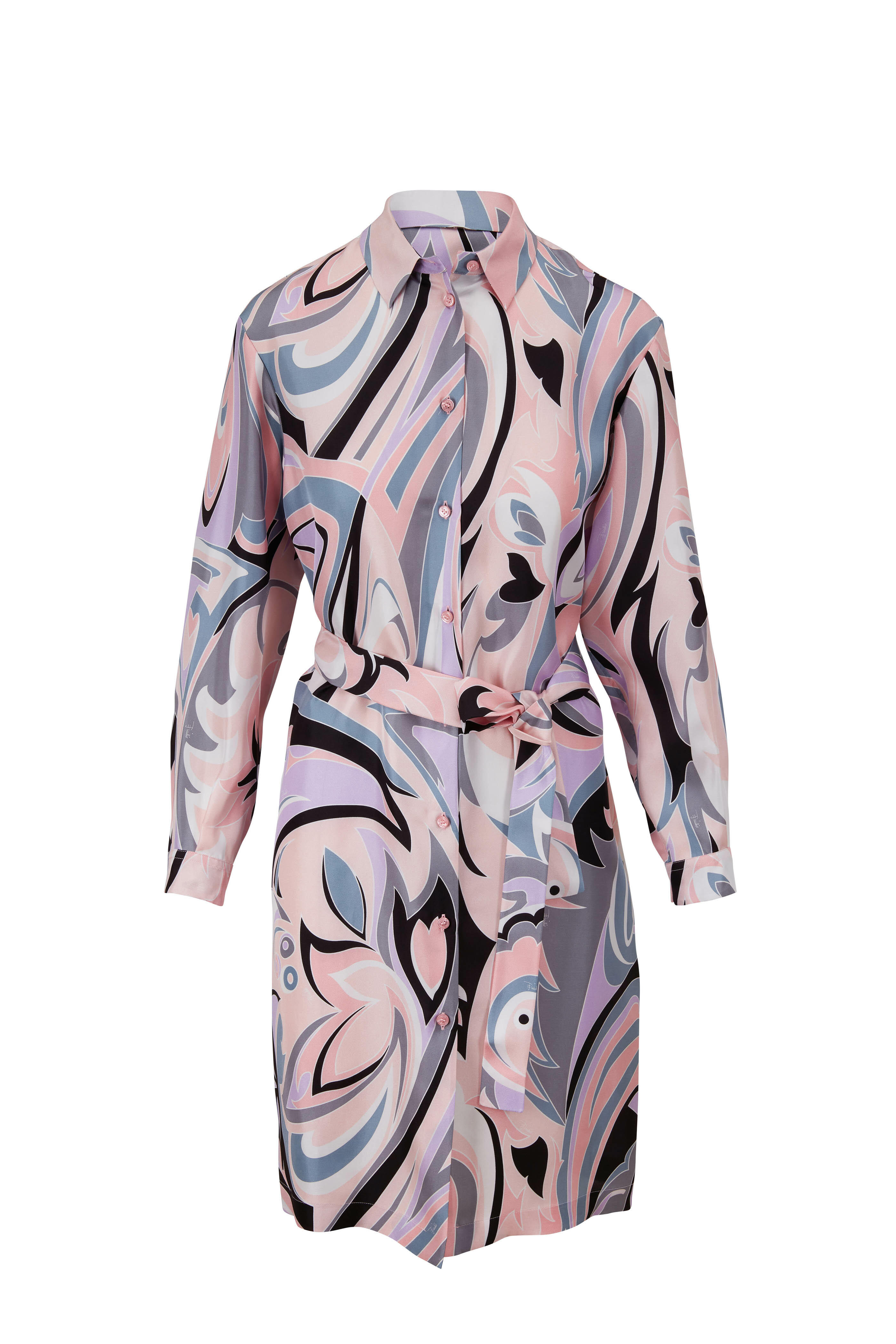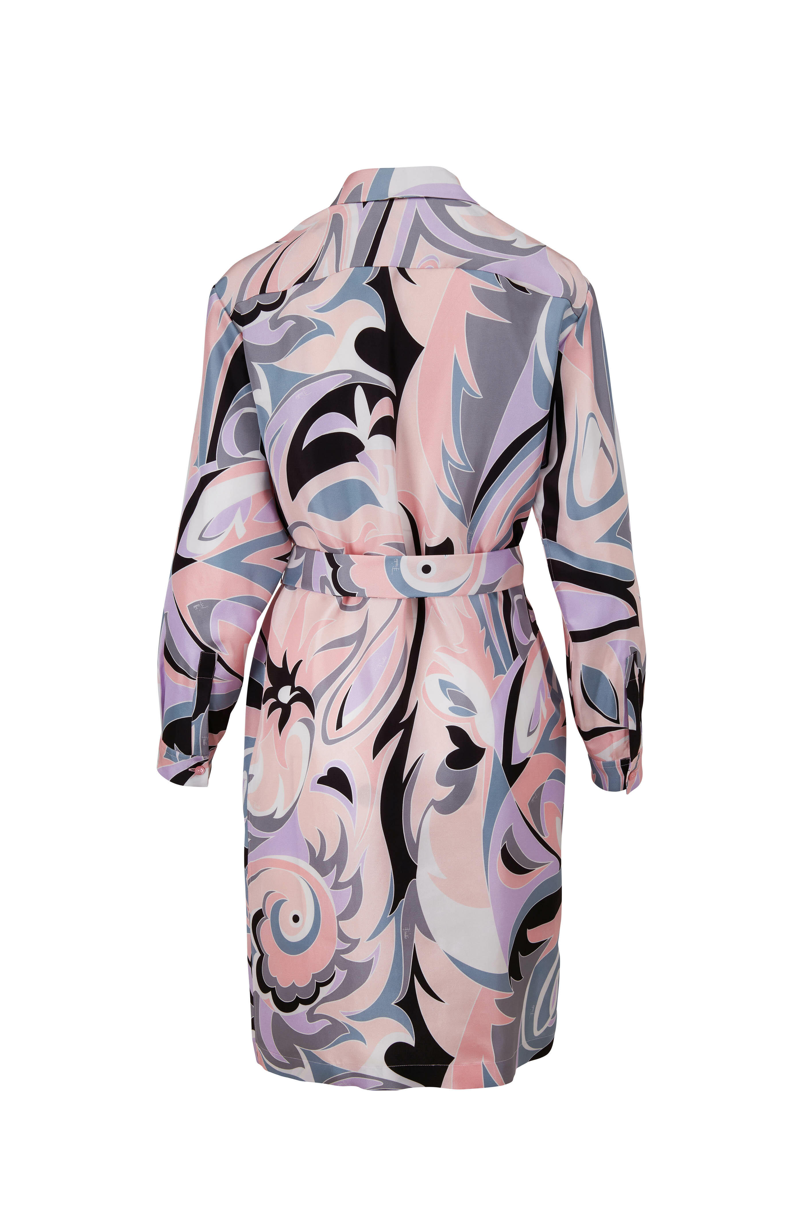 Spread collar. Front button placket. Removable self belt. Single button squared cuffs. Made in Italy. 39" shoulder to hem. 100% silk. Dry clean.